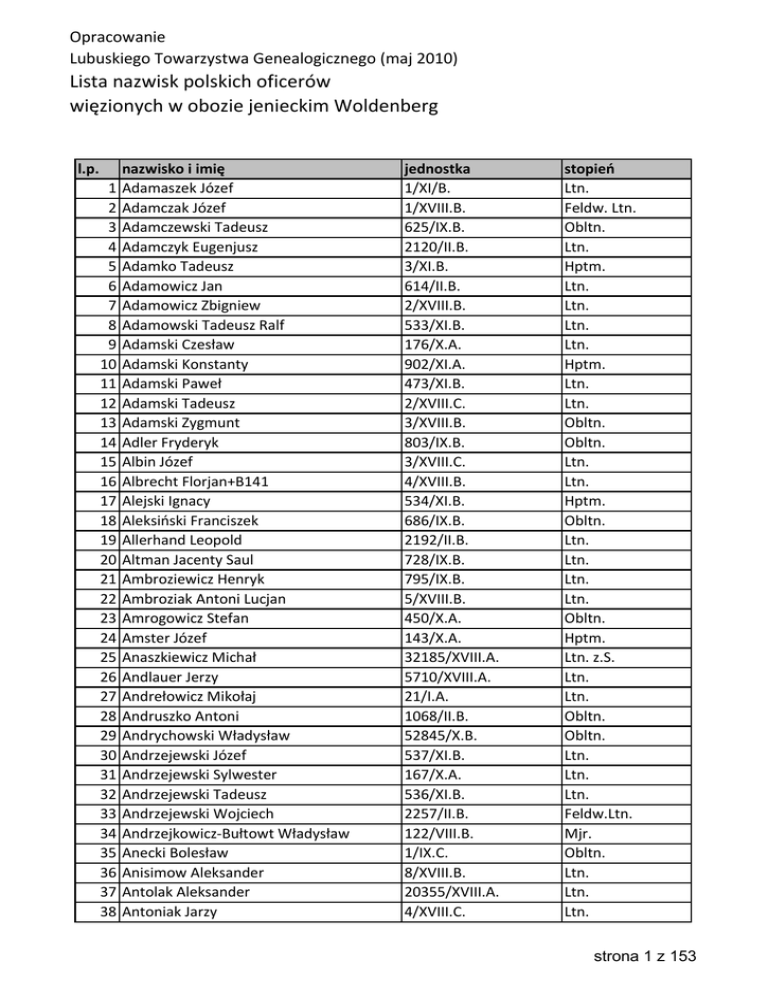 Opracowanie Lubuskiego Towarzystwa Genealogicznego (maj 2010) Lista nazwisk polskich oficerów więzionych w obozie jenieckim Woldenberg l.p. 1 2 3 4 5 6 7 8 9 10 11 12 13 14 15 16 17 18 19 20 21 22 23 24 25 26 27 28 29 30 31 32 33 34 35 36 37 38 nazwisko i imię Adamaszek Józef Adamczak Józef Adamczewski Tadeusz Adamczyk Eugenjusz Adamko Tadeusz Adamowicz Jan Adamowicz Zbigniew Adamowski Tadeusz Ralf Adamski Czesław Adamski Konstanty Adamski Paweł Adamski Tadeusz Adamski Zygmunt Adler Fryderyk Albin Józef Albrecht Florjan+B141 Alejski Ignacy Aleksiński Franciszek Allerhand Leopold Altman Jacenty Saul Ambroziewicz Henryk Ambroziak Antoni Lucjan Amrogowicz Stefan Amster Józef Anaszkiewicz Michał Andlauer Jerzy Andrełowicz Mikołaj Andruszko Antoni Andrychowski Władysław Andrzejewski Józef Andrzejewski Sylwester Andrzejewski Tadeusz Andrzejewski Wojciech Andrzejkowicz-Bułtowt Władysław Anecki Bolesław Anisimow Aleksander Antolak Aleksander Antoniak Jarzy jednostka 1/XI/B. 1/XVIII.B. 625/IX.B. 2120/II.B. 3/XI.B. 614/II.B. 2/XVIII.B. 533/XI.B. 176/X.A. 902/XI.A. 473/XI.B. 2/XVIII.C. 3/XVIII.B. 803/IX.B. 3/XVIII.C. 4/XVIII.B. 534/XI.B. 686/IX.B. 2192/II.B. 728/IX.B. 795/IX.B. 5/XVIII.B. 450/X.A. 143/X.A. 32185/XVIII.A. 5710/XVIII.A. 21/I.A. 1068/II.B. 52845/X.B. 537/XI.B. 167/X.A. 536/XI.B. 2257/II.B. 122/VIII.B. 1/IX.C. 8/XVIII.B. 20355/XVIII.A. 4/XVIII.C. stopień Ltn. Feldw. Ltn. Obltn. Ltn. Hptm. Ltn. Ltn. Ltn. Ltn. Hptm. Ltn. Ltn. Obltn. Obltn. Ltn. Ltn. Hptm. Obltn. Ltn. Ltn. Ltn. Ltn. Obltn. Hptm. Ltn. z.S. Ltn. Ltn. Obltn. Obltn. Ltn. Ltn. Ltn. Feldw.Ltn. Mjr. Obltn. Ltn. Ltn. Ltn. strona 1 z 153 Opracowanie Lubuskiego Towarzystwa Genealogicznego (maj 2010) Lista nazwisk polskich oficerów więzionych w obozie jenieckim Woldenberg 39 40 41 42 43 44 45 46 47 48 49 50 51 52 53 54 55 56 57 58 59 60 61 62 63 64 65 66 67 68 69 70 71 72 73 74 75 76 77 Antoniewski Franciszek Antoniewicz Jan Antosiewicz Marek Apoznański Jan Appel Józef Apt Izajasz Arcimowicz Henryk Arciszewski-Rola Stanisław Arendarski Roman Arens Edward Arnoldt-Russocki Julian Arszyński Marjan Aseńko Marjan Askanas Stefan Attinger Witalis Augustowski Józef Augustyn Bolesław Augustyniak Tadeusz Aulich Józef Auster Henryk Awsiukiewicz Michał Antoszewski Marjusz Babecki Bolesław Babiarz Piotr Babicki Stanisław Babisz Stanisław Babraj Karol Jan Babral Władysław Babski Władysław Babst Witold Babuchowski Stanisław Bachota Stefan Bachowski Leon Bachowski Władysław Baczyński Zenon Badek Bolesław Badowicz Kazimierz Badowski Jan Badowski Janusz 5/XVIII.C. 52682/X.B. 6/XVIII.C. 617/X.A. 32556/XIII.A. 9/XVIII.B. 11/XVIII.B. 48671/IV.A. 12/XVIII.B. 7/XVIII.C. 506/X.A. 20647/XVIII.A. 4760/XVIII.A. 48804/IV.A. 2/IX.C. 75027/X.B. 8/XVIII.B. 1703/XI.B. 4/XI.B. 9/XVIII.C. 14/XVIII.B. 52846/X.B. 538/XI.B. 524/X.A. 539/XI.B. 324/XI.B. 48942/II.B. 325/XI.B. 10/XVIII.C. 11/XVIII.C. 2157/II.B. 20530/II.B. 3/IX.C. 182/XI.A. 540/XI.B. 541/XI.B. 4/IX.C. 8117/XVIII.A. 542/XI.B. Ltn. Mjr. Ltn. Hptm. Obltn. Ltn. Ltn. Obst. Ltn. Ltn. Obstltn. Hptm. Ltn. Obltn. Obltn. Mjr. Ltn. Ltn. Hptm. Ltn. Ltn. Obltn. Mjr. Ltn. Ltn. Ltn. Hptm. Ltn. Ltn. Ltn. Ltn. Ltn. Ltn. Ltn. Obltn. Obltn. Hptm. Ltn. Hptm. strona 2 z 153 Opracowanie Lubuskiego Towarzystwa Genealogicznego (maj 2010) Lista nazwisk polskich oficerów więzionych w obozie jenieckim Woldenberg 78 79 80 81 82 83 84 85 86 87 88 89 90 91 92 93 94 95 96 97 98 99 100 101 102 103 104 105 106 107 108 109 110 111 112 113 114 115 116 Badylak Kazimierz Bagieński Edward Bagnicki Paweł Bagniewski Franciszek Baj Kazimierz Bajaskin Jakób Bajdor Bolesław Bajerowski Wacław Bajon Czesław Bak Józef Balcerzak Konstanty Balicki Tadeusz Balkowski Zygmunt Balmas Józef Balon Józef Balowski Stanisław Balwiński Jarzy Bałaban Tadeusz Bałbaszewski Henryk Bałdykowski Henryk Bałos Ludwik Bałowski Robert Bamber Franciszek Banach Eugenjusz Banach Franciszek Banach Stanisław Banach Tadeusz Banach Tadeusz Banasiak Henryk Banaszczyk Teodor Bankier Kazimierz Barakoński Paweł Baran Edmund Baran Franciszek Baran Mieczysław Baraniak Bronisław Baranowski Józef Baranowski Leon Baranowski Maksymiljan 15/XVIII.B. 19167/XVIII.A. 5/IX.C. 543/XI.B. 1025/II.B. 544/XI.B. 2071/II.B. 545/XI.B. 2293/II.B. 546/XI.B. 850/II.B. 12/XVIII,C, 49215/IV.A. 19188/XVIII.A. 75070/X.B. 138/XI.B. 4782/XVIII.A. 75028/X.B. 613/II.A. 52847/X.B. 140/XI.B. 8/XI.B. 662/IX.B. 28/X.A. 139/XI.B. 1941/II.B. 75029/X.B. 714/XI.A. 14/XVIII.A. 17/XVIII.B. 18/XVIII.B. 752/IX.B. 550/XI.B. 26/VII.C. 52848/X.B. 19/XVIII.B. 7/IX.C. 20/XVIII.B. 1874/II.B. Ltn. Obstltn. Ltn. Ltn. Ltn. Ltn. Ltn. Ltn. Ltn. Obltn. Ltn. Ltn. Hptm. Feldw.Ltn. Ltn. Ltn. Ltn. Mjr. Ltn. Obltn. Mjr. Hptm. Hptm. Ltn. Ltn. Hptm. Mjr. Ltn. Ltn. Ltn. Obltn. Ltn. Ltn. Hptm. Obltn. Feldw.Ltn. Hptm. Ltn. Ltn. strona 3 z 153 Opracowanie Lubuskiego Towarzystwa Genealogicznego (maj 2010) Lista nazwisk polskich oficerów więzionych w obozie jenieckim Woldenberg 117 118 119 120 121 122 123 124 125 126 127 128 129 130 131 132 133 134 135 136 137 138 139 140 141 142 143 144 145 146 147 148 149 150 151 152 153 154 155 Baranowski Zygmunt Barański Bolesław Barański Stefan Barański Zbigniew Baras Zygmunt Barczak Albin Barczuk Witold Barga Wacław Bargiel Kazimierz Bargielski Edward Barlik Tadeusz Barłog Henryk Barszczewicz Kazimierz Bartkiewicz Roman Bartkowiak Władysław Bartkowski Stanisław Bartman Juljan Bartman Otmar Bartnicki Juljan Bartnik Wiesław Bartnik Wojciech Bartosik Stanisław Bartoszek Józef Bartoszewicz Aleksander Bartoszewicz Kazimierz Bartoszewicz Leonard Bartoszewicz Norbert Bartoszewicz Paweł Bartoszewski Tadeusz Bartoszyński Kazimierz Basiewicz Henryk Basiński Wacław Baskiewicz Feliks Battek Czesław Bazielich Kazimierz Bączkowski Kazimierz Bączyński Alfons Bądarski Jan Bąk Zygmunt 552/XI.B. 722/II.B. 1942/II.B. 553/XI.B. 1184/X.A. 556/XI.B. 601/XI.A. 1750/XI.B. 8120/XVIII.A. 22/XVIII.B. 15/XVIII.A. 258/X.A. 341/X.A. 24/XVIII.B. 414/