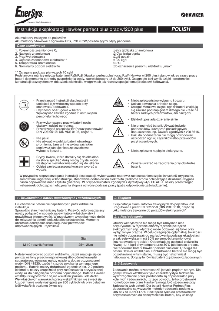 Instrukcja eksploatacji Hawker perfect plus oraz wf200 plus POLISH Akumulatory trakcyjne do pojazdów Akumulatory ołowiowe z ogniwami PzS, PzB i PzW posiadającymi płyty pancerne Dane znamionowe 1. Pojemność znamionowa C5 2. Napięcie znamionowe 3. Prąd wyładowania 4. Gęstość znamionowa elektrolitu** 5. Temperatura znamionowa 6. Nominalny poziom elektrolitu :patrz tabliczka znamionowa :2,0Vx liczba ogniw :C5/5 godzin :1,29 kg/l :30°C :do oznaczenia poziomu elektrolitu „max” ** Osiągana podczas pierwszych 10 cykli Podstawową różnicę między bateriami PzS/PzB (Hawker perfect plus) oraz PzW (Hawker wf200 plus) stanowi okres czasu pracy baterii do momentu potrzeby uzupełnienia wody, zaprojektowany aż do 200 cykli. Osiągnięto taki wynik dzięki nowatorskiej konstrukcji oraz systemowi mieszania elektrolitu w ogniwach jak również specjalnemu procesowi ładowania. • Przestrzegać instrukcji eksploatacji i umieścić ją w widoczny sposób przy stanowisku ładowania. • Czynności obsługowe w baterii Wykonywać zawsze zgodnie z instrukcjami personelu fachowego • Niebezpieczeństwo wybuchu i pożaru. • Unikać powstania krótkich spięć. • Uwaga! Metalowe części ogniw baterii znajdują się zawsze pod napięciem dlatego nie kłaść na baterii żadnych przedmiotów, ani narzędzi. • Elektrolit posiada działanie silnie • Przy wykonywaniu prac w baterii nosić okulary i odzież ochronną. • Przestrzegać przepisów BHP oraz postanowień DIN VDE 0510 i DIN VDE 0105, część 1. • Nie paÍić • Nie używać w pobliżu baterii otwartego płomienia, żaru ani nie wytwarzać iskier, ponieważ istnieje niebezpieczeństwo wybuchu i pożaru. • Bryzgi kwasu, które dostały się do oka albo na skórę spłukać dużą ilością czystej wody. Następnie niezwłocznie udać się do lekarza. • Odzież zanieczyszczona kwasem wyprać w wodzie. żrące. • Nie przechylać baterii. Używać jedynie podnośników i urządzeń posiadających dopuszczenie, np. zawiesi zgodnych z VDI 3616. • Haki do podnoszenia nie mogą powodować uszkodzeń ogniw, łączników albo przewodów przyłączeniowych. • Niebezpieczne napięcie elektryczne. • Zawsze uważać na zagrożenia przy obsłudze baterii. W przypadku nieprzestrzegania instrukcji eksploatacji, wykonywania napraw z zastosowaniem części innych niż oryginalne, samowolnej ingerencji w konstrukcje, stosowania dodatków do elektrolitu (rzekome środki polepszające działanie) wygasa nasza odpowiedzialność z tytułu gwarancji. W przypadku baterii zgodnych z dyrektywą 94/9 EC ATEX należy przestrzegać wskazówek dotyczących utrzymania stopnia ochrony podczas pracy (patrz odpowiednie zaświadczenie). 1. Uruchamianie baterii napełnionych i naładowanych. Uruchamianie baterii nie napełnionych patrz oddzielna instrukcja. Sprawdzić stan mechaniczny baterii. Przewód odprowadzający należy połączyć w sposób zapewniający właściwy styk i prawidłową biegunowość. W przeciwnym wypadku może dojść do zniszczenia baterii, pojazdu albo prostownika. Momenty obrotowe dokręcania śrub biegunów przewodów odprowadzających i łączników. Stal M 10 łacznik Perfect 25+ 2Nm Należy kontrolować poziom elektrolitu. Jeżeli znajduje się on poniżej osłony przeciwrozpryskowej albo górnej krawędzi separatorów, wówczas należy najpierw dodać oczyszczonej wody (DIN 43530, część 4), aż do uzyskania wymaganego poziomu. Baterie należy doładować zgodnie z pkt. 2.2 poziom elektrolitu należy uzupełniać przy zastosowaniu oczyszczonej wody, aż do osiągnięcia poziomu nominalnego. Baterie Hawker wf200plus wyposażone są we wskaŔnik poziomu elektrolitu. We właściwych warunkach pracy wskaŔnik ten nie świeci się. Uzupełnianie wody następuje po 200 cyklach lub przy ostatnim jeśli wskaŔnik poziomu świeci się. 2.Eksploat Eksploatacja akumulatorów trakcyjnych do pojazdów jest uregulowana przez EN 502723 (DIN VDE 0510, część 3). „Akumulatory trakcyjne do pojazdów elektrycznych”. 2.1 Rozładowanie Otwory wentylacyjne nie mogą być zamykane albo przykrywane. Włączanie albo wyłączanie połączeń elektrycznych (np. wtyczek) może odbywać się tylko przy wyłączonym prądzie. W celu osiągnięcia optymalnej trwałości nie należy dopuszczać do rozładowania podczas eksploatacji w zakresie większym niż 80% pojemności znamionowej (rozładowanie głębokie). Odpowiada to gęstości elektrolitu równej 1,14 kg/l przy temperaturze 30°C pod koniec procesu rozładowania baterii Hawker perfect plus oraz 1,15 kg/l dla baterii Hawker wf200 plus. Rozładowane baterie nie mogą być pozostawione w tym stanie, muszą być natychmiast naladowane. Dotyczy to również baterii częściowo rozładowanych. 2.2 £adowanie £adowanie można przeprowadzić jedynie prądem stałym. Dla gamy Hawker wf200plus tylko charakterystyki ładowania wyszczególnione przez producenta są dopuszczalne przy kolejnych ładowaniach, ; z tego powodu, tylko prostowniki homologowane przez Hawker’a mogą być stosowane przy ładowaniu tych baterii. Dla baterii Hawker Perfect Plus dopuszczalne są wszystkie metody ładowania podane w DIN 41773 i DIN 41774. Podłączać tylko do prostowników przystosowanych do danej wielkości baterii, aby uniknąć przeciążeń przewodów elektrycznych i styków, niedopuszczal nego gazowania i wypływania elektrolitu z ogniw. W obszarze gazowania nie wolno przekraczać prądów granicznych, zgod nie z EN 502723. Jeżeli prostownik nie został zakupiony razem z baterią, wówczas celowe jest zlecenie serwisowi pro ducenta sprawdzenie przydatności prostownika. Podczas ładowania trzeba dbać o właściwe odprowadzenie powsta jących gazów. Baterie PzW (wf200plus) są bateriami o niskiej emisji gazów, więc niektóre gazy wydzielane przy ładowaniu baterii wydzielane są w ograniczonych ilościach. Należy otwor zyć albo zdjąć pokrywę skrzyni lub osłony komory, w której zamonto