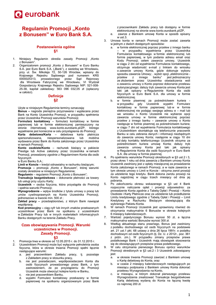 Regulamin Promocji „Konto z Bonusem” w Euro Bank S.A. 3. Postanowienia ogólne §1 1. 2. Niniejszy Regulamin określa zasady Promocji „Konto z Bonusem”. Organizatorem promocji „Konto z Bonusem” w Euro Banku S.A. jest Euro Bank S.A. („Bank”), z siedzibą we Wrocławiu, przy ul. Św. Mikołaja 72, 50-126 Wrocław, wpisany do Krajowego Rejestru Sądowego pod numerem KRS 0000025313, prowadzonego przez Sąd Rejonowy dla Wrocławia Fabrycznej we Wrocławiu, VI Wydział Gospodarczy Krajowego Rejestru Sądowego NIP: 521-00825-38, kapitał zakładowy: 563 096 032,05 zł (opłacony w całości). Definicje §2 Użyte w niniejszym Regulaminie terminy oznaczają: Bonus – nagroda pieniężna przyznawana i wypłacana przez Bank na Konto Uczestnika Promocji, w przypadku spełnienia przez Uczestnika Promocji warunków Promocji; Formularz kontaktowy – formularz kontaktowy w formie papierowej lub w formie elektronicznej zamieszczony na stronie internetowej www.konto.eurobank.pl/ZP, którego wypełnienie jest konieczne w celu przystąpienia do Promocji; Karta debetowa/Karta – debetowa karta płatnicza spersonalizowana, niespersonalizowana lub mobilna wydawana przez Bank do Konta założonego przez Uczestnika w ramach Promocji; Konto osobiste/Konto – rachunek bieżący w pakiecie Prestige lub Active założony przez Uczestnika w ramach Promocji, prowadzony zgodnie z Regulaminem Konta dla osób fizycznych w Euro Banku S.A.; Limit w Koncie – kredyt odnawialny w rachunku bieżącym; Promocja – promocja „Konto z Bonusem”, której warunki zostały określone w niniejszym Regulaminie; Regulamin – regulamin Promocji „Konto z Bonusem”; Transakcja bezgotówkowa – dokonanie płatności za towary lub usługi przy użyciu Karty; Uczestnik – osoba fizyczna, która przystąpiła do Promocji i spełnia warunki Promocji; Wynagrodzenie – wpływ środków z tytułu umowy o pracę lub umów cywilnoprawnych na Konto Uczestnika Promocji, jednorazowo w kwocie min. 500 zł ; Zakład pracy – przedsiębiorstwo, z którym Bank nawiązał współpracę. Kod promocyjny – ciąg cyfr lub innych znaków przekazanych uczestnikowi przez Bank na spotkaniu z uczestnikami w Zakładzie Pracy lub w innych materiałach informacyjnych Banku dostępnych na terenie Zakładu Pracy. Czas obowiązywania Promocji. Warunki uczestnictwa w Promocji. Zasady Promocji. §3 1. 2. Promocja trwa w okresie od 12.05.2015 r. do 31.12.2015 r. Uczestnikiem Promocji może być wyłącznie pełnoletnia osoba fizyczna, która w okresie trwania Promocji spełni łącznie następujące warunki: a. jest pracownikiem Zakładu pracy, tj. pozostaje z Zakładem pracy w stosunku pracy, b. nie jest posiadaczem, współposiadaczem Konta dla osób fizycznych prowadzonego przez Bank, z tym zastrzeżeniem, że po przystąpieniu do Promocji Uczestnik może otworzyć kolejne konto w Banku, c. nie jest pracownikiem Banku, d. wypełni Formularz kontaktowy przekazany w formie papierowej na spotkaniu organizowanym przez Bank 4. 5. 6. 7. 8. 9. z pracownikami Zakładu pracy lub dostępny w formie elektronicznej na stronie www.konto.eurobank.pl/ZP, e. zawrze z Bankiem umowę Konta w sposób opisany w ust.3. Umowa konta w ramach Promocji może zostać zawarta w jednym z dwóch dostępnych sposobów: a. w formie elektronicznej poprzez przelew z innego banku – w przypadku wypełnienia przez Uczestnika Formularza kontaktowego w formie elektronicznej lub formie papierowej, w tym podania adresu email oraz Kodu Promocji; celem zawarcia umowy, Uczestnik w ciągu 2 dni od wypełnienia Formularza kontaktowego, otrzymuje wiadomość e-mail z linkiem do wniosku o zawarcie umowy Konta, gdzie dokonuje wyboru sposobu zawarcia Umowy; . wybór opcji „elektronicznie przelew z innego banku” jest jednoznaczny ze złożeniem przez Uczestnika oświadczenia woli o zawarciu umowy o Konto poprzez dokonanie przelewu autoryzacyjnego; dalszy tryb zawarcia umowy Konta jest taki jak opisany w Regulaminie Konta dla osób fizycznych w Euro Bank S.A. dla umowy w formie elektronicznej. b. w formie pisemnej za pośrednictwem kuriera w przypadku gdy Uczestnik wypełni Formularz kontaktowy w formie papierowej lub w w formie elektronicznej nie podając swojego adresu e – mail lub we wniosku o Konto Uczestnik nie wybierze opcji zawarcia umowy w formie elektronicznej poprzez przelew z innego banku – zawarcie umowy o Konto następuje w formie pisemnej za pośrednictwem kuriera; w ciągu 7 dni od wypełnienia Formularza kontaktowego z Uczestnikiem skontaktuje się telefonicznie pracownik Banku w celu zebrania danych i informacji niezbędnych do zawarcia umowy Konta; następnie w ciągu 10 dni od daty kontaktu telefonicznego Uczestnik otrzyma za pośrednictwem kuriera umowę Konta; dalszy tryb zawarcia umowy Konta jest taki jak opisany w Regulaminie Konta dla osób fizycznych w Euro Bank S.A. dla umowy w formie pisemnej. Po spełnieniu warunków Promocji określonych w §3 ust.2 i 3, przez okres 1 roku od dnia zawarcia z Bankiem umowy Konta Uczestnik zwolniony jest z opłaty miesięcznej za prowadzenie Konta założonego w ramach Promocji, a w razie zawarcia w tym okresie umowy o Limit w Koncie - otrzyma zwrot prowizji za udzielenie tego kredytu. Bank dokona zwrotu prowizji na Konto najpóźniej w ciągu trzech miesięcy od dnia jej pobrania. Po zakończeniu okresu wskazanego w §3 ust 4 Bank rozpocznie naliczanie opłat i prowizji odpowiednio: za prowadzenie Konta zgodnie z Tabelą Opłat i Prowizji – Konto Osobiste i Karty Płatnicze oraz za udzielenie lub przedłużenie Limitu kredytowego zgodnie z Tabelą Opłat i Prowizji – Limit Kredytowy w Rachunku Bieżącym obowiązującą dla wybranego Pakietu Konta. W ramach Promocji Uczestnik jest uprawniony również do otrzymania maksymalnie 6 Bonusów w okresie kolejnych 6 miesięcy kalendarzowych. Wartość pojedynczego Bonusu wynosi 50 zł, a łączna maksymalna wartość Bonusów wynosi 300 zł. Według aktualnego stanu p