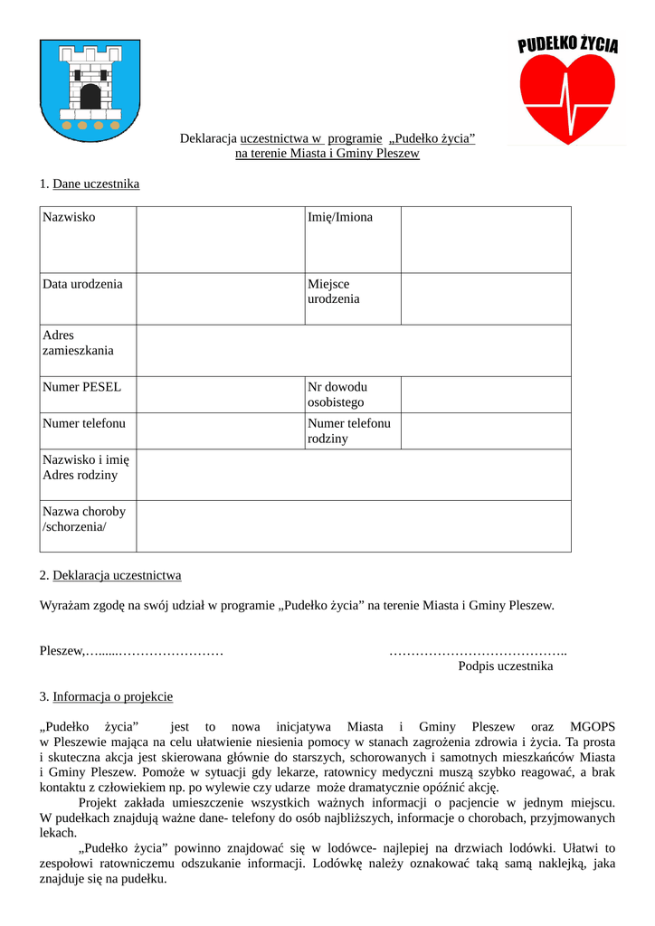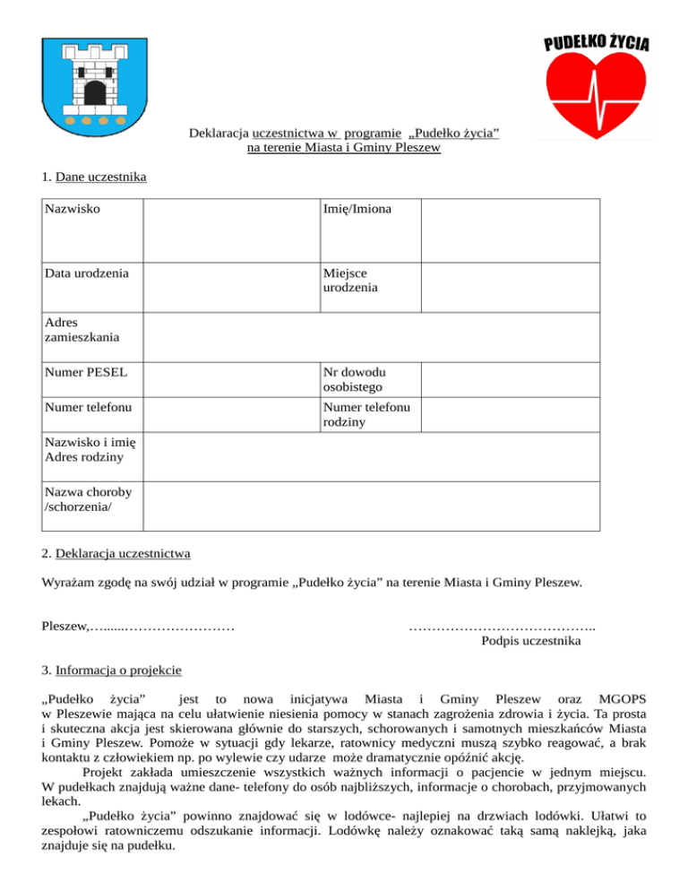 Deklaracja uczestnictwa w programie „Pudełko życia” na terenie Miasta i Gminy Pleszew 1. Dane uczestnika Nazwisko Imię/Imiona Data urodzenia Miejsce urodzenia Adres zamieszkania Numer PESEL Nr dowodu osobistego Numer telefonu Numer telefonu rodziny Nazwisko i imię Adres rodziny Nazwa choroby /schorzenia/ 2. Deklaracja uczestnictwa Wyrażam zgodę na swój udział w programie „Pudełko życia” na terenie Miasta i Gminy Pleszew. Pleszew,…......…………………… ………………………………….. Podpis uczestnika 3. Informacja o projekcie „Pudełko życia” jest to nowa inicjatywa Miasta i Gminy Pleszew oraz MGOPS w Pleszewie mająca na celu ułatwienie niesienia pomocy w stanach zagrożenia zdrowia i życia. Ta prosta i skuteczna akcja jest skierowana głównie do starszych, schorowanych i samotnych mieszkańców Miasta i Gminy Pleszew. Pomoże w sytuacji gdy lekarze, ratownicy medyczni muszą szybko reagować, a brak kontaktu z człowiekiem np. po wylewie czy udarze może dramatycznie opóźnić akcję. Projekt zakłada umieszczenie wszystkich ważnych informacji o pacjencie w jednym miejscu. W pudełkach znajdują ważne dane- telefony do osób najbliższych, informacje o chorobach, przyjmowanych lekach. „Pudełko życia” powinno znajdować się w lodówce- najlepiej na drzwiach lodówki. Ułatwi to zespołowi ratowniczemu odszukanie informacji. Lodówkę należy oznakować taką samą naklejką, jaka znajduje się na pudełku. 4. Instrukcja obsługi • • • • • wypełnij kartę informacyjną włóż wypełnioną kartę informacyjną do pudełka na pudełko naklej naklejkę „Pudełko życia” włóż pudełko do lodówki na lodówkę naklej naklejkę z napisem „Pudełko życia” 5. Informacja dotycząca składania deklaracji Wypełnione deklaracje należy złożyć w sekretariacie Miejsko – Gminnego Ośrodka Pomocy Społecznej w Pleszewie przy ul. Targowej 1 (I piętro). Więcej informacji dotyczących programu „Pudełko życia” można uzyskać pod nr tel. 62 7422 738 kontaktując się z pracownikami MGOPS Pleszew - Panią Hanną Kozłowską lub Anetą Gramala- Klińską.