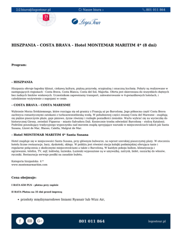 [email protected] Nasze biura 801 011 864 HISZPANIA - COSTA BRAVA - Hotel MONTEMAR MARITIM 4* (8 dni) Program: - HISZPANIA Hiszpania oferuje łagodny klimat, ciekawą kulturę, piękną przyrodę, oryginalną i smaczną kuchnię. Pobyty są realizowane w następujących regionach - Costa Brava, Costa Blanca, Costa del Sol, Majorka. Oferta jest skierowana do wszystkich chętnych bez żadnych limitów wiekowych. Uczestnikom zapewniamy transport, zakwaterowanie w 4-gwiazdkowych hotelach, i całodzienne wyżywienie z napojami w cenie. - COSTA BRAVA - COSTA MARESME Wybrzeże Morza Śródziemnego, które rozciąga się od granicy z Francją aż po Barcelonę. Jego północna część Costa Brava zachwyca romantycznymi zatokami z turkusowoniebieską wodą. W południowej części zwanej Costa del Maresme - znajdują się piękne piaszczyste plaże, gaje piniowe, żyzne równiny i rozległe posiadłości ziemskie. Warto wybrać się na wycieczkę do historycznej Girony, zwiedzić Figueras – miasto Salvadora Dali. Koniecznie trzeba odwiedzić Barcelonę – stolicę Katalonii. Podróżni poszukujący tradycyjnego wypoczynku nad morzem znajdą sprzyjające warunki w miejscowościach takich jak Santa Susana, Lloret de Mar, Blanes, Calella, Malgrat de Mar. - Hotel MONTEMAR MARITIM 4* Santa Susana Hotel znajduje się w miejscowości Santa Susana, przy głównym bulwarze, na wprost szerokiej piaszczystej plaży. W otoczeniu hotelu liczne restauracje, bary, dyskoteki, sklepy. W pobliżu jest również stacja kolejki podmiejskiej oferująca tanie i regularne połączenia z okolicznymi miejscowościami a także z Barceloną. W każdym pokoju balkon, klimatyzacja i ogrzewanie, telefon, TV, sejf, lodówkę, łazienka. Łazienki wyposażone są w umywalkę, natrysk, bidet, suszarkę do włosów, ręczniki. Restauracja serwuje posiłki na zasadzie bufetu. Kategoria hiszpańska 4 * www.montemarmaritim.com Cena obejmuje: I RATA 650 PLN - płatna przy zapisie II RATA Płatna na 35 dni przed imprezą przeloty międzynarodowe liniami Ryanair lub Wizz Air, 801 011 864 logostour.pl [email protected] Nasze biura 801 011 864 transfery shuttle lotnisko-hotel-lotnisko (bez udziału rezydenta), zakwaterowanie - 7 noclegów w hotelu 4*, w pok. 2-osob., wyżywienie 3 posiłki dziennie (bufet) + napoje (wino i woda) opieka polskojęzycznego rezydenta, wycieczka do Barcelony z polskojęzycznym przewodnikiem (dotyczy pobytów w okresie 29/04-21/06 + 15/9-20/10.2017) ubezpieczenie Signal Iduna NW, KL, bagaż. Dodatkowe informacje: TAKSA TURYSTYCZNA Obowiązkowa taksa turystyczna płatna na miejscu – 7 EUR/pobyt. DZIECI Opłata całkowita za dziecko (0-2 lat) – 150 PLN. BAGAŻ Cena biletu lotniczego obejmuje przewóz bagażU w następujących limitach: - w przypadku linii Ryanair 1 sztuka bagażu rejestrowanego o wadze 15 kg i 1 sztuka bagażu podręcznego o wadze 10 kg, - w przypadku linii Wizz Air 1 sztuka bagażu rejestrowanego o wadze 23 kg i 1 sztuka bagażu podręcznego o wymiarach 42 cm x 32 cm x 25 cm. W przypadku linii Ryanair, za dodatkową opłatą, w momencie rezerwacji istnieje możliwość zwiększenia wagi bagażu rejestrowanego do 20 kg DODATKOWE OPŁATY - dopłata do pok. 1-os. 500 pln - dopłata do pok. 1-os. w terminie 27.05-10.06.2017 500 pln - dziecko 2-12 lat -600 pln - 3.os.dorosłe w pok.2-os. -80 pln Terminy: 01.04 - 08.04.2017, 2190 PLN 08.04 - 15.04.2017, 2190 PLN 15.04 - 22.04.2017, 2190 PLN 22.04 - 29.04.2017, 2300 PLN 29.04 - 06.05.2017, 2490 PLN 06.05 - 13.05.2017, 2490 PLN 13.05 - 20.05.2017, 2490 PLN 801 011 864 logostour.pl [email protected] Nasze biura 801 011 864 20.05 - 27.05.2017, 2490 PLN 27.05 - 03.06.2017, 2590 PLN 03.06 - 10.06.2017, 2590 PLN 07.10 - 14.10.2017, 2490 PLN 14.10 - 21.10.2017, 2490 PLN 21.10 - 28.10.2017, 2190 PLN 28.10 - 04.11.2017, 2190 PLN 801 011 864 logostour.pl