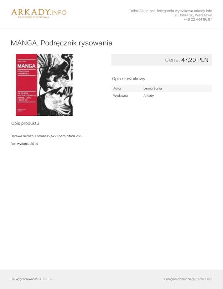Dobra28 sp zoo. księgarnia wysyłkowa arkady.info ul. Dobra 28, Warszawa +48 22 444 86 97 MANGA. Podręcznik rysowania Cena: 47,20 PLN Opis słownikowy Autor Leong Sonia Wydawca Arkady Opis produktu Oprawa miękka, Format 19,5x22,5cm, Stron 256 Rok wydania 2014 Plik wygenerowano: 04-03-2017 Powered by TCPDF (www.tcpdf.org) Oprogramowanie sklepu: AptusShop