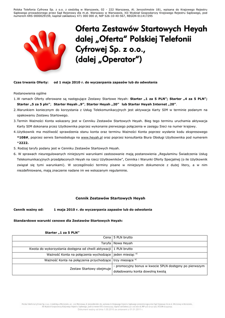 Polska Telefonia Cyfrowa Sp. z o.o. z siedzibą w Warszawie, 02 - 222 Warszawa, Al. Jerozolimskie 181, wpisana do Krajowego Rejestru Sądowego prowadzonego przez Sąd Rejonowy dla m.st. Warszawy w Warszawie, XII Wydział Gospodarczy Krajowego Rejestru Sądowego, pod numerem KRS 0000029159, kapitał zakładowy 471 000 000 zł, NIP 526-10-40-567, REGON 011417295 Oferta Zestawów Startowych Heyah dalej „Oferta” Polskiej Telefonii Cyfrowej Sp. z o.o., (dalej „Operator”) Czas trwania Oferty: od 1 maja 2010 r. do wyczerpania zapasów lub do odwołania Postanowienia ogólne 1. W ramach Oferty oferowane są następujące Zestawy Startowe Heyah: Starter „1 za 5 PLN”; Starter „4 za 5 PLN”; Starter „5 za 5 pln”; Starter Heyah „9”; Starter Heyah „20” lub Starter Heyah Internet „20”. 2. Warunkiem koniecznym do korzystania z Usług Telekomunikacyjnych jest aktywacja Karty SIM w terminie podanym na opakowaniu Zestawu Startowego. 3. Termin Ważności Konta wskazany jest w Cenniku Zestawów Startowych Heyah. Bieg tego terminu uruchamia aktywacja Karty SIM dokonana przez Użytkownika poprzez wykonanie pierwszego połączenia w zasięgu Sieci na numer krajowy. 4. Użytkownik ma możliwość sprawdzenia stanu konta oraz terminu Ważności Konta poprzez wysłanie kodu ekspresowego *108#, poprzez serwis Samoobsługa na www.heyah.pl oraz poprzez konsultanta Biura Obsługi Użytkownika pod numerem *2222. 5. Rodzaj taryfy podany jest w Cenniku Zestawów Startowych Heyah. 6. W sprawach nieuregulowanych niniejszymi warunkami zastosowanie mają postanowienia „Regulaminu Świadczenia Usług Telekomunikacyjnych przedpłaconych Heyah na rzecz Użytkowników”, Cennika i Warunki Oferty Specjalnej (o ile Użytkownik związał się tymi warunkami). W szczególności terminy pisane w niniejszym dokumencie z dużej litery, a w nim niezdefiniowane, mają znaczenie nadane im we wskazanym regulaminie. Cennik Zestawów Startowych Heyah Cennik ważny od: 1 maja 2010 r. do wyczerpania zapasów lub do odwołania Standardowe warunki cenowe dla Zestawów Startowych Heyah: Starter „1 za 5 PLN” Cena 5 PLN brutto Taryfa Nowa Heyah Kwota do wykorzystania dostępna od chwili aktywacji 1 PLN brutto Ważność Konta na połączenia wychodzące jeden miesiąc Ważność Konta na połączenia przychodzące trzy miesiące Zestaw Startowy obejmuje a) a) - promocyjny bonus w kwocie 5PLN dostępny po pierwszym doładowaniu konta dowolną kwotą Dokument ważny od dnia 1.05.2010 ze zmianami z 01.01.2011 r. Starter „4 za 5 PLN” Cena 5 PLN brutto Taryfa Taryfa Pakietowa Kwota do wykorzystania dostępna od chwili aktywacji 4 PLN brutto Ważność Konta na połączenia wychodzące jeden miesiąc Ważność Konta na połączenia przychodzące trzy miesiące a) a) Zestaw Startowy obejmuje - Starter „5 za 5 pln” Cena 5 PLN brutto Taryfa Nowa Heyah Kwota do wykorzystania dostępna od chwili aktywacji 5 PLN brutto Ważność Konta na połączenia wychodzące 14 dni a) Ważność Konta na połączenia przychodzące trzy miesiące a) Zestaw Startowy obejmuje - Starter Heyah „9” – Dwa starterki, Dwa numerki Cena 9 PLN brutto Taryfa Nowa Heyah Kwota do wykorzystania dostępna od chwili aktywacji 4 PLN brutto niezależnie dla każdej karty SIM Ważność Konta na połączenia wychodzące jeden miesiąc Ważność Konta na połączenia przychodzące trzy miesiące a) a) Zestaw Startowy obejmuje - dwie Karty SIM - promocyjne doładowanie 50 minut Extra dostępne dla każdej Karty SIM po pierwszym doładowaniu konta jednorazową kwotą 30 PLN b) Starter Heyah „20” Cena 20 PLN brutto Taryfa Nowa Heyah Kwota do wykorzystania dostępna od chwili aktywacji 20 PLN brutto Ważność Konta na połączenia wychodzące jeden miesiąc Ważność Konta na połączenia przychodzące trzy miesiące a) a) Zestaw Startowy obejmuje - Starter Heyah Internet „20” Cena 20 PLN brutto Taryfa Nowa Heyah Kwota do wykorzystania dostępna od chwili aktywacji 20,48 PLN brutto Ważność Konta na połączenia wychodzące jeden miesiąc Ważność Konta na połączenia przychodzące trzy miesiące a) a) Zestaw Startowy obejmuje a) b) czas ważności konta na połączenia wychodzące liczony jest od momentu wykonania pierwszego połączenia wychodzącego, a czas ważności konta na połączenia przychodzące liczony jest od momentu przekroczenia daty Ważności Konta. Zasady dotyczące promocyjnego doładowania konta pakietem minut, po 50 minut Extra osobno dla każdej Karty SIM wchodzącej w skład zestawu startowego „Dwa starterki, Dwa numerki”, po pierwszym doładowaniu konta jednorazową kwotą 30 PLN określone zostały w Warunkach Oferty Promocyjnej „Minuty Extra po doładowaniu za 30 zł. Regulamin Oferty Promocyjnej Polskiej telefonii Cyfrowej Sp. z o.o., Operatora Heyah, które stanowią załącznik do niniejszego Cennika. Dokument ważny od dnia 1.05.2010 ze zmianami z 01.01.2011 r.