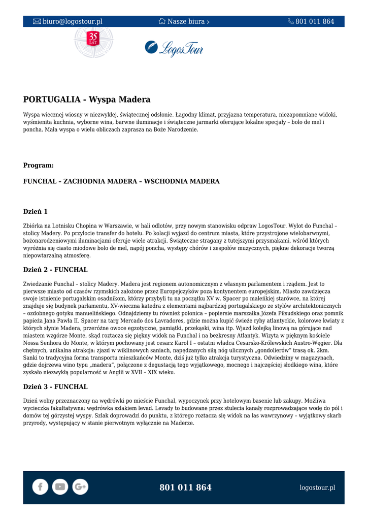 [email protected] Nasze biura 801 011 864 PORTUGALIA - Wyspa Madera Wyspa wiecznej wiosny w niezwykłej, świątecznej odsłonie. Łagodny klimat, przyjazna temperatura, niezapomniane widoki, wyśmienita kuchnia, wyborne wina, barwne iluminacje i świąteczne jarmarki oferujące lokalne specjały – bolo de mel i poncha. Mała wyspa o wielu obliczach zaprasza na Boże Narodzenie. Program: FUNCHAL – ZACHODNIA MADERA – WSCHODNIA MADERA Dzień 1 Zbiórka na Lotnisku Chopina w Warszawie, w hali odlotów, przy nowym stanowisku odpraw LogosTour. Wylot do Funchal – stolicy Madery. Po przylocie transfer do hotelu. Po kolacji wyjazd do centrum miasta, które przystrojone wielobarwnymi, bożonarodzeniowymi iluminacjami oferuje wiele atrakcji. Świąteczne stragany z tutejszymi przysmakami, wśród których wyróżnia się ciasto miodowe bolo de mel, napój poncha, występy chórów i zespołów muzycznych, piękne dekoracje tworzą niepowtarzalną atmosferę. Dzień 2 - FUNCHAL Zwiedzanie Funchal – stolicy Madery. Madera jest regionem autonomicznym z własnym parlamentem i rządem. Jest to pierwsze miasto od czasów rzymskich założone przez Europejczyków poza kontynentem europejskim. Miasto zawdzięcza swoje istnienie portugalskim osadnikom, którzy przybyli tu na początku XV w. Spacer po maleńkiej starówce, na której znajduje się budynek parlamentu, XV-wieczna katedra z elementami najbardziej portugalskiego ze stylów architektonicznych – ozdobnego gotyku manuelińskiego. Odnajdziemy tu również polonica – popiersie marszałka Józefa Piłsudskiego oraz pomnik papieża Jana Pawła II. Spacer na targ Mercado dos Lavradores, gdzie można kupić świeże ryby atlantyckie, kolorowe kwiaty z których słynie Madera, przeróżne owoce egzotyczne, pamiątki, przekąski, wina itp. Wjazd kolejką linową na górujące nad miastem wzgórze Monte, skąd roztacza się piękny widok na Funchal i na bezkresny Atlantyk. Wizyta w pięknym kościele Nossa Senhora do Monte, w którym pochowany jest cesarz Karol I – ostatni władca Cesarsko-Królewskich Austro-Węgier. Dla chętnych, unikalna atrakcja: zjazd w wiklinowych saniach, napędzanych siłą nóg ulicznych „gondolierów” trasą ok. 2km. Sanki to tradycyjna forma transportu mieszkańców Monte, dziś już tylko atrakcja turystyczna. Odwiedziny w magazynach, gdzie dojrzewa wino typu „madera”, połączone z degustacją tego wyjątkowego, mocnego i najczęściej słodkiego wina, które zyskało niezwykłą popularność w Anglii w XVII – XIX wieku. Dzień 3 - FUNCHAL Dzień wolny przeznaczony na wędrówki po mieście Funchal, wypoczynek przy hotelowym basenie lub zakupy. Możliwa wycieczka fakultatywna: wędrówka szlakiem levad. Levady to budowane przez stulecia kanały rozprowadzające wodę do pól i domów tej górzystej wyspy. Szlak doprowadzi do punktu, z którego roztacza się widok na las wawrzynowy – wyjątkowy skarb przyrody, występujący w stanie pierwotnym wyłącznie na Maderze. 801 011 864 logostour.pl [email protected] Nasze biura 801 011 864 Dzień 4 - ZACHODNIA MADERA Dla chętnych wycieczka na zachód wyspy. Przejazd trasą Estrada Monumental do Camara de Lobos – małego miasteczka z kolorowymi łodziami rybackimi zacumowanymi w porcie. W styczniu 1950 roku odpoczywał tu Winston Churchill i zauroczony widokiem na zatokę malował akwarele. Wjazd na najwyższy klif Europy Cabo Girao (580m n.p.m.). Znajdująca się tu platforma obserwacyjna z przeszkloną podłogą to niezwykle ekscytujący, ale bezpieczny punkt widokowy oferujący niebywałe wrażenia. Następnie wjazd w głąb wyspy przez przełęcz Encumeada i dalej przez równiny Paul da Serra. Zachwycające widoki są nieodłącznym elementem tej wycieczki. Przyjazd do miasteczka Porto Moniz, słynącego z przepięknych naturalnych basenów utworzonych wśród skał wulkanicznych. Lunch w restauracji z widokiem na Ocean Atlantycki. Po południu przejazd wzdłuż północnego wybrzeża, oferującego równie malowniczego widoki jak i inne części tej uroczej wyspy, do Sao Vicente. Spacer po miasteczku. Powrót do hotelu w Funchal. Dzień 5 - WSCHODNIA MADERA Dla chętnych wycieczka na wschód Madery. Wyjazd z wybrzeża do górzystego wnętrza wyspy. Kręte, stromo pnące się drogi prowadzą w pobliże Pico do Arieiro, trzeciego z najwyższych szczytów wyspy (1 810m n.p.m.). Krótka wędrówka z parkingu do punktu widokowego pod szczytem. Przy sprzyjającej pogodzie z punktu widokowego (powyżej przeciętnego poziomu chmur) roztaczają się imponujące widoki na okoliczne głębokie doliny. Czasem dojrzeć można nawet nieodległą, drugą pod względem wielkości wyspę archipelagu – Porto Santo. Przejazd do Parku Przyrodniczego Ribeiro Frio. Po obejrzeniu hodowli pstrągów warto zamówić sobie wyjątkowo rozgrzewający specjał Madery – mocny napój poncha. Kolejny przystanek to Santana z charakterystycznymi, trójkątnymi domkami krytymi strzechą. W drodze powrotnej do Funchal postój w Porto da Cruz oraz na jednym z najpiękniejszych punktów widokowych na wyspie. Na zakończenie wizyta w Machico – miejscu, w którym w XV w. wylądował odkrywca Madery – João Gonçalves Zarco, żołnierz w służbie księcia Henryka Żeglarza. Dzień 6 - FUNCHAL Ostatnie chwile odpoczynku. Transfer na lotnisko w Funchal. Wylot do Polski. Przylot do Warszawy. Cena obejmuje: I RATA 2000 PLN płatna przy zapisie II RATA płatna na 35 dni przed wyjazdem rzelot międzynarodowy, transfery lotnisko – hotel – lotnisko zakwaterowanie w hotelu 4*, pokoje 2-osob.; dopłata do pok. 1-osob. 650 PLN; dopłata do pokoju z gwarantowanym widokiem na ocean 320 PLN śniadania i kolacje, opiekę pilota, usługi lokalnych przewodników, ubezpieczenie Signal Iduna (KL, NW, bagaż, OC). Dodatkowe informacje: 801 011 864 logostour.pl [email protected] Nasze biura 801 011 864 BILETY WSTĘPU Bilety wstępu do zwiedzanych obiektów - ok. 30 EUR NAPIWKI Na zwyczajowe napiwk