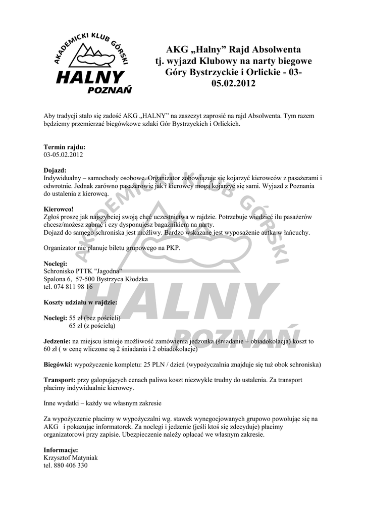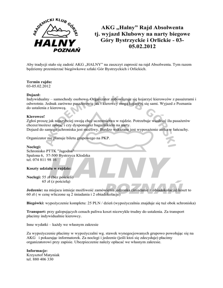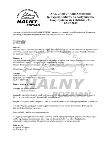 AKG „Halny” Rajd Absolwenta tj. wyjazd Klubowy na narty biegowe Góry Bystrzyckie i Orlickie - 0305.02.2012 Aby tradycji stało się zadość AKG „HALNY” na zaszczyt zaprosić na rajd Absolwenta. Tym razem będziemy przemierzać biegówkowe szlaki Gór Bystrzyckich i Orlickich. Termin rajdu: 03-05.02.2012 Dojazd: Indywidualny – samochody osobowe. Organizator zobowiązuje się kojarzyć kierowców z pasażerami i odwrotnie. Jednak zarówno pasażerowie jak i kierowcy mogą kojarzyć się sami. Wyjazd z Poznania do ustalenia z kierowcą. Kierowco! Zgłoś proszę jak najszybciej swoją chęć uczestnictwa w rajdzie. Potrzebuje wiedzieć ilu pasażerów chcesz/możesz zabrać i czy dysponujesz bagażnikiem na narty. Dojazd do samego schroniska jest możliwy. Bardzo wskazane jest wyposażenie autka w łańcuchy. Organizator nie planuje biletu grupowego na PKP. Noclegi: Schronisko PTTK "Jagodna" Spalona 6, 57-500 Bystrzyca Kłodzka tel. 074 811 98 16 Koszty udziału w rajdzie: Noclegi: 55 zł (bez pościeli) 65 zł (z pościelą) Jedzenie: na miejscu istnieje możliwość zamówienia jedzonka (śniadanie + obiadokolacja) koszt to 60 zł ( w cenę wliczone są 2 śniadania i 2 obiadokolacje) Biegówki: wypożyczenie kompletu: 25 PLN / dzień (wypożyczalnia znajduje się tuż obok schroniska) Transport: przy galopujących cenach paliwa koszt niezwykle trudny do ustalenia. Za transport płacimy indywidualnie kierowcy. Inne wydatki – każdy we własnym zakresie Za wypożyczenie płacimy w wypożyczalni wg. stawek wynegocjowanych grupowo powołując się na AKG i pokazując informatorek. Za noclegi i jedzenie (jeśli ktoś się zdecyduje) płacimy organizatorowi przy zapisie. Ubezpieczenie należy opłacać we własnym zakresie. Informacje: Krzysztof Matyniak tel. 880 406 330 mail: [email protected] Zapisy: - e-mailem do 26.01 lub osobiście - 19.01.2012 po pokazie slajdów - 24.01.2012 w Klubie UWAGA ! Przy zapisach niezbędne jest podanie rozmiaru buta i wzrostu (dla osób, które nie posiadają własnego sprzętu biegówkowego). Jest to konieczne do rezerwacji sprzętu. Aktualnie wyjazd planowany jest na 30 osób, dlatego proszę zainteresowane osoby o jak najszybsze deklarowanie się. Co brać? Z rzeczy, które zwykle bierze się ze sobą należy zwrócić szczególną uwagę na to aby wziąć: - narty biegowe, buty, kijki (jeśli ktoś takowe posiada), - czapkę, rękawiczki, szalik, ciepłą kurtkę, polar, buty nieprzemakalne oraz laczki lub inne obuwie do schroniska, - śpiwór (jeśli ktoś wybiera nocleg bez pościeli), - czołówkę - mały (np. 30 L) plecak do zabierania ze sobą rzeczy na wędrówki (termos, cieplejsze ubranie, jedzenie), - dowód tożsamości, a najlepiej dwa (możliwe, że jeden będzie trzeba zostawić w wypożyczalni, - dobry humor, - miło by było gdyby ktoś zabrał gitarę lub inny instrument muzyczny, Warto zwrócić uwagę na ubranie, które powinno być nieco cieńsze i w miarę możliwości oddychające. Co potrzebne jest do zapisania się na rajd: - imię, nazwisko i dane kontaktowe (telefon, meil), - czy dysponujesz transportem i iloma wolnymi miejscami oraz czy posiadasz bagażnik do przewozu nart, - czy zarezerwować ci biegówki w wypożyczalni?; jeżeli tak to potrzebuje twój rozmiar buta oraz wzrost, - czy reflektujesz na zamówienie wyżywienia, - wpłata za noclegi i ewentualne jedzenie, Wpłaty można dokonywać osobiście w gotówce w walucie polskiej lub przelewem na konto. OSTATECZNY TERMIN ZGŁOSZEŃ TO 26.01.2012