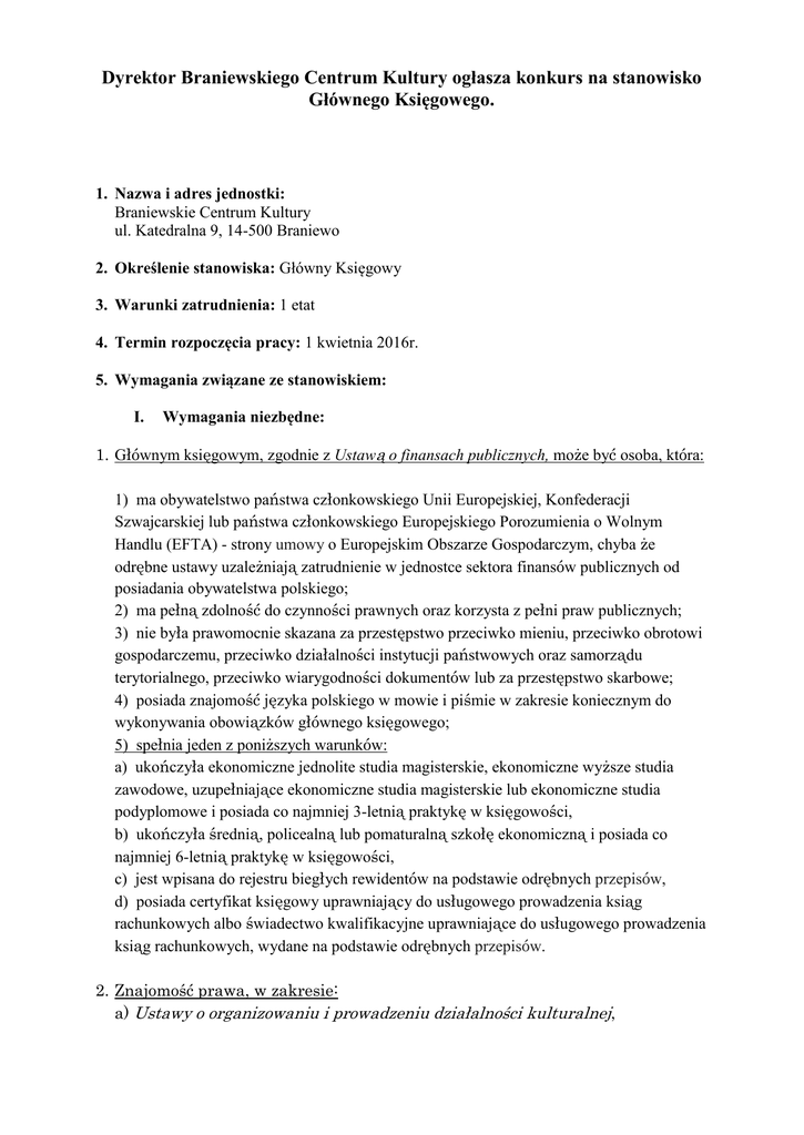 Dyrektor Braniewskiego Centrum Kultury ogłasza konkurs na stanowisko Głównego Księgowego. 1. Nazwa i adres jednostki: Braniewskie Centrum Kultury ul. Katedralna 9, 14-500 Braniewo 2. Określenie stanowiska: Główny Księgowy 3. Warunki zatrudnienia: 1 etat 4. Termin rozpoczęcia pracy: 1 kwietnia 2016r. 5. Wymagania związane ze stanowiskiem: I. Wymagania niezbędne: 1. Głównym księgowym, zgodnie z Ustawą o finansach publicznych, może być osoba, która: 1) ma obywatelstwo państwa członkowskiego Unii Europejskiej, Konfederacji Szwajcarskiej lub państwa członkowskiego Europejskiego Porozumienia o Wolnym Handlu (EFTA) - strony umowy o Europejskim Obszarze Gospodarczym, chyba że odrębne ustawy uzależniają zatrudnienie w jednostce sektora finansów publicznych od posiadania obywatelstwa polskiego; 2) ma pełną zdolność do czynności prawnych oraz korzysta z pełni praw publicznych; 3) nie była prawomocnie skazana za przestępstwo przeciwko mieniu, przeciwko obrotowi gospodarczemu, przeciwko działalności instytucji państwowych oraz samorządu terytorialnego, przeciwko wiarygodności dokumentów lub za przestępstwo skarbowe; 4) posiada znajomość języka polskiego w mowie i piśmie w zakresie koniecznym do wykonywania obowiązków głównego księgowego; 5) spełnia jeden z poniższych warunków: a) ukończyła ekonomiczne jednolite studia magisterskie, ekonomiczne wyższe studia zawodowe, uzupełniające ekonomiczne studia magisterskie lub ekonomiczne studia podyplomowe i posiada co najmniej 3-letnią praktykę w księgowości, b) ukończyła średnią, policealną lub pomaturalną szkołę ekonomiczną i posiada co najmniej 6-letnią praktykę w księgowości, c) jest wpisana do rejestru biegłych rewidentów na podstawie odrębnych przepisów, d) posiada certyfikat księgowy uprawniający do usługowego prowadzenia ksiąg rachunkowych albo świadectwo kwalifikacyjne uprawniające do usługowego prowadzenia ksiąg rachunkowych, wydane na podstawie odrębnych przepisów. 2. Znajomość prawa, w zakresie: a) Ustawy o organizowaniu i prowadzeniu działalności kulturalnej, a) Ustawy o finansach publicznych, b) Ustawy o rachunkowości 3. Wysoka kultura osobista. II. Wymagania preferowane: 1. Doświadczenie w pracy księgowego w jednostce sektora finansów publicznych. 2. Dobra znajomość standardowych aplikacji Windows (między innymi Word, Excel, Outlook Express), Internetu, oraz programu księgowość Progman. 6. Zakres zadań wykonywanych na stanowisku: Obowiązki i odpowiedzialność, w zakresie: 1) prowadzenia rachunkowości jednostki; 2) wykonywania dyspozycji środkami pieniężnymi; 3) dokonywania wstępnej kontroli: a) zgodności operacji gospodarczych i finansowych z planem finansowym, b) kompletności i rzetelności dokumentów dotyczących operacji gospodarczych i finansowych. 4) Sporządzania sprawozdań finansowych z wydatków strukturalnych oraz operacji finansowych. 5) Naliczania wynagrodzeń i sporządzanie listy płac pracowników. 6) Prowadzenia obsługi finansowej i rozliczanie projektów. 7) Naliczania podatków i terminowe regulowanie zobowiązań, 8) Rozliczania z ZUS-em: naliczanie składek, wypełnianie deklaracji rozliczeniowych i raportów imiennych – przekaz elektronicznych do ZUS. 9) Przygotowywania i przekazywania do ZUS wniosków pracowników ubiegających się o renty i emerytury. 10) Prowadzenia analityki zgodnie z zakładowym planem kont. 11) Przygotowywanie i rozliczenie inwentaryzacji. 12) Sporządzania bilansu jednostki. 13) Terminowe sporządzanie sprawozdań do Urzędu Miasta. 7. Informacja o warunkach pracy na danym stanowisku: Praca w biurze jednoosobowym, w siedzibie Braniewskiego Centrum Kultury, 8 godzin dziennie, przy komputerze. 8. Wymagane dokumenty: 1. List motywacyjny, 2. Życiorys (CV), 3. Kwestionariusz osobowy dla osoby ubiegającej się o pracę- (na Załączniku nr 1 do niniejszego ogłoszenia.) 4. Kserokopie dokumentów poświadczających staż pracy (świadectwa pracy, zaświadczenia), 5. Kserokopie dokumentów poświadczających wykształcenie, 6. Kserokopie dokumentów poświadczających posiadane kwalifikacje ( w tym kursy i szkolenia). 7. Niezbędne oświadczenia ubiegającego się o stanowisko Głównego księgowego (na Załączniku nr 2 do niniejszego ogłoszenia). 10. Oświadczenie o stanie zdrowia pozwalającym na zatrudnienie na stanowisku głównego księgowego. 9. Termin i miejsce składania dokumentów: Dokumenty należy złożyć w zaklejonej kopercie A4 osobiście lub przesłać pocztą, na adres: Braniewskie Centrum Kultury ul. Katedralna 9, 14-500 Braniewo z dopiskiem „Konkurs na Głównego Księgowego” W terminie: do 29 lutego 2016, do godziny 16.00 (Dokumenty, które dotrą do sekretariatu po wyznaczonym terminie nie będą uwzględniane przy rekrutacji.) 10 . Procedury konkursowe: Nadesłane dokumenty będą analizowane pod względem formalnym, następnie wybrane osoby zostaną zaproszone na spotkanie z Komisją Rekrutacyjną. 11. Miejsce ogłoszenia konkursu i jego wyników: Informacje o konkursie na głównego księgowego w Braniewskim Centrum Kultury zostaną opublikowane: a) W Biuletynie Informacji Publicznej Urzędu Miasta b) Na stronie Internetowej BCK- w zakładce BIP c) W Powiatowym Urzędzie Pracy d) Na tablicy informacyjnej Urzędu Miasta i Braniewskiego Centrum Kultury.