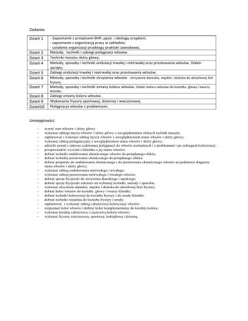 Zadania: - Zapoznanie z przepisami BHP, ppoż. i obsługą urządzeń; - zapoznanie z organizacją pracy w zakładzie; - ustalenie organizacji przebiegu praktyki zawodowej. Metody, techniki i zabiegi pielęgnacji włosów. Techniki masażu skóry głowy. Metody, sposoby i techniki ondulacji trwałej i nietrwałej oraz prostowania włosów. Dobór sprzętu Zabiegi ondulacji trwałej i nietrwałej oraz prostowania włosów. Metody, sposoby i techniki strzyżenia włosów -strzyżenie damskie, męskie i dziecka do określonej linii Dzień 1 Dzień 2 Dzień 3 Dzień 4 Dzień 5 Dzień 6 fryzury. Metody, sposoby i techniki zmiany koloru włosów. Dobór koloru włosów do kształtu głowy i twarzy Dzień 7 klientki. Dzień 8 Dzień 9 Dzień10 Zabiegi zmiany koloru włosów. Wykonanie fryzury sportowej, dziennej i wieczorowej. Pielęgnacja włosów z problemami. Umiejętności: ocenić stan włosów i skóry głowy wykonać zabiegi mycia włosów i skóry głowy z uwzględnieniem różnych technik masażu; zaplanować i wykonać zabieg mycia włosów z uwzględnieniem stanu włosów i skóry głowy; wykonać zabieg pielęgnacyjny z uwzględnieniem stanu włosów i skóry głowy; udzielić porad z zakresu codziennej pielęgnacji do włosów normalnych i z problemami i po zabiegach koloryzacji; przeprowadzić wywiad z klientka o jej stanie włosów; dobrać techniki ondulowania chemicznego włosów do pożądanego efektu; dobrać technikę prostowania chemicznego do pożądanego efektu; dobrać preparaty do ondulowania chemicznego i do prostowania chemicznego włosów na podstawie diagnozy stanu włosów i skóry głowy; wykonać zabieg ondulowania nietrwałego i trwałego; wykonać zabieg prostowania nietrwałego i trwałego włosów; dobrać sprzęt fryzjerski do strzyżenia damskiego i męskiego; dobrać sprzęt fryzjerski zależnie od wybranej techniki, metody i sposobu; wykonać strzyżenie damskie, męskie i dziecka do określonej linii fryzury; dobrać kolor włosów do kształtu głowy i twarzy klientki; dobrać techniki koloryzacji do kształtu fryzury i do urody klientki; dobrać techniki rozjaśnia do kształtu fryzury i urody; zaplanować i wykonać zabieg całościowej koloryzacji włosów; rozpoznać kolor włosów i dobrać kolor komplementarny do korekty koloru; wykonać korektę całościowa i częściową koloru włosów; wykonać fryzurę wieczorową, sportową, koktajlową i dzienną.