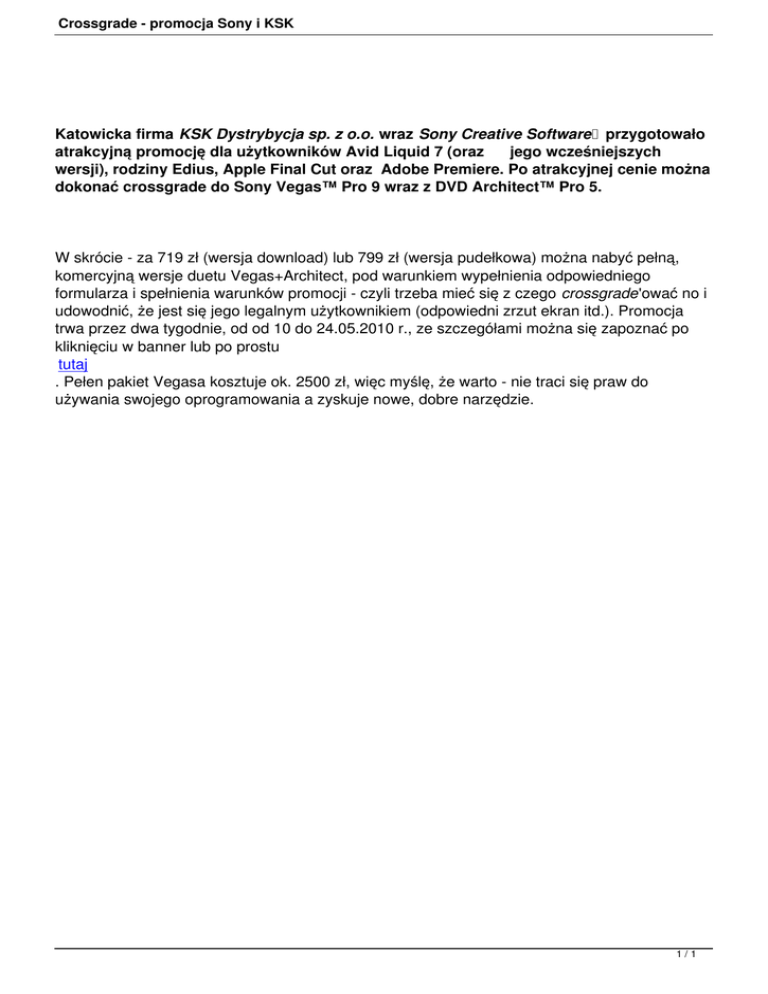 Crossgrade - promocja Sony i KSK Katowicka firma KSK Dystrybycja sp. z o.o. wraz Sony Creative Software przygotowało atrakcyjną promocję dla użytkowników Avid Liquid 7 (oraz jego wcześniejszych wersji), rodziny Edius, Apple Final Cut oraz Adobe Premiere. Po atrakcyjnej cenie można dokonać crossgrade do Sony Vegas™ Pro 9 wraz z DVD Architect™ Pro 5. W skrócie - za 719 zł (wersja download) lub 799 zł (wersja pudełkowa) można nabyć pełną, komercyjną wersje duetu Vegas+Architect, pod warunkiem wypełnienia odpowiedniego formularza i spełnienia warunków promocji - czyli trzeba mieć się z czego crossgrade'ować no i udowodnić, że jest się jego legalnym użytkownikiem (odpowiedni zrzut ekran itd.). Promocja trwa przez dwa tygodnie, od od 10 do 24.05.2010 r., ze szczegółami można się zapoznać po kliknięciu w banner lub po prostu tutaj . Pełen pakiet Vegasa kosztuje ok. 2500 zł, więc myślę, że warto - nie traci się praw do używania swojego oprogramowania a zyskuje nowe, dobre narzędzie. 1/1