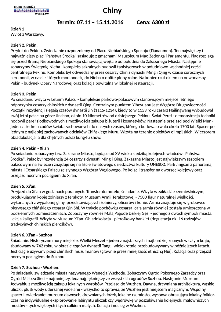 Chiny Termin: 07.11 – 15.11.2016 Cena: 6300 zł Dzień 1 Wylot z Warszawy. Dzień 2. Pekin. Przylot do Pekinu. Zwiedzanie rozpoczniemy od Placu Niebiańskiego Spokoju (Tiananmen). Ten największy i najważniejszy plac "Państwa Środka" sąsiaduje z gmachami Mauzoleum Mao Zedonga i Parlamentu. Plac rozciąga się przed Bramą Niebiańskiego Spokoju stanowiącą wejście od południa do Zakazanego Miasta. Następnie zobaczymy Świątynię Nieba - kompleks sakralnych budowli taoistycznych w południowo-wschodniej części centralnego Pekinu. Kompleks był odwiedzany przez cesarzy Chin z dynastii Ming i Qing w czasie corocznych ceremonii, w czasie których modlono się do Nieba o obfite plony rolne. Na koniec rzut okiem na nowoczesny Pekin - budynek Opery Narodowej oraz kolacja powitalna w lokalnej restauracji. Dzień 3. Pekin. Po śniadaniu wizyta w Letnim Pałacu - kompleksie parkowo-pałacowym stanowiącym miejsce letniego odpoczynku cesarzy chińskich z dynastii Qing. Centralnym punktem Yiheyuanu jest Wzgórze Długowieczności. Początki rezydencji sięgają czasów dynastii Jin (1115-1234), kiedy to w 1153 roku cesarz Hailingwang wybudował swój letni pałac na górze Jinshan, około 10 kilometrów od dzisiejszego Pekinu. Świat Pereł - demonstracja techniki hodowli pereł słodkowodnych z możliwością zakupu biżuterii i kosmetyków. Następnie przejazd pod Wielki Mur jeden z siedmiu cudów świata zachowanych do naszych czasów, którego budowa trwała około 1700 lat. Spacer po jednym z najlepiej zachowanych odcinków Chińskiego Muru. Wizyta na terenie obiektów olimpijskich. Wieczorem obiadokolacja, a dla chętnych pokaz kung-fu show. Dzień 4. Pekin - Xi’an Po śniadaniu zobaczymy tzw. Zakazane Miasto, będące od XV wieku siedzibą kolejnych władców "Państwa Środka". Pałac był rezydencją 24 cesarzy z dynastii Ming i Qing. Zakazane Miasto jest największym zespołem pałacowym na świecie i znajduje się na liście światowego dziedzictwa kultury UNESCO. Park Jingsan z panoramą miasta i Cesarskiego Pałacu ze słynnego Wzgórza Węglowego. Po kolacji transfer na dworzec kolejowy oraz przejazd nocnym pociągiem do Xi'an. Dzień 5. Xi’an. Przyjazd do Xi'an w godzinach porannych. Transfer do hotelu, śniadanie. Wizyta w zakładzie rzemieślniczym, produkującym kopie żołnierzy z terakoty. Muzeum Armii Terakotowej - 7500 figur naturalnej wielkości, wykonanych z wypalonej gliny, przedstawiających żołnierzy, oficerów i konie. Armia znajduje się w grobowcu pierwszego chińskiego cesarza Qin Shi. W trakcie pochówku cesarza, cała armia również została umieszczona w podziemnych pomieszczeniach. Zobaczymy również Małą Pagodę Dzikiej Gęsi - jednego z dwóch symboli miasta. Lekcja kaligrafii. Wizyta w Muzeum Xi'an. Obiadokolacja - pierożkowy bankiet (degustacja ok. 16 rodzajów tradycyjnych chińskich pierożków). Dzień 6. Xi’an - Suzhou Śniadanie. Historyczne mury miejskie. Wielki Meczet - jeden z najstarszych i najbardziej znanych w całym kraju, zbudowany w 742 roku, w okresie rządów dynastii Tang - wielokrotnie przebudowywany w późniejszych latach. Jest ciągle używany przez chińskich muzułmanów (głównie przez mniejszość etniczną Hui). Kolacja oraz przejazd nocnym pociągiem do Suzhou. Dzień 7. Suzhou - Wuzhen. Po śniadaniu zwiedzanie miasta nazywanego Wenecją Wschodu. Zobaczymy Ogród Pokornego Zarządcy oraz Ogród Mistrza Sieci - najmniejszy, lecz najpiękniejszy ze wszystkich ogrodów Suzhou. Następnie Muzeum Jedwabiu z możliwością zakupu lokalnych wyrobów. Przejazd do Wuzhen. Dawna, drewniana architektura, wąskie uliczki, plusk wody uderzanej wiosłami - wszystko to sprawia, że Wuzhen jest miejscem magicznym. Wspólny spacer i zwiedzanie: muzeum dawnych, drewnianych łóżek, lokalne rzemiosło, wystawa obrazująca lokalny folklor. Czas na indywidualne eksplorowanie labiryntu uliczek czy wędrówkę w poszukiwaniu kolejnych, malowniczych mostów - tych większych i tych całkiem małych. Kolacja i nocleg w Wuzhen. Dzień 8. Wuzhen - Szanghaj. Śniadanie. Przejazd autokarem do Szanghaju. Świątynia Nefrytowego Buddy - jedna z niewielu świątyń buddyjskich w mieście oraz Bund - słynne szanghajskie nabrzeże. Później czas wolny na zakupy na ulicy Nanjing, będącej głównym pasażem handlowym Szanghaju. Następnie Perła Orientu, górująca nad rzeką Huang Pu wieża telewizyjna, która dzieli miasto na dwie części. Zakwaterowanie w hotelu. Obiadokolacja. Wieczorne wyjście, fakultatywna wycieczka - rejs po rzece Huang Pu. Powrót do hotelu autokarem. Dzień 9. Szanghaj - Warszawa. Śniadanie. Czas wolny. Transfer na lotnisko, zakończenie programu i wylot do Polski. Przylot do Warszawy. CENA ZAWIERA: •przelot na trasie Warszawa - Pekin - Warszawa z przesiadkami •bilety kolejowe •opłaty lotniskowe, ubezpieczenie KL, NNW •zakwaterowanie w hotelach 3 *** w pokojach dwuosobowych z łazienkami i klimatyzacją •śniadania w formie bufetu, obiadokolacje wg programu (w tym powitalna kolacja oraz pożegnalna kolacja z "Kaczką po pekińsku", w cenie 1 szklanka napoju) •lokalny transport klimatyzowanym autokarem •zwiedzanie wg programu (bez biletów wstępu do zwiedzanych obiektów) •serwis wykwalifikowanego przewodnika lokalnego i polskiego pilota CENA NIE ZAWIERA: •dopłaty do pokoju jednoosobowego, •kosztów biletów wstępu do zwiedzanych obiektów, napiwków dla kierowców, bagażowych i przewodników lokalnych - ok. 180 USD/os., obowiązkowo płatne na miejscu •kosztów wizy chińskiej Biuro Podróży PANORAMA ul. Piłsudskiego 38 50-032 Wrocław www.panorama.wroclaw.pl Tel.: 71/ 343 44 41, kom. 609 957 575