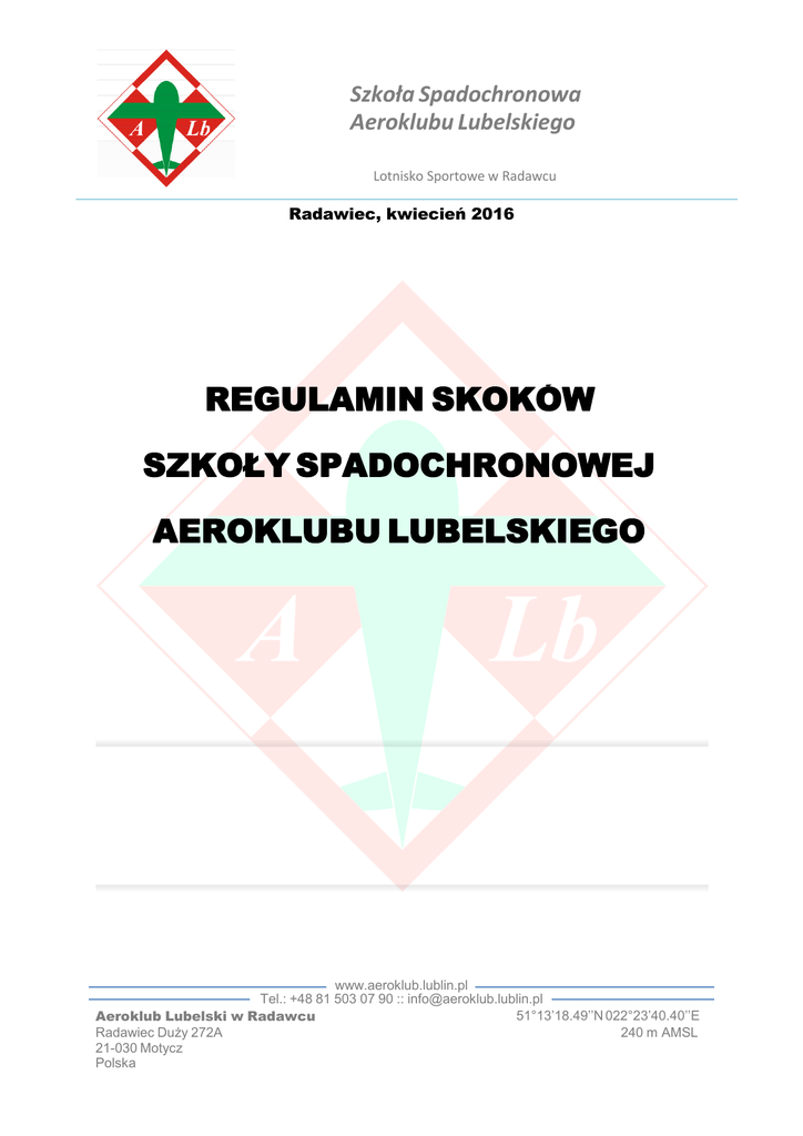 Szkoła Spadochronowa Aeroklubu Lubelskiego Lotnisko Sportowe w Radawcu Radawiec, kwiecień 2016 REGULAMIN SKOKÓW SZKOŁY SPADOCHRONOWEJ AEROKLUBU LUBELSKIEGO www.aeroklub.lublin.pl Tel.: +48 81 503 07 90 :: [email protected] 51°13’18.49’’N 022°23’40.40’’E Aeroklub Lubelski w Radawcu Radawiec Duży 272A 240 m AMSL 21-030 Motycz Polska Szkoła Spadochronowa Aeroklubu Lubelskiego Lotnisko Sportowe w Radawcu 1. Osoby funkcyjne: - Kierownik Szkolenia : ins. Sławomir Krzyżanowski - Ins. Leszek Wielgos - Ins. Tomasz Wziątek - Ins. Paweł Michalski - Ins. Rafał Zgierski 2. Rodzaj skoków wykonywanych w Aeroklubie Lubelskim. 1. Skoki szkolne metodą STATIC LINE. 2. Skoki szkolne do Świadectwa Kwalifikacji Skoczka Spadochronowego PJ "B", nadzorowane przez instruktorów, po ukończeniu podstawowego Szkolenia spadochronowego, według Programu Szkolenia Spadochronowego. 3. Skoki podnoszące poziom kwalifikacji do Świadectwa Kwalifikacji PJ "C" (wyrzucający i udział w pokazach lotniczych). 4. Skoki podnoszące poziom kwalifikacji do Świadectwa Kwalifikacji PJ "D" (organizator skoków). 5. Skoki treningowe dla osób posiadających Świadectwa Kwalifikacji Skoczka Spadochronowego PJ wszystkich kategorii. 3. Ruch kołowy i pieszy. 1. W rejonie wykonywania skoków ruch kołowy jest zabroniony, zakaz nie dotyczy samochodów służbowych przeznaczonych do zwożenia daleko lądujących skoczków, wjazdu samochodów ratowniczych typu karetka zdrowia lub straż pożarna. 2. Ruch pieszy odbywa się w wyznaczonych miejscach (od linii ustawienia wylotu do samolotu), a skoczkowie wracający z lotniska po lądowaniu muszą zwrócić szczególną uwagę na przekraczanie pasów startu i lądowania statków powietrznych (na kierunkach 110-290 i 020-200), natomiast informacja o aktualnie używanym pasie jest podawana tuż przed wylotem, w miejscu ustawienia wylotu), a także na lądujących skoczków. 3. Obowiązuje całkowity ZAKAZ WSTĘPU osób nie związanych z działalnością spadochronową na obszar lądowania skoczków i kołowania statków powietrznych. www.aeroklub.lublin.pl Tel.: +48 81 503 07 90 :: [email protected] 51°13’18.49’’N 022°23’40.40’’E Aeroklub Lubelski w Radawcu Radawiec Duży 272A 240 m AMSL 21-030 Motycz Polska Szkoła Spadochronowa Aeroklubu Lubelskiego Lotnisko Sportowe w Radawcu 4. Obecność na pokładzie statku powietrznego (poza załogą samolotu) w trakcie szkolenia. 1. Na pokład statku powietrznego mogą wejść TYLKO osoby wpisane na listę załadowczą, to jest: - samodzielni skoczkowie posiadający Świadectwo Kwalifikacji PJ, PL-CDL lub równoważny dokument akceptowany przez polskie władze lotnicze ( ULC) np. uznanie licencji zagranicznej. - uczniowie skoczkowie wpisani na listę załadowczą przez instruktora nadzorującego. 5. Przygotowanie statku powietrznego do skoków - samoloty AN-2 . 1. Statek powietrzny przystosowany do wywożenia skoczków posiada: - uzgodniony system sygnałów manualnych i głosowych, poprzez który załoga informuje wyrzucającego o kursie, wysokości i miejscu wykonania skoków, przy czym sygnały do opuszczenia pokładu samolotu daje wyrzucający lub pilot. - worek ratowniczy i siekierę. 2. Za gotowość samolotu do lotów ze skoczkami odpowiada załoga samolotu. 3. Za przygotowanie samolotu do wykonywania skoków odpowiada Organizator skoków we współpracy ze służbami technicznymi właściciela samolotu. 6. Przygotowanie statku powietrznego do skoków - samolot Jak 12. 1. Statek powietrzny przystosowany do wywożenia skoczków posiada: - uzgodniony system sygnałów manualnych i głosowych, poprzez który załoga informuje wyrzucającego o kursie, wysokości i miejscu wykonania skoków, przy czym sygnały do opuszczenia pokładu samolotu daje wyrzucający lub pilot. 2. Za gotowość samolotu do lotów ze skoczkami odpowiada załoga samolotu. 3. Za przygotowanie samolotu do wykonywania skoków odpowiada Organizator skoków we współpracy ze służbami technicznymi właściciela samolotu. 7. Przygotowanie statku powietrznego do skoków – szybowiec bocian. 1. Szybowiec Bocian przystosowany do wywożenia skoczków posiada: - uzgodniony system sygnałów manualnych i głosowych, poprzez który pilot informuje skoczka o kursie, wysokości i miejscu wykonania skoku, przy czym sygnał do opuszczenia pokładu szybowca podaje pilot; - pasy bezpieczeństwa zabezpieczające skoczka podczas startu szybowca 2. Za gotowość szybowca do lotów ze skoczkami odpowiada pilot szybowca. www.aeroklub.lublin.pl Tel.: +48 81 503 07 90 :: [email protected] 51°13’18.49’’N 022°23’40.40’’E Aeroklub Lubelski w Radawcu Radawiec Duży 272A 240 m AMSL 21-030 Motycz Polska Szkoła Spadochronowa Aeroklubu Lubelskiego Lotnisko Sportowe w Radawcu 3. Za przygotowanie szybowca do wykonywania skoków odpowiada Organizator skoków we współpracy ze służbami technicznymi właściciela szybowca. 8. Przygotowanie statku powietrznego do skoków- balon na ogrzane powietrze. 1. Balon na ogrzane powietrze przystosowany do wywożenia skoczków posiada: - uzgodniony system sygnałów manualnych i głosowych, poprzez który pilot informuje skoczka o kursie, wysokości i miejscu wykonania skoku, przy czym sygnał do opuszczenia pokładu balonu podaje pilot. 2. Za gotowość balonu do lotów ze skoczkami odpowiada pilot balonu. 3. Za przygotowanie balonu do wykonywania skoków odpowiada Organizator skoków we współpracy ze służbami technicznymi właściciela balonu. 9. Kolejność wykonywania skoków. Standardowa kolejność wyjścia z samolotu Sekcji Spadochronowej Aeroklubu Lubelskiego jest następująca (przy wyrzutach „pod wiatr”): 1. Formacje płaskie, od grup największych do najmniejszych. 2. FF, od grup największych do najmniejszych. 3. Skoczkowie wysoko otwierający się. 4. Skoczkowie latający w “Wingsuit” i „Truck”. 5. CRW ustalana jest indywidualnie a informacja o takiej formacji musi dotrzeć do załogi s