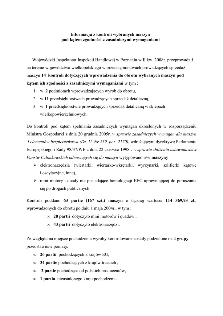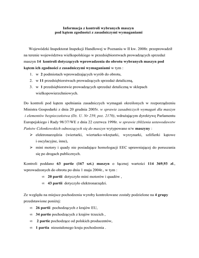 Informacja z kontroli wybranych maszyn pod kątem zgodności z zasadniczymi wymaganiami Wojewódzki Inspektorat Inspekcji Handlowej w Poznaniu w II kw. 2008r. przeprowadził na terenie województwa wielkopolskiego w przedsiębiorstwach prowadzących sprzedaŜ maszyn 14 kontroli dotyczących wprowadzenia do obrotu wybranych maszyn pod kątem ich zgodności z zasadniczymi wymaganiami w tym : 1. w 2 podmiotach wprowadzających wyrób do obrotu, 2. w 11 przedsiębiorstwach prowadzących sprzedaŜ detaliczną, 3. w 1 przedsiębiorstwie prowadzących sprzedaŜ detaliczną w sklepach wielkopowierzchniowych. Do kontroli pod kątem spełniania zasadniczych wymagań określonych w rozporządzeniu Ministra Gospodarki z dnia 20 grudnia 2005r. w sprawie zasadniczych wymagań dla maszyn i elementów bezpieczeństwa (Dz. U. Nr 259, poz. 2170), wdraŜającym dyrektywę Parlamentu Europejskiego i Rady 98/37/WE z dnia 22 czerwca 1998r. w sprawie zbliŜenia ustawodawstw Państw Członkowskich odnoszących się do maszyn wytypowano n/w maszyny : elektronarzędzia (wiertarki, wiertarko-wkrętarki, wyrzynarki, szlifierki kątowe i oscylacyjne, inne), mini motory i quady nie posiadające homologacji EEC uprawniającej do poruszania się po drogach publicznych. Kontroli poddano 63 partie (167 szt.) maszyn o łącznej wartości 114 369,93 zł., wprowadzonych do obrotu po dniu 1 maja 2004r., w tym : • 20 partii dotyczyło mini motorów i quadów , • 43 partii dotyczyło elektronarzędzi. Ze względu na miejsce pochodzenia wyroby kontrolowane zostały podzielone na 4 grupy przedstawione poniŜej: • 26 partii pochodzących z krajów EU, • 34 partie pochodzących z krajów trzecich , • 2 partie pochodzące od polskich producentów, • 1 partia nieustalonego kraju pochodzenia . Nieprawidłowości stwierdzono w 8 placówkach co stanowi 57 % ogólnie kontrolowanych. Dotyczyło to 23 partii kontrolowanych wyrobów ogólnej liczności 61 szt. (36,5%) o wartości ogólnej 74 523,00 zł. W ramach poszczególnych grup kontrolowanych wyrobów nieprawidłowości dotyczyły: - 20 partii mini motorów i quadów - 3 partii elektronarzędzi Szczegóły dotyczące nieprawidłowości opisano w dalszej części informacji. 1. Ocena wyrobów KaŜdy z kontrolowanych wyrobów został poddany oględzinom pod kątem widocznych wad technicznych, trwałości zamocowań przewodów elektrycznych, paliwowych i obudów, trwałych uszkodzeń mechanicznych mogących stwarzać zagroŜenie w trakcie ich uŜytkowania. Nieprawidłowości stwierdzono w przypadku 11 parti wyrobów pochodzących z importu i dotyczyły one następujących wad : 2. • niewłaściwych osłon lub ich braku, • niewłaściwego odpowietrzenia zbiornika paliwa, • ostrych krawędzi, • ograniczenia zakresu mechanizmu kierowania • niewłaściwych spawów, • nieodpowiedniego zabezpieczenia przewodów elektrycznych, • zastosowania zbyt małej ramy w konstrukcji maszyny. Prawidłowość umieszczenia na wyrobie oznakowania . W przypadku 2 partii wyrobów pochodzących z importu tzn.: a) pojazd silnikowy - (Quad), b) pojazd czterokołowy stwierdzono brak oznaczenia maszyny znakiem poświadczającym spełnianie zasadniczych wymagań przez w/w sprzęt w ramach dyrektywy 98/37/WE. Na tabliczce znamionowej pojazdu czterokołowego (mini quad) model umieszczono oznakowanie podobne do oznakowania niezgodne w kształcie z wzorem w załączniku -2- do w/w rozporządzenia, przy czym oznakowanie prawidłowe umieszczono na osłonie baku paliwa. W przypadku pozostałych wyrobów nie stwierdzono nieprawidłowości. Oznakowanie, umieszczone na wyrobach w sposób czytelny i trwały, było zgodne z wzorem w załączniku do rozporządzenia Ministra Gospodarki z dnia 20 grudnia 2005r. w sprawie zasadniczych wymagań dla maszyn i elementów bezpieczeństwa. 3. Prawidłowość sporządzenia i dołączenia do wyrobu deklaracji zgodności. W oparciu o § 119 ust.1 rozporządzenia Ministra Gospodarki z dnia 20.12.2005 r. w sprawie zasadniczych wymagań dla maszyn i elementów bezpieczeństwa (Dz. U. Nr 259, poz. 2170) stwierdzono w przypadku 18 partii maszyn o ogólnej wartości brak załączenia do wyrobu deklaracji zgodności. Dotyczyło to grupy maszyn mini-motory i quady ze względu na kraj pochodzenia produktu: - 17 partii wyrobów pochodzących z krajów trzecich - 1 partii wyrobu z nieustalonego kraju pochodzenia W przypadku 3 partii produktów deklaracja zgodności została sporządzona nieprawidłowo: • dla 2 partii wyrobów pochodzących z krajów trzecich Ustalono: brak danych identyfikujących osobę odpowiedzialną za składanie podpisu w imieniu producenta lub jego upowaŜnionego przedstawiciela do wyrobów: - pojazd czterokołowy (mini quad) z biegiem wstecznym, - pojazd czterokołowy (mini quad). • dla 1 partii wyrobu pochodzącego z Polski Ustalono: brak w deklaracji adresu producenta, opisu maszyny, wyszczególnienia zastosowanych norm zharmonizowanych do wyrobu szlifierka prosta obwodowa . W pozostałych wyrobach w badanym zakresie nie stwierdzono nieprawidłowości. 4. Zgodność wyrobów z zasadniczymi wymaganiami W wyniku przeprowadzonych oględzin z których sporządzono protokoły oględzin oraz karty kontroli poszczególnych wyrobów sprawdzono: -3- a) prawidłowość umieszczenia na maszynach zgodnie z wymogami § 48 ust.1 pkt 1,3,4,5 w/w rozporządzenia następujących oznaczeń: a) nazwy i adresu producenta, b) oznaczenia serii lub typu maszyny, c) numeru fabrycznego jeŜeli stosuje się numery fabryczne, d) roku budowy maszyny. Ustalono: nieprawidłowości w stosunku do 16 partii dotyczące: • 14 partii wyrobów pochodzących z krajów trzecich, • 1 partii wyrobu z nieustalonego kraju pochodzenia, • 1 partii wyrobu pochodzącego z Polski. b) prawidłowość naniesienia na maszynie, zgodnie z § 49 ust.1 i § 83 ust. 1,2 w/w rozporządzenia, informacji dotyczących typu maszyny oraz niezbędnych do jej bezpiecznego uŜytkowania. Ustalono: nieprawi