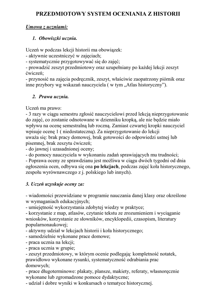 PRZEDMIOTOWY SYSTEM OCENIANIA Z HISTORII Umowa z uczniami: 1. Obowiązki ucznia. Uczeń w podczas lekcji historii ma obowiązek: - aktywnie uczestniczyć w zajęciach; - systematycznie przygotowywać się do zajęć; - prowadzić zeszyt przedmiotowy oraz uzupełniany po każdej lekcji zeszyt ćwiczeń; - przynosić na zajęcia podręcznik, zeszyt, właściwie zaopatrzony piórnik oraz inne przybory wg wskazań nauczyciela ( w tym „Atlas historyczny”). 2. Prawa ucznia. Uczeń ma prawo: - 3 razy w ciągu semestru zgłosić nauczycielowi przed lekcją nieprzygotowanie do zajęć, co zostanie odnotowane w dzienniku kropką, ale nie będzie miało wpływu na ocenę semestralną lub roczną. Zamiast czwartej kropki nauczyciel wpisuje ocenę 1 ( niedostateczną). Za nieprzygotowanie do lekcji uważa się: brak pracy domowej, brak gotowości do odpowiedzi ustnej lub pisemnej, brak zeszytu ćwiczeń; - do jawnej i uzasadnionej oceny; - do pomocy nauczyciela w wykonaniu zadań sprawiających mu trudności; - Poprawa oceny ze sprawdzianu jest możliwa w ciągu dwóch tygodni od dnia ogłoszenia ocen, odbywa się ona po lekcjach, podczas zajęć koła historycznego, zespołu wyrównawczego z j. polskiego lub innych). 3. Uczeń uzyskuje oceny za: - wiadomości przewidziane w programie nauczania danej klasy oraz określone w wymaganiach edukacyjnych; - umiejętność wykorzystania zdobytej wiedzy w praktyce; - korzystanie z map, atlasów, czytanie tekstu ze zrozumieniem i wyciąganie wniosków, korzystanie ze słowników, encyklopedii, czasopism, literatury popularnonaukowej; - aktywny udział w lekcjach historii i koła historycznego; - samodzielnie wykonane prace domowe; - praca ucznia na lekcji; - praca ucznia w grupie; - zeszyt przedmiotowy, w którym ocenie podlegają: kompletność notatek, prawidłowo wykonane rysunki, systematyczność odrabiania prac domowych; - prace długoterminowe: plakaty, plansze, makiety, referaty, własnoręcznie wykonane lub zgromadzone pomoce dydaktyczne; - udział i dobre wyniki w konkursach o tematyce historycznej. - zasadniczy wpływ na oceny końcowe mają stopnie ze sprawdzianów, kartkówek i odpowiedzi ustnych. - wszystkie oceny są jawne, a ocenione prace pisemne przechowywane są przez nauczyciela w klasowym segregatorze przez cały rok szkolny i udostępniane do wglądu dla ucznia i jego rodziców lub prawnych opiekunów. 4. Formy aktywności. Sposób zapisu w dzienniku. 1. Aktywny udział w zajęciach zaznaczany jest plusami (w rubryce oznaczonej „A”). Sumują się one odpowiednio: • W przypadku ucznia kl. IV: trzy plusy odnotowane zostają obok nich jako ocena bardzo dobra (5); • W przypadku ucznia kl. V: cztery plusy odnotowane zostają obok nich jako ocena bardzo dobra (5); • W przypadku ucznia kl. VI: pięć plusów odnotowanych zostaje obok nich jako ocena bardzo dobra (5). 2. W przypadku celowej negatywnej aktywności ( braku uwagi własnej spowodowanej innymi czynnościami niż wskazane podczas zajęć, rozpraszania uczniów itp. ) nauczyciel odnotowuje ten fakt wpisując kropkę (w rubryce oznaczonej „A”). Zamiast czwartej kropki nauczyciel wpisuje ocenę 1 (niedostateczną). 3. Możliwe jest także uzyskanie ocen przez uczniów podczas zajęć pozalekcyjnych. Są one wówczas odnotowane w dzienniku zajęć pozalekcyjnych, a następnie wpisane do dziennika klasowego. 5. Sprawdziany pisemne: 1. Sprawdziany pisemne są obowiązkowe. Są to prace klasowe trwające 45 minut poprzedzone zapowiedzią na tydzień przed terminem pisania sprawdzianu. 2. Jeżeli uczeń nie pisał sprawdzianu z powodu usprawiedliwionej nieobecności, powinien zrobić to w ciągu 2 tygodni od dnia powrotu do szkoły. 3. Jeżeli uczeń z przyczyn nieusprawiedliwionych nie napisze sprawdzianu w terminie lub nie odda sprawdzianu po zakończeniu pisania, to otrzymuje ocenę niedostateczną. 4. Uczeń może poprawić ocenę niedostateczną otrzymaną ze sprawdzianu w ciągu 2 tygodni od dnia oddania ocenionych prac. Wpływ na ocenę semestralną ma wtedy ocena uzyskana z poprawy. 5. Kartkówki, czyli 10- 15 minutowe prace pisemne z ostatniej lekcji nie muszą być zapowiadane. 6. Oceny z kartkówek i odpowiedzi pisemnych nie podlegają poprawie. 6. Zasady wystawiania ocen semestralnych i rocznych: a) ocenę celującą otrzymuje uczeń, który: - opanował 100 % wiadomości i umiejętności przewidzianych w programie danej klasy i biegle się nimi posługuje w sytuacjach typowych i nietypowych; - aktywnie uczestniczy w zajęciach, wykazuje się inicjatywą; - systematycznie przygotowuje się do zajęć; - prowadzi zeszyt przedmiotowy i zeszyt ćwiczeń; - przynosi na lekcje potrzebne przybory i pomoce; - sprawnie pracuje w grupie, organizuje zajęcia grupowe, chętnie służy pomocą kolegom; - starannie przygotowuje prace długoterminowe, np. plakaty, referaty lub prowadzi zeszyt zainteresowań o tematyce historycznej; - chętnie bierze udział w konkursach o tematyce historycznej i osiąga w nich sukcesy. b) ocenę bardzo dobrą otrzymuje uczeń, który: - opanował w odpowiednim zakresie wiadomości i umiejętności przewidziane w programie danej klasy i potrafi wykorzystać je w sytuacjach typowych i nietypowych; - aktywnie uczestniczy w zajęciach; - systematycznie przygotowuje się do zajęć; - prowadzi zeszyt przedmiotowy i zeszyt ćwiczeń; - przynosi na lekcje potrzebne przybory i pomoce; - sprawnie pracuje w grupie, organizuje zajęcia grupowe; - starannie przygotowuje prace długoterminowe, np. plakaty, referaty; - chętnie bierze udział w konkursach o tematyce historycznej. c) ocenę dobrą otrzymuje uczeń, który: - opanował w odpowiednim zakresie wiadomości i umiejętności przewidziane w programie danej klasy i potrafi wykorzystać je w sytuacjach typowych, a przy pomocy nauczyciela- także w nietypowych; - aktywnie uczestniczy w zajęciach; - systematycznie przygotowuje się do zajęć; - starannie prowadzi zeszyt przedmiotowy i zeszyt ćwicze