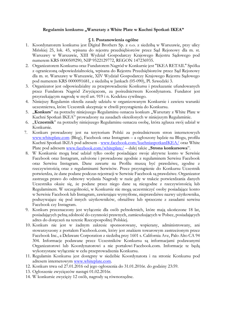 Regulamin konkursu „Warsztaty z White Plate w Kuchni Spotkań IKEA” § 1. Postanowienia ogólne 1. Koordynatorem konkursu jest Digital Brothers Sp. z o.o. z siedzibą w Warszawie, przy ulicy Mińskiej 25, lok. 45, wpisana do rejestru przedsiębiorców przez Sąd Rejonowy dla m. st. Warszawy w Warszawie, XIII Wydział Gospodarczy Krajowego Rejestru Sądowego pod numerem KRS 0000509290, NIP 9522129772, REGON 147236935. 2. Organizatorem Konkursu oraz Fundatorem Nagród w Konkursie jest "IKEA RETAIL" Spółka z ograniczoną odpowiedzialnością, wpisana do Rejestru Przedsiębiorców przez Sąd Rejonowy dla m. st. Warszawy w Warszawie, XIV Wydział Gospodarczy Krajowego Rejestru Sądowego pod numerem KRS 0000091681, z siedzibą w Jankach (05-090), Pl. Szwedzki 3. 3. Organizator jest odpowiedzialny za przeprowadzenie Konkursu i przekazanie ufundowanych przez Fundatora Nagród Zwycięzcom, za pośrednictwem Koordynatora. Fundator jest przyrzekającym nagrodę w myśl art. 919 i n. Kodeksu cywilnego. 4. Niniejszy Regulamin określa zasady udziału w organizowanym Konkursie i zawiera warunki uczestnictwa, które Uczestnik akceptuje w chwili przystąpienia do Konkursu. 5. „Konkurs” na potrzeby niniejszego Regulaminu oznacza konkurs „Warsztaty z White Plate w Kuchni Spotkań IKEA” prowadzony na zasadach określonych w niniejszym Regulaminie. 6. „Uczestnik” na potrzeby niniejszego Regulaminu oznacza osobę, która zgłasza swój udział w Konkursie. 7. Konkurs prowadzony jest na terytorium Polski za pośrednictwem stron internetowych www.whiteplate.com (Blog), Facebook oraz Instagram – a ogłoszony będzie na Blogu, profilu Kuchni Spotkań IKEA pod adresem - www.facebook.com/kuchniaspotkanIKEA/ oraz White Plate pod adresem www.facebook.com/whiteplate/ – dalej także „Strona konkursowa”. 8. W Konkursie mogą brać udział tylko osoby posiadające swoje aktywne konto w Serwisie Facebook oraz Instagram, założone i prowadzone zgodnie z regulaminem Serwisu Facebook oraz Serwisu Instagram. Dane zawarte na Profilu muszą być prawdziwe, zgodne z rzeczywistością oraz z regulaminami Serwisów. Przez przystąpienie do Konkursu Uczestnik potwierdza, że dane podane podczas rejestracji w Serwisie Facebook są prawdziwe. Organizator zastrzega prawo do odmowy wydania Nagrody w razie gdy w trakcie potwierdzania danych Uczestnika okaże się, że podane przez niego dane są niezgodne z rzeczywistością lub Regulaminem. W szczególności, w Konkursie nie mogą uczestniczyć osoby posiadające konto w Serwisie Facebook lub Instagram, zawierające wymyślone, nieprawdziwe nazwy użytkownika, podszywające się pod innych użytkowników, obraźliwe lub sprzeczne z zasadami serwisu Facebook czy Instagram. 9. Konkurs przeznaczony jest wyłącznie dla osób pełnoletnich, które mają ukończone 18 lat, posiadających pełną zdolność do czynności prawnych, zamieszkujących w Polsce, posiadających adres do doręczeń na terenie Rzeczpospolitej Polskiej. 10. Konkurs nie jest w żadnym zakresie sponsorowany, wspierany, administrowany, ani stowarzyszony z portalem Facebook.com, który jest znakiem towarowym zastrzeżonym przez Facebook Inc., a Delaware Corporation z siedzibą przy 1601 s. California Ave, Palo Alto CA 94 304. Informacje podawane przez Uczestników Konkursu są informacjami podawanymi Organizatorowi lub Koordynatorowi a nie portalowi Facebook.com. Informacje te będą wykorzystane wyłącznie w celu przeprowadzenia Konkursu. 11. Regulamin Konkursu jest dostępny w siedzibie Koordynatora i na stronie Konkursu pod adresem internetowym www.whiteplate.com. 12. Konkurs trwa od 27.01.2016 od jego ogłoszenia do 31.01.2016r. do godziny 23:59. 13. Ogłoszenie zwycięzców nastąpi 01.02.2016r. 14. W konkursie zwycięży 12 osób, nagrody są równorzędne. 15. Zgłoszenie konkursowe powinno być otagowane #kuchniaspotkan i #najpiekniejszespotkanieprzystole, oznaczone @kuchniaspotkan (Instagram) oraz oznaczone w miejscu Kuchnia Spotkań IKEA (Facebook) 1. 2. 3. 4. 5. 6. 1. 2. 3. 4. 5. § 2. Uczestnictwo w Konkursie Uczestnictwo w Konkursie jest nieodpłatne i dobrowolne. W Konkursie nie mogą brać udziału pracownicy Organizatora, Koordynatora lub podmiotów biorących udział w organizacji Konkursu oraz członkowie ich najbliższych rodzin oraz osoby pozostające z takimi osobami w faktycznym pożyciu. Za członków najbliższej rodziny uznaje się wstępnych, zstępnych, rodzeństwo, małżonków i osoby pozostające w stosunku przysposobienia. W Konkursie można brać udział wyłącznie osobiście, tj. niedopuszczalne jest tworzenie kont i dokonywanie zgłoszeń konkursowych w imieniu osób trzecich ani z wykorzystaniem wielu kont. Celem zapewnienia prawidłowej organizacji i przebiegu Konkursu, a w szczególności w celu dokonania oceny prawidłowości zgłoszeń do Konkursu oraz dokonania wyboru zwycięzców Konkursu, Organizator powoła komisję konkursową („Komisja Konkursowa”). W skład Komisji Konkursowej wejdą trzy osoby delegowane przez Organizatora lub Koordynatora. Przewodniczącą Komisji Konkursowej jest Eliza Mórawska. Zgłoszenie uczestnictwa w Konkursie następuje przez opublikowanie opisu lub zdjęcia w Serwisie Facebook lub Instagram lub też na prywatnym blogu oraz oznaczenie zgłoszenia #kuchniaspotkan, @kuchniaspotkan, #najpiekniejszespotkanieprzystole celem jego identyfikacji. Opublikowanie zgłoszenia oraz jego jasne oznaczenie jest równoznaczne z wyrażeniem chęci wzięcia udziału w konkursie i akceptacją Regulaminu. § 3. Zasady Konkursu Zadaniem konkursowym jest opisanie lub sfotografowanie zagadnienia „Najpiękniejsze spotkanie przy stole, o którym zawsze będę pamiętać” Po wyborze Zwycięzców, Komisja skontaktuje się z nimi za pośrednictwem wiadomości na Blogu, na Facebooku oraz na Instagramie prosząc o wysłanie danych osobowych umożliwiających kontakt na adres: [email protected]. Aby uzyskać prawo do Nagrody należy odpowiedzi