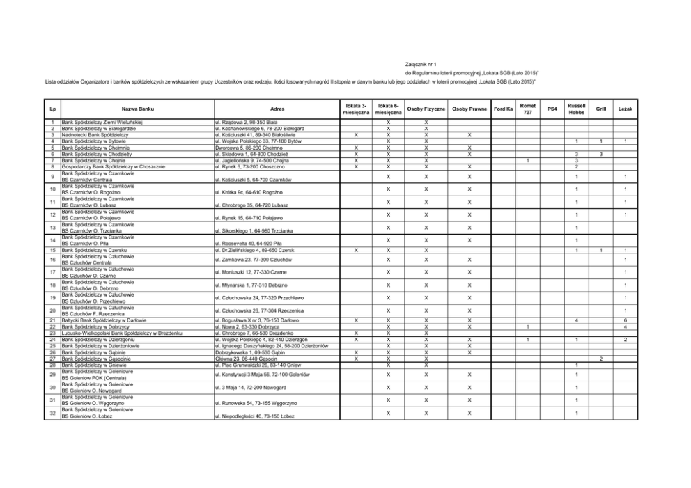 Załącznik nr 1 do Regulaminu loterii promocyjnej „Lokata SGB (Lato 2015)” Lista oddziałów Organizatora i banków spółdzielczych ze wskazaniem grupy Uczestników oraz rodzaju, ilości losowanych nagród II stopnia w danym banku lub jego oddziałach w loterii promocyjnej „Lokata SGB (Lato 2015)” Lp 1 2 3 4 5 6 7 8 9 10 11 12 13 14 15 16 17 18 19 20 21 22 23 24 25 26 27 28 29 30 31 32 Nazwa Banku Bank Spółdzielczy Ziemi Wieluńskiej Bank Spółdzielczy w Białogardzie Nadnotecki Bank Spółdzielczy Bank Spółdzielczy w Bytowie Bank Spółdzielczy w Chełmnie Bank Spółdzielczy w Chodzieży Bank Spółdzielczy w Chojnie Gospodarczy Bank Spółdzielczy w Choszcznie Bank Spółdzielczy w Czarnkowie BS Czarnków Centrala Bank Spółdzielczy w Czarnkowie BS Czarnków O. Rogoźno Bank Spółdzielczy w Czarnkowie BS Czarnków O. Lubasz Bank Spółdzielczy w Czarnkowie BS Czarnków O. Połajewo Bank Spółdzielczy w Czarnkowie BS Czarnków O. Trzcianka Bank Spółdzielczy w Czarnkowie BS Czarnków O. Piła Bank Spółdzielczy w Czersku Bank Spółdzielczy w Człuchowie BS Człuchów Centrala Bank Spółdzielczy w Człuchowie BS Człuchów O. Czarne Bank Spółdzielczy w Człuchowie BS Człuchów O. Debrzno Bank Spółdzielczy w Człuchowie BS Człuchów O. Przechlewo Bank Spółdzielczy w Człuchowie BS Człuchów F. Rzeczenica Bałtycki Bank Spółdzielczy w Darłowie Bank Spółdzielczy w Dobrzycy Lubusko-Wielkopolski Bank Spółdzielczy w Drezdenku Bank Spółdzielczy w Dzierzgoniu Bank Spółdzielczy w Dzierżoniowie Bank Spółdzielczy w Gąbinie Bank Spółdzielczy w Gąsocinie Bank Spółdzielczy w Gniewie Bank Spółdzielczy w Goleniowie BS Goleniów POK (Centrala) Bank Spółdzielczy w Goleniowie BS Goleniów O. Nowogard Bank Spółdzielczy w Goleniowie BS Goleniów O. Węgorzyno Bank Spółdzielczy w Goleniowie BS Goleniów O. Łobez Adres ul. Rządowa 2, 98-350 Biała ul. Kochanowskiego 6, 78-200 Białogard ul. Kościuszki 41, 89-340 Białośliwie ul. Wojska Polskiego 33, 77-100 Bytów Dworcowa 5, 86-200 Chełmno ul. Składowa 1, 64-800 Chodzież ul. Jagiellońska 9, 74-500 Chojna ul. Rynek 6, 73-200 Choszczno lokata 3miesięczna X X X X X ul. Kościuszki 5, 64-700 Czarnków ul. Krótka 9c, 64-610 Rogoźno ul. Chrobrego 35, 64-720 Lubasz lokata 6miesięczna Osoby Fizyczne X X X X X X X X X X X X X X X X X X X X X X Russell Hobbs Grill Leżak 1 1 1 3 X 3 3 2 X 1 1 X 1 1 X 1 1 1 Osoby Prawne Ford Ka Romet 727 PS4 X X X 1 X X X 1 X X X 1 X X X X X ul. Zamkowa 23, 77-300 Człuchów X X X 1 ul. Moniuszki 12, 77-330 Czarne X X X 1 ul. Młynarska 1, 77-310 Debrzno X X X 1 ul. Człuchowska 24, 77-320 Przechlewo X X X 1 ul. Rynek 15, 64-710 Połajewo ul. Sikorskiego 1, 64-980 Trzcianka ul. Roosevelta 40, 64-920 Piła ul. Dr.Zielińskiego 4, 89-650 Czersk X ul. Człuchowska 26, 77-304 Rzeczenica 1 1 X X X X X X X X X X X X X X X X X X X X X ul. Konstytucji 3 Maja 56, 72-100 Goleniów X X X 1 ul. 3 Maja 14, 72-200 Nowogard X X X 1 X X X 1 X X X 1 ul. Bogusława X nr 3, 76-150 Darłowo ul. Nowa 2, 63-330 Dobrzyca ul. Chrobrego 7, 66-530 Drezdenko ul. Wojska Polskiego 4, 82-440 Dzierzgoń ul. Ignacego Daszyńskiego 24, 58-200 Dzierżoniów Dobrzykowska 1, 09-530 Gąbin Główna 23, 06-440 Gąsocin ul. Plac Grunwaldzki 26, 83-140 Gniew ul. Runowska 54, 73-155 Węgorzyno ul. Niepodległości 40, 73-150 Łobez X X X X X X X X 1 1 1 4 6 4 1 2 1 1 2 1 33 34 35 36 37 38 39 40 41 42 43 44 45 46 47 48 49 50 51 52 53 54 55 56 57 58 59 60 61 62 63 64 65 66 67 68 69 70 71 Bank Spółdzielczy w Goleniowie BS Goleniów O. Chociwel Bank Spółdzielczy w Goleniowie BS Goleniów O. Maszewo Gospodarczy Bank Spółdzielczy w Gorzowie Wielkopolskim Powiatowy Bank Spółdzielczy w Gostyniu Bank Spółdzielczy w Grabowie Bank Spółdzielczy w Grębocinie Bank Spółdzielczy w Grodzisku Wielkopolskim Bank Spółdzielczy w Gryficach BS Gryfice Centrala Bank Spółdzielczy w Gryficach BS Gryfice O. Golczewo Bank Spółdzielczy w Gryficach BS Gryfice O. Karnice Bank Spółdzielczy w Gryficach BS Gryfice O. Resko Bank Spółdzielczy w Gryficach BS Gryfice F. Przybiernów Bank Spółdzielczy w Gryficach BS Gryfice F. Brojce Bank Spółdzielczy w Gryficach BS Gryfice F. Płoty Bank Spółdzielczy w Gryfinie Bank Spółdzielczy w Inowrocławiu Piastowski Bank Spółdzielczy w Janikowie Bank Spółdzielczy w Jarocinie Bank Spółdzielczy w Jastrowiu BS Jastrowie Centrala Bank Spółdzielczy w Jastrowiu BS Jastrowie O. Szczecinek Bank Spółdzielczy w Jutrosinie BS Jutrosin Centrala Bank Spółdzielczy w Jutrosinie BS Jutrosin O. Pakosław Bank Spółdzielczy w Kaliszu Pomorskim Bank Spółdzielczy w Kcyni Bank Spółdzielczy w Kłodawie Bank Spółdzielczy w Kobierzycach Bank Spółdzielczy w Koninie Bank Spółdzielczy w Koronowie Bank Spółdzielczy w Kostrzynie Bank Spółdzielczy w Kościanie Bank Spółdzielczy w Kościerzynie Bank Spółdzielczy w Kowalu Bank Spółdzielczy w Kowalewie Pomorskim Bank Spółdzielczy Ziemi Kaliskiej Bank Spółdzielczy w Krokowej Bank Spółdzielczy w Krokowej BS Krokowa Centrala Bank Spółdzielczy w Krokowej BS Krokowa O. Władysławowo Bank Spółdzielczy w Krokowej BS Krokowa O. Puck Bank Spółdzielczy w Krokowej BS Krokowa O. Luzino ul. Armii Krajowej 41, 73-120 Chociwel ul. Jedności Narodowej 5, 72-130 Maszewo ul. Sikorskiego 7, 66-400 Gorzów Wlkp. ul. 1 Maja 18, 63-800 Gostyń ul. Spółdzielcza 1, 99-150 Grabów ul. Lubicka 2, 87-122 Grębocin ul. Chopina 1, 62-065 Grodzisk Wielkopolski X X X X 1 X X X 1 X X X X X X X X X X X X X 1 3 2 6 1 ul. Pl. Zwycięstwa 5, 72-300 Gryfice X X X X ul. Niepodległości 23, 72-410 Golczewo X X X X 1 ul. 11 Marca 16, 72-343 Karnice X X X X 1 ul. Jedności Narodowej 2/1A, 72-315 Resko X X X X 1 ul. Cisowa 4, 72-110 Przybiernów X X X X 1 ul. Parkowa 9, 72-304 Brojce X X X X 1 ul. Jedności Narodowej 19a, 72-310 Płoty X 1 ul. Niepodległości 24, 74-100 Gryfino ul. Solankowa 11, 88-100 Inowrocław ul. Przemysłowa 4, 88-160 Janiko