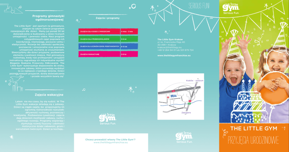 SERIOUS FUN! Programy gimnastyki ogólnorozwojowej The Little Gym® jest opartym na gimnastyce, znanym na całym świecie programem rozwojowym dla dzieci. Mamy już ponad 30 lat doświadczenia w budowaniu u dzieci licznych umiejętności i pewności siebie. Nasz program cotygodniowych zajęć poprawia ich koordynację, równowagę, poczucie rytmu i elastyczność. Rozwija też zdolności społeczne, poznawcze i emocjonalne oraz poprawia umiejętność słuchania ze zrozumieniem. Stworzyliśmy dla dzieci przyjazne, pozbawione elementu rywalizacji miejsce. Mali gimnastycy rozkwitają, kiedy nasi profesjonalni i przyjaźni instruktorzy nagradzają ich indywidualne wysiłki! Bieganie. Skakanie. Przewroty. Odkrywanie. The Little Gym® wykorzystuje dopasowane do wieku, innowacyjne zabawy, które pozwalają wydobyć to co najlepsze z każdego dziecka. Dzieci poznają nowych przyjaciół, dzielą doświadczenia i przede wszystkim bawią się! Zajęcia i programy ZAJĘCIA DLA DZIECI Z RODZICAMI 4 mies - 3 lata ZAJĘCIA DLA PRZEDSZKOLAKÓW 3-6 lat ZAJĘCIA DLA UCZNIÓW SZKÓŁ PODSTAWOWYCH 6-12 lat ZAJĘCIA WAKACYJNE 3-8 lat The Little Gym Krakow ul. ks. Franciszka Maja 40 30-499 • Krakow [email protected] +48 12 264 94 01 lub 501 879 724 www.thelittlegymfranchise.eu Zajęcia wakacyjne Latem nie ma czasu, by się nudzić. W The Little Gym wakacje składają się z zabawy. Dzieci są ciągle zajęte, bo proponujemy im ogromną różnorodność rozrywek: aktywność ruchową, poznawczą i kreatywną. Pozbawione rywalizacji zajęcia dają dzieciom możliwość zabawy, ruchu i ogólnego rozwoju. Programy wspierają i stymulują rozwój fizyczny i zdolności motoryczne dzięki zabawom, grom i warsztatom twórczym. Dzieci je kochają… THE LITTLE GYM Chcesz prowadzić własny The Little Gym®? www.thelittlegymfranchise.eu Przyjęcia urodzinowe Dlaczego nasze przyjęcia są takie wyjątkowe Każde przyjęcie prowadzi dwóch instruktorów. Wasze dzieci będą miały godzinę na korzystanie z całej sali gimnastycznej, gdzie instruktorzy poprowadzą zabawę i ćwiczenia ruchowe, dostosowane do możliwości i wieku dzieci. Wykorzystujemy specjalistyczny sprzęt gimnastyczny (poręcze, równoważnie) oraz klanzę, piłki i obręcze. Po godzinie gier i zabaw w sali gimnastycznej jest czas na tort urodzinowy w naszej specjalnie udekorowanej sali imprezowej. Przyjęcia są prywatne, więc całkowicie skupimy się na Twoim dziecku i jego gościach. My zajmujemy się wszystkimi szczegółami. Ty poprostu przyjdź razem z dziećmi. Witamy w The Little Gym® Cennik Członkowie TLG 855 pln Goście 950 pln 1,5 godziny i do 15 dzieci Każde kolejne dziecko 40 pln Dodatkowe pół godziny 250 pln Bezzwrotny depozyt 175 pln Opłaty naliczane są za dzieci obecne na przyjęciu, niezależnie od liczby zaproszonych gości. Maksymalnie w przyjęciu może uczestniczyć 25 dzieci. My zapewniamy: Dziękujemy za zainteresowanie naszą ofertą urodzinową. Dzieci kochają nasze imprezy urodzinowe, podobnie jak ich rodzice. Imprezy urodzinowe w The Little Gym to czas relaksu i radości. My zajmujemy się wszystkim, a Wy macie do wyłącznej dyspozycji nasz cały klub. Nasze wnętrza i znajdujące się w nich udogodnienia są specjalnie zaprojektowane. Obsługuje je energiczny i serdeczny personel. Na każdej imprezie jest mnóstwo muzyki, ruchu, gier i ZABAWY. My zajmujemy się wszystkim - od przygotowania zaproszeń do sprzątania po przyjęciu. Dzieci korzystają ze świetniej rozrywki, a rodzice mogą po prostu usiąść i cieszyć się chwilą przyjemności. • Całe TLG na wyłączność - lobby i specjalnie przystosowaną salę gimnastyczną oraz darmowy parking. • Jasna i kolorowa przestrzeń z nakryciami dla każdego z dzieci, udekorowana tematycznie. • Co najmniej dwóch profesjonalnych instruktorów prowadzących przyjęcie oraz pomagających w przygotowaniu i sprzątających po przyjęciu. • Soki i sałatkę owocową dla dzieci oraz darmową kawę, herbatę i wodę dla rodziców i gości. • PLUS specjalne zaproszenia The Little Gym PLUS prezent od The Little Gym dla Twojego dziecka PLUS tematy przyjęć do wyboru (Dora/Diego, Piraci TLG, Księżniczki TLG, Superbohaterowie TLG oraz Szalone Przyjęcie TLG) Wy dostarczacie: • Tort urodzinowy • Dodatkowe napoje i przekąski dla dorosłych Zarezerwuj przyjęcie urodzinowe Przyjęcia Urodzinowe dla dzieci od roczku do 12 lat w The Little Gym odbywają się w soboty i w niedziele (za wyjątkiem wakacji). Skontaktuj się z nami, aby zapytać o dostępne terminy Zadzwoń do nas +48 12 264 94 01 lub 501 879 724