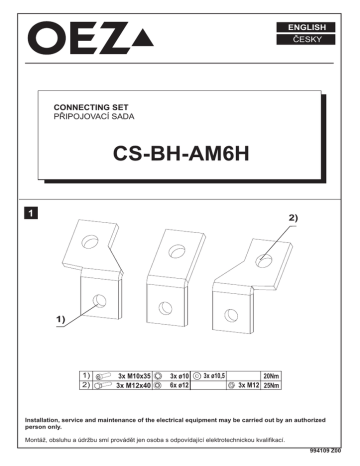 ENGLISH ČESKY CONNECTING SET PŘIPOJOVACÍ SADA CS-BH-AM6H 1 2) 1) 1) 2) 3x M10x35 3x M12x40 3x ø10 6x ø12 3x ø10,5 20Nm 3x M12 25Nm Installation, service and maintenance of the electrical equipment may be carried out by an authorized person only. Montáž, obsluhu a údržbu smí provádět jen osoba s odpovídající elektrotechnickou kvalifikací. 994109 Z00 2 FIXED DESIGN, FRONT CONNECTION. PEVNÉ PROVEDENÍ, PŘEDNÍ PŘÍVOD. 1 OD-BH-KS01 BH630... 2 CS-BH-AM6H BH630... M10x35 20Nm 8mm -2- 994109 Z00 3 CS-BH-AM6H OD-BH-KS01 BH630... 4 CS-BH-AM6H BH630... -3- 994109 Z00 max. 200 mm 5 CS-BH-AM6H BH630... 3 Only materials which have low adverse environmental impact and which do not contain dangerous substances as specified in ROHS directive have been used in the product. Ve výrobku jsou použity materiály s nízkým negativním dopadem na životní prostředí, které neobsahují zakázané nebezpečné látky dle ROHS. -4- 994109 Z00 ESPAÑOL SLOVENSKY ПО-РУССКИ PO POLSKU DEUTSCH CS-BH-AM6H -1- 994109- Z00 Návod k použitiu SLOVENSKY Pripájacia sada (retrofit) - CS-BH-AM6H Montáž, obsluhu a údržbu môže vykonávať iba osoba s odpovedajúcou elektrotechnickou 1 2 3 kvalifikáciou. Pevné prevedenie Vo výrobku sú použite materiály s nízkym negatívnym dopadom na životné prostredie, ktoré neobsahuje zakázané latky podľa ROHS Инструкция по эксплуатации ПО-РУССКИ Присоединительный комплект (ретрофит) - CS-BH-AM6H Установку, обслуживание и уход может проводить только лицо с соответствующей 1 2 3 электротехнической квалификацией. Стационарное исполнение В изделии применены материалы с малым негативным влиянием на окружающую среду, которые не содержат запрещенные опасные вещества, указанные в директиве ROHS. Instrukcja obsługi PO POLSKU Zestaw przyłączy (retrofit) - CS-BH-AM6H Montaż, obsługę i konserwację wykonywać może wyłącznie odpowiednio wykwalifikowana 1 2 3 osoby z branży elektrotechnicznej. Wykonanie stałe W wyrobie zastosowane zostały materiały z niskim negatywnym oddziaływaniem na środowisko naturalne, które nie zawierają zakazanych niebezpiecznych substancji zgodnie z ROHS. Gebrauchsanweisung DEUTSCH Anschlusssatz (Retrofit) - CS-BH-AM6H Die Montage, die Bedienung und Instandhaltung kann nur der Arbeiter mit der 1 2 3 entsprechenden elektrotechnischen Qualifikation verrichten. Feste Ausführung Für das Erzeugnis werden Stoffe mit niedrigen negativen Umweltauswirkungen angewandt, die keine verbotenen gefährlichen Stoffe nach ROHS enthalten. Instrucciones de uso ESPAÑOL Juego de conexión (retrofit) - CS-BH-AM6H El montaje, servicio y mantenimiento puede realizar únicamente la persona con la 1 2 3 cualificación electrotécnica correspondiente. Versión fija En el producto están usados los materiales que tienen incidencia negativa baja al medio ambiente, que no incluyen las materias peligrosas prohibidas según ROHS. -2- 994109- Z00