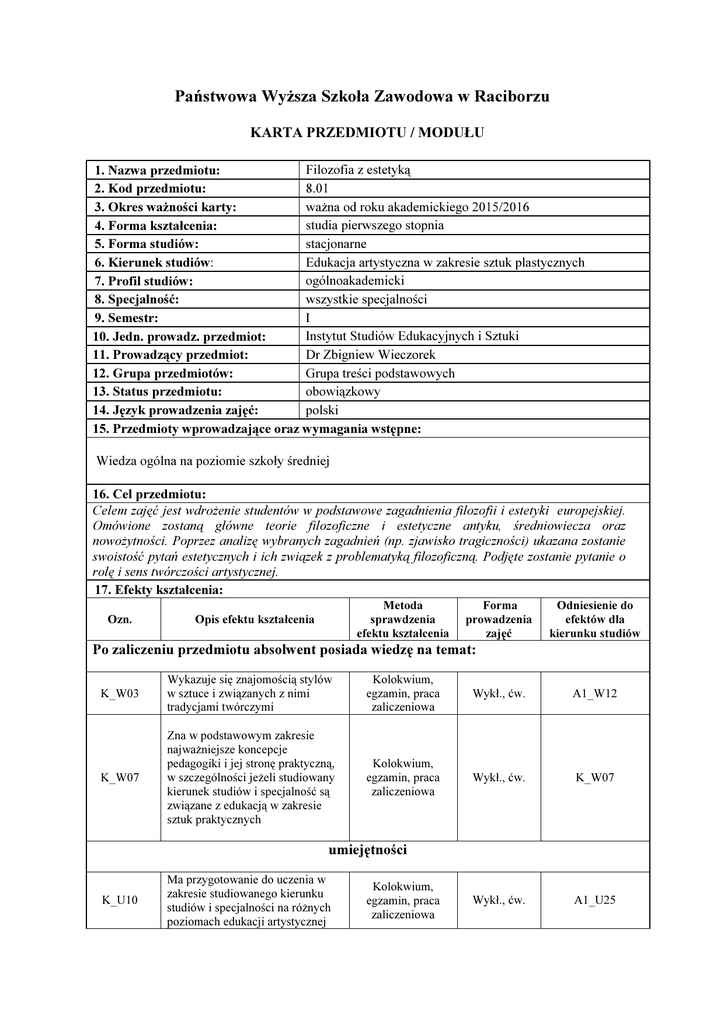 Państwowa Wyższa Szkoła Zawodowa w Raciborzu KARTA PRZEDMIOTU / MODUŁU Filozofia z estetyką 1. Nazwa przedmiotu: 8.01 2. Kod przedmiotu: ważna od roku akademickiego 2015/2016 3. Okres ważności karty: studia pierwszego stopnia 4. Forma kształcenia: stacjonarne 5. Forma studiów: 6. Kierunek studiów: Edukacja artystyczna w zakresie sztuk plastycznych ogólnoakademicki 7. Profil studiów: wszystkie specjalności 8. Specjalność: I 9. Semestr: Instytut Studiów Edukacyjnych i Sztuki 10. Jedn. prowadz. przedmiot: Dr Zbigniew Wieczorek 11. Prowadzący przedmiot: 12. Grupa przedmiotów: Grupa treści podstawowych 13. Status przedmiotu: obowiązkowy 14. Język prowadzenia zajęć: polski 15. Przedmioty wprowadzające oraz wymagania wstępne: Wiedza ogólna na poziomie szkoły średniej 16. Cel przedmiotu: Celem zajęć jest wdrożenie studentów w podstawowe zagadnienia filozofii i estetyki europejskiej. Omówione zostaną główne teorie filozoficzne i estetyczne antyku, średniowiecza oraz nowożytności. Poprzez analizę wybranych zagadnień (np. zjawisko tragiczności) ukazana zostanie swoistość pytań estetycznych i ich związek z problematyką filozoficzną. Podjęte zostanie pytanie o rolę i sens twórczości artystycznej. 17. Efekty kształcenia: Ozn. Metoda sprawdzenia efektu kształcenia Opis efektu kształcenia Forma prowadzenia zajęć Odniesienie do efektów dla kierunku studiów Po zaliczeniu przedmiotu absolwent posiada wiedzę na temat: K_W03 Wykazuje się znajomością stylów w sztuce i związanych z nimi tradycjami twórczymi Kolokwium, egzamin, praca zaliczeniowa Wykł., ćw. A1_W12 K_W07 Zna w podstawowym zakresie najważniejsze koncepcje pedagogiki i jej stronę praktyczną, w szczególności jeżeli studiowany kierunek studiów i specjalność są związane z edukacją w zakresie sztuk praktycznych Kolokwium, egzamin, praca zaliczeniowa Wykł., ćw. K_W07 Wykł., ćw. A1_U25 umiejętności K_U10 Ma przygotowanie do uczenia w zakresie studiowanego kierunku studiów i specjalności na różnych poziomach edukacji artystycznej Kolokwium, egzamin, praca zaliczeniowa K_U08 Posiada umiejętności przygotowania typowych prac pisemnych i wystąpień ustnych, dotyczących zagadnień szczegółowych na temat różnych dziedzin twórczości plastycznej, z wykorzystaniem podstawowych uję teoretycznych, a także różnych źródeł praca zaliczeniowa Wykł., ćw. A1_U22 Kolokwium, praca zaliczeniowa, Wykł., ćw. A1_K04 Kolokwium, egzamin, praca zaliczeniowa, Wykł., ćw. A1_K04 Kompetencje społeczne K_Ks07 K_Ks09 Wykazuje umiejętność samooceny Jest zdolny do podjęcia refleksji na temat społecznych, naukowych i etycznych aspektów związanych z własną pracą. 18. Formy i wymiar zajęć: W. Ćw. L. P. Sem. Prac. art. 19. Treści kształcenia: Wykłady: Tematy filozoficzne : Źródła i obszary badań filozoficznych. Filozofia cierpienia - przypadek Buddy. Początki filozofii w Grecji. Pytania o Arche. Parmenides, Heraklit. Wybrane aspekty filozofii Sokratesa, Platona i Epikura. Podstawy antropologii biblijnej – przypadek Księgi Rodzaju. Wybrane aspekty filozofii św. Augustyna i B. Pascala Wybrane aspekty filozofii G. Bruno, R. Kartezjusza, I. Kanta Tematy z estetyki: Podstawowe pojęcia estetyki: piękno, dzieło sztuki, przeżycie estetyczne. Wybrane zagadnienia estetyki greckiej. Pojęcie kanonu i jego filozoficzne źródło. Wybrane zagadnienia estetyki chrześcijańskiej. Ewangelia jako dzieło sztuki; teologia ikony (estetyka bizantyńska). Wybrane aspekty estetyki nowożytnej. Myśl estetyczna Leonarda da Vinci; Michała Anioła. Podstawy myśli estetycznej I. Kanta. Kilka uwag o współczesnych poszukiwaniach: estetyka egzystencjalistyczna; idee kryzysu sztuki i pojęcia piękna (nietzscheanizm, marksizm). Ćwiczenia: Analiza tekstu przypisywanemu Buddzie. Analiza Obrony Sokratesa i metafory Jaskini Platona. Analiza pism estetycznych Platona, Plotyna, Arystotelesa. Antropologia biblijna. Analiza Księgi Rodzaju. Filozofia chrześcijańska –analiza Wyznań św. Augustyna i Myśli B. Pascala. Estetyka bizantyńska – m.in. analiza pism Pseudo-Dionizego i fragmentów filmu Andrieja Tarkowskiego pt . Andriej Rublow. Estetyka Odrodzenia – analiza pism estetycznych Michała Anioła i Leonarda da Vinci. Lokalne inspiracje - dyskusja nad działalnością raciborskiego filozofa Hugo Christopha na podstawie filmu. Analiza wybranych tekstów z estetyki współczesnej – W. Sołowjow ( Ogólny sens sztuki,); M. Heideger ( Źródło dzieła sztuki), A. Camus, (Artysta i jego epoka.) Prezentacje studentów na wybrane tematy z filozofii i estetyki. 20. Egzamin: 21. Literatura podstawowa: pisemny Wskazane fragmenty następujących prac : materiały ze strony : http://www.filozofia-moja.republika.pl/filozofia.htm oraz http://www.filozofia-moja.republika.pl/estetyka.html K. Ajdukiewicz, Zagadnienia i kierunki filozofii” Kęty-Warszawa 2003; A. Anzenbauer, Wprowadzenie do filozofii, Kraków 2003; Wł. Tatarkiewicz, Historia filozofii” t. I-III; * Platon, Państwo, Obrona Sokratesa; L. Kołakowski, O co nas pytają wielcy filozofowie, Kraków 2004. O tragedii i tragiczności, Arystoteles, Hume, Scheler, Kraków 1976; W. Tatarkiewicz. Historia estetyki, t. I-III; * * brak daty publikacji pozycji oznacza dopuszczenie dowolnego wydania 21. Literatura uzupełniająca: Św. Augustyn, Wyznania; * B. Pascal, Myśli; * P. Krakowski, O sztuce nowej i najnowszej, Warszawa 1981;M. Jackowski, Sztuka zwana naiwną, Warszawa 1995; A. Camus, Artysta i jego epoka, [w:] tenże, Eseje, Warszawa 1974; M. Heidegger, Źródło dzieła sztuki, [w:] tenże Drogi lasu, W-wa 1997; 23. Nakład pracy studenta potrzebny do osiągnięcia efektów kształcenia: Liczba godzin Lp. Forma zajęć kontaktowych / pracy studenta 15/15 1 Wykład 15/15 2 Ćwiczenia 3 Laboratorium 4 Projekt 5 Seminarium 6 Pracownia artystyczna 7 Praca własna studenta Suma godzin 24. Suma wszystkich godzin: 60 25. Licz