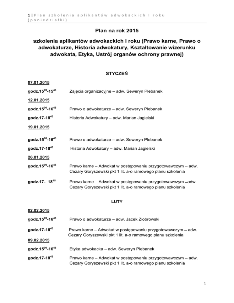 1|Plan szkolenia aplikantów adwokackich I roku (poniedziałki) Plan na rok 2015 szkolenia aplikantów adwokackich I roku (Prawo karne, Prawo o adwokaturze, Historia adwokatury, Kształtowanie wizerunku adwokata, Etyka, Ustrój organów ochrony prawnej) STYCZEŃ 07.01.2015 godz.1500-1545 Zajęcia organizacyjne ‒ adw. Seweryn Plebanek 12.01.2015 godz.1500-1645 Prawo o adwokaturze ‒ adw. Seweryn Plebanek godz.17-1845 Historia Adwokatury ‒ adw. Marian Jagielski 19.01.2015 godz.1500-1645 Prawo o adwokaturze ‒ adw. Seweryn Plebanek godz.17-1845 Historia Adwokatury ‒ adw. Marian Jagielski 26.01.2015 godz.1500-1645 Prawo karne ‒ Adwokat w postępowaniu przygotowawczym ̶ adw. Cezary Goryszewski pkt 1 lit. a-o ramowego planu szkolenia godz.17- 1845 Prawo karne ‒ Adwokat w postępowaniu przygotowawczym ̶ adw. Cezary Goryszewski pkt 1 lit. a-o ramowego planu szkolenia LUTY 02.02.2015 godz.1500-1645 godz.17-1845 Prawo o adwokaturze ‒ adw. Jacek Ziobrowski Prawo karne ‒ Adwokat w postępowaniu przygotowawczym ̶ adw. Cezary Goryszewski pkt 1 lit. a-o ramowego planu szkolenia 09.02.2015 godz.1500-1645 Etyka adwokacka ‒ adw. Seweryn Plebanek godz.17-1845 Prawo karne ‒ Adwokat w postępowaniu przygotowawczym ̶ adw. Cezary Goryszewski pkt 1 lit. a-o ramowego planu szkolenia 1 2|Plan szkolenia aplikantów adwokackich I roku (poniedziałki) 16.02.2015 godz.1500-1645 Etyka adwokacka ‒ adw. Seweryn Plebanek godz.17-1845 Prawo karne ‒ Adwokat w postępowaniu przygotowawczym ̶ adw. Cezary Goryszewski pkt 1 lit. a-o ramowego planu szkolenia 23.02.2015 godz.1500-1645 Etyka adwokacka ‒ adw. Seweryn Plebanek godz.17-1845 Prawo karne ‒ Adwokat w postępowaniu przygotowawczym ̶ adw. Cezary Goryszewski pkt 1 lit. a-o ramowego planu szkolenia MARZEC 02.03.2015 godz.1500-1645 Prawo o adwokaturze/Kształtowanie wizerunku adwokata ‒ adw. Seweryn Plebanek godz.17-1845 Prawo karne ‒ Adwokat w postępowaniu przygotowawczym ̶ adw. Cezary Goryszewski pkt 1 lit. a-o ramowego planu szkolenia 09.03.2015 godz.1500-1845 Adwokat przed sądem I instancji ‒ adw. dr Tomasz Razowski pkt 2 lit. a, g, i, j, k, w 16.03.2015 godz.1500-1845 Adwokat przed sądem I instancji ‒ adw. Wojciech Małek pkt 2 lit. b-f, h, l-p 23.03.2015 godz.1500-1845 Adwokat przed sądem I instancji ‒ adw. dr Tomasz Razowski pkt 2 lit. a, g, i, j, k, w 30.03.2015 godz.1500-1845 Adwokat przed sądem I instancji ‒ adw. Wojciech Małek pkt 2 lit. b-f, l-p KWIECIEŃ 13.04.2015 godz.1500-1930 Adwokat przed sądem II instancji ‒ adw. Henryk Stabla pkt 3 lit. a-g 2 3|Plan szkolenia aplikantów adwokackich I roku (poniedziałki) 20.04.2015 godz.1500-1930 Adwokat przed sądem I instancji ‒ adw. dr Marek Bielski, adw. dr Ewa Plebanek pkt 2 lit. q-v, x, y 27.04.2015 godz.1500-1845 Adwokat przed sądem I instancji ‒ adw. Wojciech Małek pkt 2 lit. b-f, l-p MAJ 04.05.2015 godz.1500-1930 Adwokat przed sądem I instancji ‒ adw. dr Marek Bielski, adw. dr Ewa Plebanek pkt 2 lit. q-v, x, y 11.05.2015 godz.1500-1930 Adwokat przed sądem II instancji ‒ adw. Henryk Stabla pkt 3 lit. a-g 18.05.2015 godz.1500-1930 Adwokat przed sądem I instancji ‒ adw. dr Marek Bielski, adw. dr Ewa Plebanek pkt 2 lit. q-v, x, y 25.05.2015 godz.1500-1930 Adwokat przed sądem II instancji ‒ adw. Henryk Stabla pkt 3 lit. a-g CZERWIEC 01.06.2015 godz.1500-1930 Prawo karne skarbowe ‒ adw. dr Tomasz Razowski pkt 6 lit. a-c 08.06.2015 godz.1500-1930 Postępowanie karne wykonawcze ‒ SSR Tomasz Huminiak pkt 5 lit. a-d 15.06.2015 godz.1500-18,45 Odpowiedzialność karna w wybranych aktach prawnych ‒ adw. Wojciech Małek pkt 8 lit. a-d 22.06.2015 godz.1500-1930 Adwokat przed sądem I instancji ‒ adw. dr Marek Bielski, dr Ewa Plebanek pkt 2 lit. q-v, x,y 3 4|Plan szkolenia aplikantów adwokackich I roku (poniedziałki) LIPIEC 13.07.2015 godz. 900-1700 Sprawdzian: Prawo o adwokaturze, Historia adwokatury, Kształtowanie wizerunku adwokata, Etyka, Ustrój organów ochrony prawnej WRZESIEŃ 07.09.2015 godz.1500-1845 Nadzwyczajne środki zaskarżenia ‒ adw. Wojciech Małek pkt 4 lit. a-b 15.09.2015( wtorek) godz.1500-1845 Kodeks wykroczeń i Kodeks postępowania w sprawach o wykroczenia (obrońca w sprawie o wykroczenie) ‒ adw. dr Tomasz Razowski pkt 7 21.09.2015 godz.1500-1845 Nadzwyczajne środki zaskarżenia ‒ adw. Wojciech Małek pkt 4 lit. a-b 28.09.2015 godz.1500-1845 Obrót prawny z zagranicą w sprawach karnych (postępowanie w sprawach karnych ze stosunków międzynarodowych) ‒ adw. Wojciech Małek pkt 9 lit. a-i PAŹDZIERNIK 05.10.2015 godz.1500-1845 Obrót prawny z zagranicą w sprawach karnych (postępowanie w sprawach karnych ze stosunków międzynarodowych) ‒ adw. Wojciech Małek pkt 9 lit. a-i .................................................................................................................................................... 122 godz. zajęć +18 godz. zajęć w ramach niżej opisanych porozumień ....................................................................................... 140 godz. zajęć Zgodnie z porozumieniem ORA w Opolu z Prezesem Sądu Okręgowego w Opolu z dnia 3.12.2014r. oraz porozumieniem ORA w Opolu z Prokuratorem Okręgowym w Opolu z dnia 3.12.2014r. zawartymi na podstawie Porozumienia w sprawie odbywania przez aplikantów adwokackich szkolenia 4 5|Plan szkolenia aplikantów adwokackich I roku (poniedziałki) z zakresu działania sądownictwa powszechnego i prokuratury pomiędzy Krajową Szkołą Sądownictwa i Prokuratury a Naczelną Radą Adwokacką z dnia 27 listopada 2014 roku aplikanci adwokaccy Izby Adwokackiej w Opolu odbędą na przełomie czerwca i i lipca 2015 szkolenie z zakresu ustroju organów ochrony prawnej: 12 godzin zajęć w Sądzie Okręgowym w Opolu i 6 godzin zajęć w Prokuraturze Okręgowej w Opolu. LISTOPAD 02.11.2015 - Kolokwium pisemne 05.11.2015 - Kolokwium ustne 26.11.2015 - Kolokwium poprawkowe pisemne i ustne 5