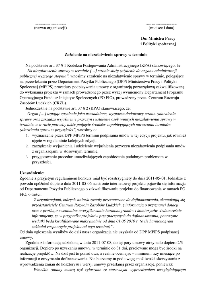 (nazwa organizacji) (miejsce i data) Do: Ministra Pracy i Polityki społecznej Zażalenie na niezałatwienie sprawy w terminie Na podstawie art. 37 § 1 Kodeksu Postępowania Administracyjnego (KPA) stanowiącego, że: „Na niezałatwienie sprawy w terminie […] stronie służy zażalenie do organu administracji publicznej wyższego stopnia”, wnosimy zażalenie na niezałatwienie sprawy w terminie, polegające na przewlekaniu przez Departament Pożytku Publicznego (DPP) Ministerstwa Pracy i Polityki Społecznej (MPiPS) procedury podpisywania umowy z organizacją pozarządową zakwalifikowaną do wykonania projektu w ramach prowadzonego przez wyżej wymieniony Departament Programu Operacyjnego Fundusz Inicjatyw Społecznych (PO FIO), prowadzony przez Centrum Rozwoju Zasobów Ludzkich (CRZL). Jednocześnie na podstawie art. 37 § 2 (KPA) stanowiącego, że: „Organ […] uznając zażalenie jako uzasadnione, wyznacza dodatkowy termin załatwienia sprawy oraz zarządza wyjaśnienie przyczyn i ustalenie osób winnych niezałatwienia sprawy w terminie, a w razie potrzeby także podjęcie środków zapobiegających naruszaniu terminów załatwiania spraw w przyszłości”, wnosimy o: 1. wyznaczenie przez DPP MPiPS terminu podpisania umów w tej edycji projektu, jak również ujęcie w regulaminie kolejnych edycji, 2. zarządzenie wyjaśnienia i udzielenie wyjaśnienia przyczyn niezałatwienia podpisania umów z organizacjami w stosownym terminie, 3. przygotowanie procedur umożliwiających zapobieżenie podobnym problemom w przyszłości. Uzasadnienie: Zgodnie z przyjętym regulaminem konkurs miał być rozstrzygnięty do dnia 2011-05-01. Jednakże z powodu opóźnień dopiero dnia 2011-05-06 na stronie internetowej projektu pojawiła się informacja od Departamentu Pożytku Publicznego o zakwalifikowaniu projektu do finansowania w ramach PO FIO, o treści: „Z organizacjami, których wnioski zostały przeznaczone do dofinansowania, skontaktują się przedstawiciele Centrum Rozwoju Zasobów Ludzkich, z informacją o przyznanej dotacji oraz z prośbą o ewentualne zweryfikowanie harmonogramów i kosztorysów. Jednocześnie informujemy, że w przypadku projektów przeznaczonych do dofinansowania, ponoszone wydatki będą kwalifikowane maksymalnie od dnia 01.05.2010 r. (o ile harmonogram zakładał rozpoczęcie projektu od tego terminu)” . Od dnia ogłoszenia wyników do dziś nasza organizacja nie uzyskała od DPP MPiPS podpisanej umowy. Zgodnie z informacją udzieloną w dniu 2011-07-08, do tej pory umowy otrzymało dopiero 2/3 organizacji. Dopiero po uzyskaniu umowy, w terminie do 31 dni, przelewane mogą być środki na realizację projektów. Na dziś jest to ponad dwa, a realnie oceniając – minimum trzy miesiące po informacji o otrzymaniu dofinansowania. Nie bierzemy tu pod uwagę możliwości skorzystania z wprowadzenia zmian do kosztorysu i wersji umowy przesłanej przez organizację, ponieważ: „Wszelkie zmiany muszą być zgłaszane ze stosownym wyprzedzeniem uwzględniającym poszczególne etapy realizacji zadania” , co dodatkowo może wydłużyć okres oczekiwania na przesłanie środków na konto organizacji. Zgodnie z zasadami przyznawania i rozliczania dotacji w ramach PO FIO w 2011 r. istnieje możliwość: „dofinansowania projektów „jednorocznych” (tj. projektów realizowanych wyłącznie w roku 2011, czyli trwających maksymalnie 8 miesięcy) […] maksymalny czas trwania: od 1 maja 2011 r. do 31 grudnia 2011 r.” . Dla takich projektów opóźnienie od dwóch do czterech miesięcy stanowi minimum 1/4 okresu trwania projektu. Zatem w związku z tym, że dla projektów, zwłaszcza „jednorocznych”, jest to poważne opóźnienie, oraz z tym, że także ewentualne renegocjacje treści umowy wynikające z nieuzasadnionego odwlekania przez biuro odpowiedzialne za PO FIO podpisania umowy to opóźnienie zwiększają, cała sytuacja w sposób znaczny utrudnia organizacji podjęcie prac nad projektem. Ponadto regulamin konkursowy oraz strona PO FIO nie zawierają również żadnych informacji na temat terminów zawierania przez DPP umów z organizacjami zakwalifikowanymi do finansowania w ramach PO FIO, co stanowi według nas rażące naruszenie przepisów, ponieważ oznacza to brak bardzo istotnej dla obsługi konkursu procedury. W związku z powyższym zwracamy się do Ministra Pracy i Polityki Społecznej z prośbą o niezwłoczne rozpatrzenie naszego zażalenia. (pieczęć i podpis przedstawiciela organizacji)