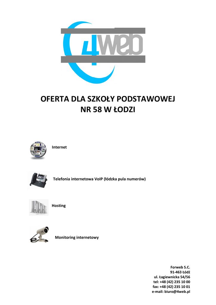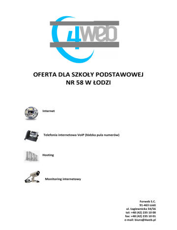 OFERTA DLA SZKOŁY PODSTAWOWEJ NR 58 W ŁODZI Internet Telefonia internetowa VoIP (łódzka pula numerów) Hosting Monitoring internetowy Forweb S.C. 91-463 Łódź ul. Łagiewnicka 54/56 tel: +48 (42) 235 10 00 fax: +48 (42) 235 10 01 e-mail: [email protected] Szanowni Państwo, Forweb S.C. to nowoczesna, stabilna i pręŜnie rozwijająca się firma, która juŜ od 1994 roku wdraŜa w małych i średnich przedsiębiorstwach kompletne rozwiązania informatyczne zarówno na poziomie sprzętowym i usługowym, jak i oprogramowania. Naszą misją jest tworzenie rozwiązań telekomunikacyjnych i internetowych dostosowanych do indywidualnych potrzeb Klientów, a dostarczane przez nas produkty mają słuŜyć zwiększeniu efektywności działań. Obecnie Forweb obsługuje ponad 6000 Klientów, w tym około 500 firm. Nasza sieć jest ciągle rozbudowywana, dzięki czemu stale udostępniamy Klientom nowe usługi. Staramy się oferować więcej niŜ tylko dostęp do Internetu. Forweb S.C to nie tylko najnowocześniejsze technologie, ale takŜe Ŝyczliwy i profesjonalny zespół specjalistów, którzy chętnie słuŜą radą i pomocą. Zapraszamy do zapoznania się z ofert dla firm. W razie jakichkolwiek pytań, prosimy o kontakt z Działem Handlowym: tel. 042 235 1000 lub [email protected]. Tomasz Pawłowski Prezes Forweb Oferta Specjalnie dla Państwa przygotowaliśmy kompleksową ofertę obejmującą całodobowy dostęp do Internetu, pakiet hostingowy z moŜliwością rejestracji dowolnie wybranych domen oraz załoŜenie skrzynek pocztowych. W naszej ofercie proponujemy objęcie Państwa miejsca prowadzenia działalności gospodarczej dedykowanym przyłączem, które pozwoli na bezawaryjny i błyskawiczny dostęp do usług, dzięki taryfom o niespotykanej do tej pory na rynku wydajności. Klientom, którzy chcą obniŜyć rachunki telefoniczne proponujemy równieŜ usługę VoIP wraz z moŜliwością otrzymania własnego numeru telefonu (z warszawskiej strefy numeracyjnej). Nasze usługi realizujemy za pomocą łączy światłowodowych, które są doskonałym rozwiązaniem zwłaszcza dla tych firm i instytucji, które potrzebują stałego, szybkiego i wydajnego dostępu do sieci oraz korzystają z poczty elektronicznej, www, ftp. Łącza światłowodowe ułatwiają takŜe tworzenie sieci rozległych między oddalonymi od siebie oddziałami i pozwalają wielu osobom jednocześnie bez problemu pracować w sieci – np. umoŜliwiają bezproblemowe przeprowadzenie wideokonferencji. Przyłączenie obejmuje: ETAP I zestawienie dedykowanego linku radiowego w technologii 5.7 Ghz ETAP II (instalacja wewnątrzbudynkowa) załoŜenie gniazdka z interfejsem RJ45 wraz z potrzebnym okablowaniem pomoc techniczną serwisanta Forweb uruchomienie i test zainstalowanego łącza konta pocztowe konto ftp konto www załoŜenie konta w internetowym biurze obsługi klienta (e-BOK). Abonament obejmuje: utrzymanie jednego łącza dostępowego nieograniczony dostęp do Internetu pomoc techniczną pracowników działu Helpdesk stały monitoring sieci utrzymanie strony www i poczty obsługę domeny abonenta (obsługa DNS) prowadzenie statystyk odwiedzin stron www Klienta. Wybierając ofertę Forweb zyskują Państwo: 1. BEZPIECZEŃSTWO o system jest chroniony przez firewall i NAT; o stały monitoring sieci o ochrona antywirusowa i antyspamowa poczty o szyfrowane połączenia (SSL) przy odbieraniu poczty o regularna kopia bezpieczeństwa stron www o autoryzacja poczty wychodzącej 2. WYGODĘ I PROSTOTĘ OBSŁUGI o moŜliwość samodzielnej administracji kontami pocztowymi i serwerem www o odbiór poczty przez www o telefoniczna pomoc techniczna pracowników działu Helpdesk o bezpłatna pomoc przy rejestracji dowolnie wybranej domeny o brak miesięcznych limitów transferu danych. Internet Koszt przyłączenia : moŜliwy do określenia po wykonaniu wizji technicznej FIBER BUSINESS 10 MEGA Oferta skierowana jest do firm, które nie korzystają z zaawansowanych usług internetowych, ale chcą mieć łatwy i wygodny dostęp do sieci. Pakiet obejmuje: stałe nielimitowane łącze symetryczne o przepustowości 10240/2048 kbit/s oraz rabat w wysokości 50% na pakiet hostingowy z moŜliwością załoŜenia własnej komercyjnej strony www (np. www.nazwafirmy.pl). Istnieje moŜliwość dołączenia pakietu telefonii VoIP w ilości 1000 minut miesięcznie Abonament: 249 zł netto | Abonament z pakietem telefonii VoIP: 299 zł netto FIBER BUSINESS 12 MEGA Oferta skierowana jest do bardziej wymagających uŜytkowników, dla których Internet jest bardzo waŜnym elementem w biznesie. Pakiet obejmuje: stałe łącze symetryczne o przepustowości 12288/2048 kbit/s, moŜliwość podłączenia dowolnej liczby stanowisk oraz korzystania z telefonii internetowej VoIP. W ramach usługi otrzymają Państwo równieŜ: pakiet hostingowy z moŜliwością uzyskania zewnętrznego adresu IP w cenie łącza. Istnieje moŜliwość dołączenia pakietu telefonii VoIP w ilości 1000 minut miesięcznie Abonament: 349 zł netto | Abonament z pakietem telefonii VoIP: 399 zł netto FIBER BUSINESS 15 MEGA Oferta przygotowana z myślą o wymagających uŜytkownikach, dla których Internet jest waŜnym elementem w biznesie. Pakiet obejmuje: stałe łącze symetryczne o przepustowości 15360/2048 kbit/s, moŜliwość podłączenia dowolnej ilości stanowisk oraz korzystania z telefonii internetowej VoIP. W ramach usługi otrzymają Państwo równieŜ: pakiet hostingowy z moŜliwością uzyskania zewnętrznego adresu IP w cenie łącza. Istnieje moŜliwość dołączenia pakietu telefonii VoIP w ilości 1000 minut miesięcznie Abonament: 499 zł netto | Abonament z pakietem telefonii VoIP: 549 zł netto Chcąc sprostać oczekiwaniom naszych Klientów, oferujemy równieŜ pakiety o wyŜszej przepustowości oraz niestandardowych parametrach. Takie oferty przygotowujemy indywidualnie, by jak najlepiej odpowiadały Państwa potrzebom. Proponujemy równieŜ kompleksową