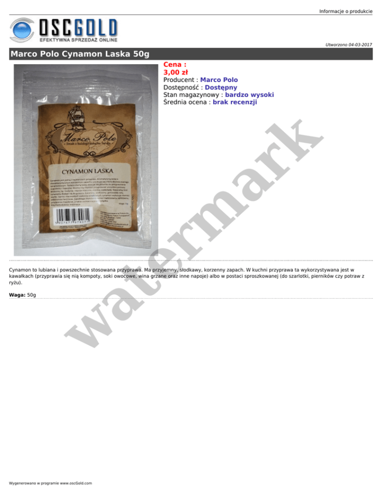 Informacje o produkcie Utworzono 04-03-2017 Marco Polo Cynamon Laska 50g Cena : 3,00 zł er m ar k Producent : Marco Polo Dostępność : Dostępny Stan magazynowy : bardzo wysoki Średnia ocena : brak recenzji w Waga: 50g at Cynamon to lubiana i powszechnie stosowana przyprawa. Ma przyjemny, słodkawy, korzenny zapach. W kuchni przyprawa ta wykorzystywana jest w kawałkach (przyprawia się nią kompoty, soki owocowe, wina grzane oraz inne napoje) albo w postaci sproszkowanej (do szarlotki, pierników czy potraw z ryżu). Wygenerowano w programie www.oscGold.com