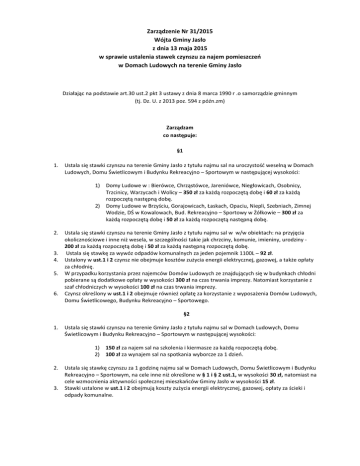 Zarządzenie Nr 31/2015 Wójta Gminy Jasło z dnia 13 maja 2015 w sprawie ustalenia stawek czynszu za najem pomieszczeń w Domach Ludowych na terenie Gminy Jasło Działając na podstawie art.30 ust.2 pkt 3 ustawy z dnia 8 marca 1990 r .o samorządzie gminnym (tj. Dz. U. z 2013 poz. 594 z późn.zm) Zarządzam co następuje: §1 1. Ustala się stawki czynszu na terenie Gminy Jasło z tytułu najmu sal na uroczystość weselną w Domach Ludowych, Domu Świetlicowym i Budynku Rekreacyjno – Sportowym w następującej wysokości: 1) 2) 2. 3. 4. 5. 6. Domy Ludowe w : Bierówce, Chrząstówce, Jareniówce, Niegłowicach, Osobnicy, Trzcinicy, Warzycach i Wolicy – 350 zł za każdą rozpoczętą dobę i 60 zł za każdą rozpoczętą następną dobę. Domy Ludowe w Brzyściu, Gorajowicach, Łaskach, Opaciu, Niepli, Szebniach, Zimnej Wodzie, DŚ w Kowalowach, Bud. Rekreacyjno – Sportowy w Żółkowie – 300 zł za każdą rozpoczętą dobę i 50 zł za każdą rozpoczętą następną dobę. Ustala się stawki czynszu na terenie Gminy Jasło z tytułu najmu sal w w/w obiektach: na przyjęcia okolicznościowe i inne niż wesela, w szczególności takie jak chrzciny, komunie, imieniny, urodziny 200 zł za każdą rozpoczętą dobę i 50 zł za każdą następną rozpoczętą dobę. Ustala się stawkę za wywóz odpadów komunalnych za jeden pojemnik 1100L – 92 zł. Ustalony w ust.1 i 2 czynsz nie obejmuje kosztów zużycia energii elektrycznej, gazowej, a także opłaty za chłodnię. W przypadku korzystania przez najemców Domów Ludowych ze znajdujących się w budynkach chłodni pobierane są dodatkowe opłaty w wysokości 300 zł na czas trwania imprezy. Natomiast korzystanie z szaf chłodniczych w wysokości 100 zł na czas trwania imprezy. Czynsz określony w ust.1 i 2 obejmuje również opłatę za korzystanie z wyposażenia Domów Ludowych, Domu Świetlicowego, Budynku Rekreacyjno – Sportowego. §2 1. Ustala się stawki czynszu na terenie Gminy Jasło z tytułu najmu sal w Domach Ludowych, Domu Świetlicowym i Budynku Rekreacyjno – Sportowym w następującej wysokości: 1) 2) 2. 3. 150 zł za najem sal na szkolenia i kiermasze za każdą rozpoczętą dobę. 100 zł za wynajem sal na spotkania wyborcze za 1 dzień. Ustala się stawkę czynszu za 1 godzinę najmu sal w Domach Ludowych, Domu Świetlicowym i Budynku Rekreacyjno – Sportowym, na cele inne niż określone w § 1 i § 2 ust.1, w wysokości 30 zł, natomiast na cele wzmocnienia aktywności społecznej mieszkańców Gminy Jasło w wysokości 15 zł. Stawki ustalone w ust.1 i 2 obejmują koszty zużycia energii elektrycznej, gazowej, opłaty za ścieki i odpady komunalne. §3 Za każdą rozpoczętą dobę o której mowa w §1 i §2 należy rozumieć każde kolejne 24 godziny. §4 Opłaty określone w §1 i §4 zawierają stawki podatku od towaru i usług. §5 W przypadku najmu sal na uroczystości weselne strony umowy zobowiązane są do zawarcia przedwstępnej umowy najmu. §6 1. Nieodpłatne udostępnia się w/w obiekty użyteczności publicznej na: 1) 2) 3) 4) 5) 6) 7) 2. 3. 4. 5. zebrania wiejskie i spotkania z mieszkańcami, organizowane przez Wójta Gminy Jasło, radnych, i rady sołeckie – będące wynikiem statutowe działalności tych organów, zebrania: rad sołeckich, Ochotniczych Straży Pożarnych, Ludowych Zespołów Sportowych oraz zebrania i spotkania Kół Gospodyń Wiejskich – działających na terenie gminy Jasło, okolicznościowe imprezy i zabawy, organizowane dla dzieci w wieku przedszkolnym, uczniów szkół podstawowych i gimnazjum z terenu gminy Jasło, okolicznościowe spotkania i imprezy dla mieszkańców sołectw o charakterze niedochodowym, nieodpłatne zajęcia sportowe i społeczno – kulturalne dla mieszkańców gminy Jasło, okolicznościowe imprezy organizowane w celach charytatywnych przez działające na terenie gminy rady rodziców, rady sołeckie, OSP,KGW, Kluby Sportowe i inne organizacje i stowarzyszenia działające na terenie gminy, lokale wyborcze dla potrzeb przeprowadzenia wyborów. Koszty eksploatacyjne wynikające z korzystania obiektów do celów, o których mowa w ust.1 pokrywane są z budżetu gminy. Nieodpłatne korzystanie z obiektów odbywa się na pisemny wniosek złożony do Wójta Gminy Jasło, po wcześniejszym uzgodnieniu terminu z administratorem obiektu. Z najemcą, któremu udostępniono nieodpłatnie obiekt zawiera się umowę. Organizator imprezy odpowiada za ład i porządek na terenie udostępnionego obiektu, za bezpieczeństwo uczestników imprezy, jak również ponosi koszty ewentualnych zniszczeń mienia gminnego. §7 Traci moc zarządzenia nr 6/2015 Wójta Gminy Jasło z dnia 5 luty 2015 r. w sprawie ustalenia stawek czynszu za najem pomieszczeń w Domach Ludowych na terenie Gminy Jasło. §8 Zarządzenie wchodzi w życie z dniem podpisania.
