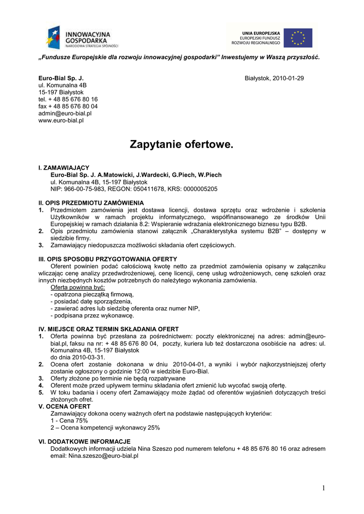 „Fundusze Europejskie dla rozwoju innowacyjnej gospodarki” Inwestujemy w Waszą przyszłość. Euro-Bial Sp. J. ul. Komunalna 4B 15-197 Białystok tel. + 48 85 676 80 16 fax + 48 85 676 80 04 [email protected] www.euro-bial.pl Białystok, 2010-01-29 Zapytanie ofertowe. I. ZAMAWIAJĄCY Euro-Bial Sp. J. A.Matowicki, J.Wardecki, G.Piech, W.Piech ul. Komunalna 4B, 15-197 Białystok NIP: 966-00-75-983, REGON: 050411678, KRS: 0000005205 II. OPIS PRZEDMIOTU ZAMÓWIENIA 1. Przedmiotem zamówienia jest dostawa licencji, dostawa sprzętu oraz wdrożenie i szkolenia Użytkowników w ramach projektu informatycznego, współfinansowanego ze środków Unii Europejskiej w ramach działania 8.2: Wspieranie wdrażania elektronicznego biznesu typu B2B. 2. Opis przedmiotu zamówienia stanowi załącznik „Charakterystyka systemu B2B” – dostępny w siedzibie firmy. 3. Zamawiający niedopuszcza możliwości składania ofert częściowych. III. OPIS SPOSOBU PRZYGOTOWANIA OFERTY Oferent powinien podać całościową kwotę netto za przedmiot zamówienia opisany w załączniku wliczając cenę analizy przedwdrożeniowej, cenę licencji, cenę usług wdrożeniowych, cenę szkoleń oraz innych niezbędnych kosztów potrzebnych do należytego wykonania zamówienia. Oferta powinna być: - opatrzona pieczątką firmową, - posiadać datę sporządzenia, - zawierać adres lub siedzibę oferenta oraz numer NIP, - podpisana przez wykonawcę. IV. MIEJSCE ORAZ TERMIN SKŁADANIA OFERT 1. Oferta powinna być przesłana za pośrednictwem: poczty elektronicznej na adres: [email protected], faksu na nr: + 48 85 676 80 04, poczty, kuriera lub też dostarczona osobiście na adres: ul. Komunalna 4B, 15-197 Białystok do dnia 2010-03-31. 2. Ocena ofert zostanie dokonana w dniu 2010-04-01, a wyniki i wybór najkorzystniejszej oferty zostanie ogłoszony o godzinie 12:00 w siedzibie Euro-Bial. 3. Oferty złożone po terminie nie będą rozpatrywane 4. Oferent może przed upływem terminu składania ofert zmienić lub wycofać swoją ofertę. 5. W toku badania i oceny ofert Zamawiający może żądać od oferentów wyjaśnień dotyczących treści złożonych ofret. V. OCENA OFERT Zamawiający dokona oceny ważnych ofert na podstawie następujących kryteriów: 1 - Cena 75% 2 – Ocena kompetencji wykonawcy 25% VI. DODATKOWE INFORMACJE Dodatkowych informacji udziela Nina Szeszo pod numerem telefonu + 48 85 676 80 16 oraz adresem email: [email protected] 1