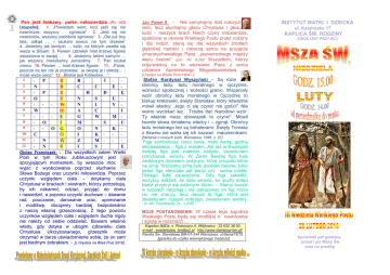 Pan jest łaskawy, pełen miłosierdzia (Ps 103) Uzupełnij: 1. „Powiadam wam; lecz jeśli się nie nawrócicie, wszyscy … zginiecie” 2. „Jeśli się nie nawrócicie, wszyscy podobnie zginiecie” 3. „Oto już trzy lata, odkąd … i szukam owocu na tym drzewie” 4. Jesteśmy jak tamtych … ludzi, na których zwaliła się wieża w Siloam 5. Pewien człowiek miał drzewo figowe zasadzone w swojej … 6. Jesteśmy takimi samymi … jak wszyscy mieszkańcy Jerozolimy. 7. Pan szukał owocu 10. Pewien … miał drzewo figowe. 11. „Panie, jeszcze na ten rok je pozostaw; ja okopię je i obłożę… ; może wyda owoc” 12. „Bliskie jest Królestwo…”. 1 x 2 N 3 x 4 O P P D R Z E W O F I G O W E E B C C H D x x E x Ę N S U x x x x N I Y x 6 W A C I 7 x x x G W M x 8 x O M S U 9 x x O O N K x 10 x x C I K x 11 x x x N Z M x 12 x N I S E Ojciec Franciszek: - Dla wszystkich zatem Wielki Post w tym Roku Jubileuszowym jest sprzyjającym momentem, by wreszcie móc wyjść z wyobcowania poprzez słuchanie Słowa Bożego oraz uczynki miłosierdzia. Poprzez uczynki względem ciała – dotykamy ciała Chrystusa w braciach i siostrach, którzy potrzebują, by ich nakarmić, odziać, przyjąć do domu i nawiedzić, a poprzez uczynki duchowe – dawanie rad, pouczanie, darowanie uraz, upominanie i modlitwę, obcujemy bardziej bezpośrednio z naszą własną grzesznością. Z tego powodu uczynków względem ciała i względem ducha nigdy nie należy od siebie oddzielać. Bowiem właśnie wtedy, gdy dotyka w ubogim człowieku ciała Chrystusa Ukrzyżowanego, grzesznik może otrzymać w darze uświadomienie sobie, że on sam jest biednym żebrakiem. - [z Orędzia na Wieli Post 2016]. 5 - Nie zamykajmy dziś naszych serc, lecz słuchajmy głosu Chrystusa i głosu ludzi - naszych braci! Niech czyny miłosierdzia, spełnione w okresie Wielkiego Postu przez rodziny i dla rodzin, staną się dla wszystkich źródłem głębokiej radości i otworzą serca na przyjęcie zmartwychwstałego Pana, „pierworodnego między wielu braćmi” (por. Rz 8,29)! Wszystkim, którzy odpowiedzą na to wezwanie Pana z serca udzielam Apostolskiego Błogosławieństwa Jan Paweł II INSTYTUT MATKI I DZIECKA . ul. Kasprzaka 17 KAPLICA ŚW. RODZINY (OBOK IZBY PRZYJĘĆ) [Orędzie na Wielki Post 1994 r.]. Stefan Kardynał Wyszyński – Są różni obrońcy ładu: ładu moralnego w ojczyźnie, wolności społecznej i wolności granic. Wspaniały wzór obrońcy ładu moralnego w Ojczyźnie to biskup krakowski, święty Stanisław, który odważnie mówił władcy: „tego ci się czynić nie godzi!” Nie wolno wyciskać łez. Trzeba dać Narodowi wzór. Ty właśnie masz obowiązek to czynić”. Mówił twarde słowa śmiałemu władcy i – zginął. Obrońcy ładu moralnego też są bohaterami. Święty Tomasz z Akwinu nie waha się ich nazwać męczennikami. [Wolanie o nowych ludzi, Warszawa, 1996, s. 51] Figa symbolizuje rzecz tanią, mało wartą, godną lekceważenia – figa z makiem. Ale też w Ewangelii świętej figa jest znakiem nadziei, zwiastunem odrodzenia, wiosny. W Ziemi Świętej figa była osobliwym drzewem, jedynym, które zrzucało liście na zimę. Wszystko zimą było dookoła zielone, tylko jedna figa sterczała jak badyl czy sucha miotła. Dlatego była zauważalna. Gdy figa zakwitła, wszyscy widzieli, że idzie wiosna, bo suchy dotąd badyl przykrył się zielonymi liśćmi. – Mamy budzić w ludziach nadzieję i nie pokazywać im figi, która nic nie znaczy, lecz dawać tę figę, która jest zwiastunem czegoś dobrego, zwiastunem wiosny. - [x Jan Twardowski, jw., s.248]. MOJE POSTANOWIENIE: W czasie tego tygodnia Wielkiego Postu będę się modlił(a) o nawrócenie i zgodę w rodzinach … Kapelan IMiDz- x. Proboszcz A. Wójtowicz - 22 632 38 00 e-mail : [email protected] http://www.stanislaw-bm.pl/ Parafia Św. Stanisława BM-01-244 Warszawa; ul.Bema73/75 [gazetka do użytku wewnętrznego Instytutu] Spowiedź pół godziny przed i po Mszy Św. oraz na prośbę. Pan mówi: Nawracajcie się, bliskie jest Królestwo Niebieskie. (Mt 4,17) Łk 13,1-9 W tym czasie przyszli niektórzy i donieśli Mu o Galilejczykach, których krew Piłat zmieszał z krwią ich ofiar. Jezus im odpowiedział: Czyż myślicie, że ci Galilejczycy byli większymi grzesznikami niż inni mieszkańcy Galilei, że to ucierpieli? Bynajmniej, powiadam wam; lecz jeśli się nie nawrócicie, wszyscy podobnie zginiecie. Albo myślicie, że owych osiemnastu, na których zwaliła się wieża w Siloam i zabiła ich, było większymi winowajcami niż inni mieszkańcy Jerozolimy? Bynajmniej, powiadam wam; lecz jeśli się nie nawrócicie, wszyscy tak samo zginiecie. I opowiedział im następującą przypowieść: Pewien człowiek miał drzewo figowe zasadzone w swojej winnicy; przyszedł i szukał na nim owoców, ale nie znalazł. Rzekł więc do ogrodnika: Oto już trzy lata, odkąd przychodzę i szukam owocu na tym drzewie figowym, a nie znajduję. Wytnij je: po co jeszcze ziemię wyjaławia? Lecz on mu odpowiedział: Panie, jeszcze na ten rok je pozostaw; ja okopię je i obłożę nawozem; może wyda owoc. A jeśli nie, w przyszłości możesz je wyciąć. Nie mów: „Jestem w porządku”, „Są gorsi ode mnie”. Nie trać energii na porównywanie się z innymi. A jeśli wreszcie dochodzisz do wniosku, że nie potrafisz kochać, że wciąż kochasz za mało, że twoje życie nie przynosi owoców miłości, to zwróć się do ChrystusaOgrodnika i pozwól, by On się o ciebie zatroszczył. Uwierz, że jeśli „pokornie przyznasz się do przewinień”, zostaniesz od nich przez Chrystusa uwolniony. Wszyscy jesteśmy grzesznikami, wszyscy potrzebujemy nawrócenia – metanoi, czyli odnowy w naszym myśleniu. Drogę do niej wskazuje Kościół, który mówi, że post, modlitwa i jałmużna to naprawdę skuteczne lekarstwa na nasze grzechy. [O. P. Ciesielski OP & Ł. Kubiak OP, „Oremus” Wielki Post 2004, s. 76]. KALENDAR