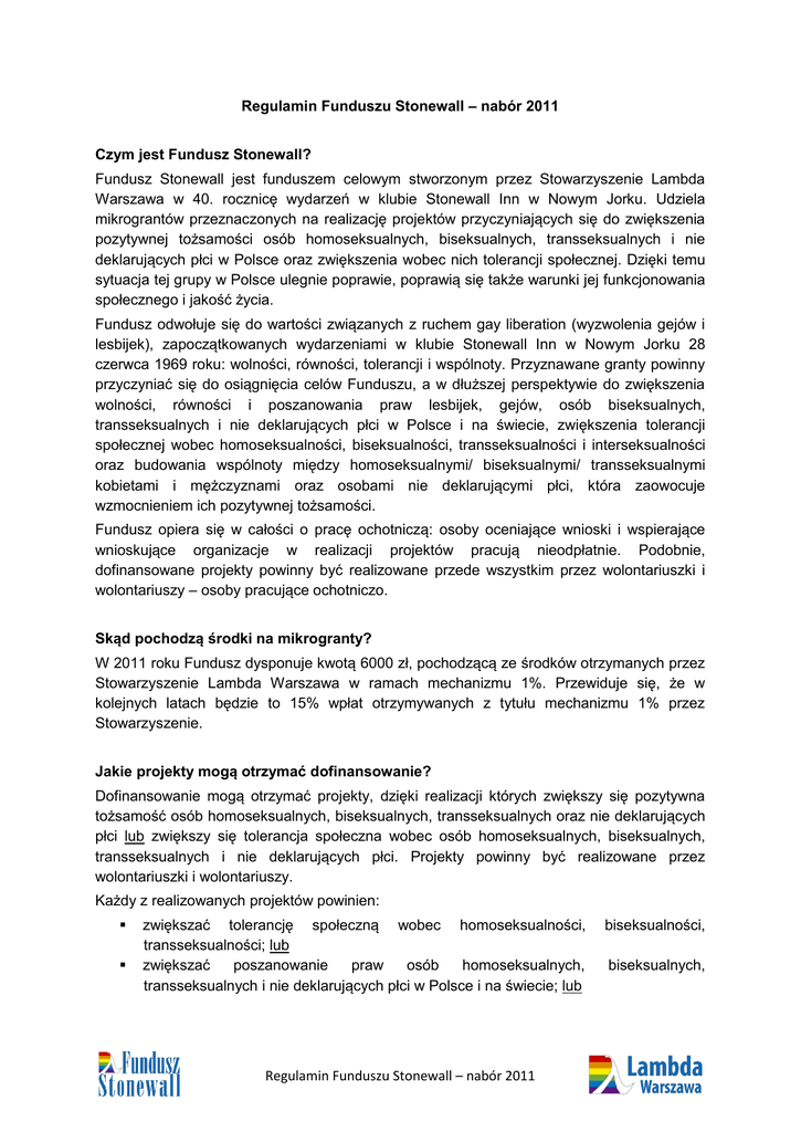 Regulamin Funduszu Stonewall – nabór 2011 Czym jest Fundusz Stonewall? Fundusz Stonewall jest funduszem celowym stworzonym przez Stowarzyszenie Lambda Warszawa w 40. rocznicę wydarzeń w klubie Stonewall Inn w Nowym Jorku. Udziela mikrograntów przeznaczonych na realizację projektów przyczyniających się do zwiększenia pozytywnej tożsamości osób homoseksualnych, biseksualnych, transseksualnych i nie deklarujących płci w Polsce oraz zwiększenia wobec nich tolerancji społecznej. Dzięki temu sytuacja tej grupy w Polsce ulegnie poprawie, poprawią się także warunki jej funkcjonowania społecznego i jakość życia. Fundusz odwołuje się do wartości związanych z ruchem gay liberation (wyzwolenia gejów i lesbijek), zapoczątkowanych wydarzeniami w klubie Stonewall Inn w Nowym Jorku 28 czerwca 1969 roku: wolności, równości, tolerancji i wspólnoty. Przyznawane granty powinny przyczyniać się do osiągnięcia celów Funduszu, a w dłuższej perspektywie do zwiększenia wolności, równości i poszanowania praw lesbijek, gejów, osób biseksualnych, transseksualnych i nie deklarujących płci w Polsce i na świecie, zwiększenia tolerancji społecznej wobec homoseksualności, biseksualności, transseksualności i interseksualności oraz budowania wspólnoty między homoseksualnymi/ biseksualnymi/ transseksualnymi kobietami i mężczyznami oraz osobami nie deklarującymi płci, która zaowocuje wzmocnieniem ich pozytywnej tożsamości. Fundusz opiera się w całości o pracę ochotniczą: osoby oceniające wnioski i wspierające wnioskujące organizacje w realizacji projektów pracują nieodpłatnie. Podobnie, dofinansowane projekty powinny być realizowane przede wszystkim przez wolontariuszki i wolontariuszy – osoby pracujące ochotniczo. Skąd pochodzą środki na mikrogranty? W 2011 roku Fundusz dysponuje kwotą 6000 zł, pochodzącą ze środków otrzymanych przez Stowarzyszenie Lambda Warszawa w ramach mechanizmu 1%. Przewiduje się, że w kolejnych latach będzie to 15% wpłat otrzymywanych z tytułu mechanizmu 1% przez Stowarzyszenie. Jakie projekty mogą otrzymać dofinansowanie? Dofinansowanie mogą otrzymać projekty, dzięki realizacji których zwiększy się pozytywna tożsamość osób homoseksualnych, biseksualnych, transseksualnych oraz nie deklarujących płci lub zwiększy się tolerancja społeczna wobec osób homoseksualnych, biseksualnych, transseksualnych i nie deklarujących płci. Projekty powinny być realizowane przez wolontariuszki i wolontariuszy. Każdy z realizowanych projektów powinien: zwiększać tolerancję społeczną wobec homoseksualności, transseksualności; lub zwiększać poszanowanie praw osób homoseksualnych, transseksualnych i nie deklarujących płci w Polsce i na świecie; lub Regulamin Funduszu Stonewall – nabór 2011 biseksualności, biseksualnych, przyczyniać się do budowania między nimi wspólnoty, pozwalającej osobom homoseksualnym, biseksualnym, transseksualnym lub nie deklarującym płci rozwinąć swoją pozytywną tożsamość. Przykładowe projekty mogą dotyczyć: organizacji wydarzeń (manifestacji, happeningów, wystaw, konferencji, seminariów) dotyczących upowszechniania lub poszanowania praw osób LGBTI); realizacji działań kulturalnych (np. warsztatów, przeglądów, festiwali, konkursów, dyskusji) prezentujących kulturę LGBTI i upowszechniających jej uczestnictwo w kulturze narodowej i europejskiej; realizacji działań prezentujących szerokiemu gronu odbiorczyń i odbiorców sytuację transseksualnych osób LGBTI w Polsce (np. warsztaty, akcje uliczne, happeningi, akcje informacyjne, badania, analizy, działalność archiwalna); działań pomocowych, umożliwiających budowanie pozytywnej tożsamości mężczyznom osób LGBTI (np. grupy wsparcia, poradnictwo, udzielanie wsparcia); działań integrujących społeczność osób LGBTI i dzięki temu wzmacniających ich pozytywną tożsamość (np. spotkania, imprezy, realizacja wspólnych projektów, działalność turystyczna i rekreacyjna); organizacji działań przyczyniających się do ograniczenia rozprzestrzeniania się wirusa hiv i mobilizacji społeczności LGBTI do ograniczenia stygmatyzacji i wykluczenia osób żyjących z hiv oraz zapewnienia im opieki i wsparcia (np. działalność profilaktyczna i informacyjna, organizacja wydarzeń rocznicowych, organizacja seminariów i konferencji, świadczenie wsparcia na rzecz osób żyjących z hiv). Należy podkreślić, że wymienione powyżej typy projektów mają jedynie charakter przykładowy, a ich lista nie jest zamknięta. Wnioskujące organizacje/ grupy nieformalne przed podjęciem decyzji o złożeniu wniosku prezentującego projekt powinny rozważyć czy i w jaki sposób proponowany projekt przyczynia się do osiągnięcia celów Funduszu. Wszystkie dofinansowane projekty powinny zakładać ich realizację z poszanowaniem przepisów prawa. Jaka jest kwota przeznaczona na dofinansowanie? W 2011 roku Fundusz dysponuje kwotą 6000 zł. W kolejnych latach planuje się, że będzie to co najmniej 5000 zł, jednakże kwota ta zależy od darowizn, przekazanych w ramach mechanizmu 1%. W jakim terminie mogą być realizowane złożone projekty? Realizacja projektu (czas od momentu podjęcia pierwszych działań, niezbędnych do zrealizowania projektu do zakończenia ostatnich działań koniecznych do zrealizowania projektu) może się rozpocząć nie wcześniej niż 1 lipca 2011 roku i powinna się zakończyć najpóźniej 30 czerwca 2012 roku. Jakie dofinansowanie można otrzymać? Możliwe jest wnioskowanie o dotację do projektu mini (w wysokości do 1000 zł dofinansowania) lub projektu standardowego (w wysokości od 1001 do 2000 zł Regulamin Funduszu Stonewall – nabór 2011 dofinansowania). W 2011 roku planuje się przyznać 2 dotacje na realizację projektów mini oraz 2 dotacje na realizację projektów standardowych. Przyznana dotacja może stanowić maksymalnie 90% kosztów rea