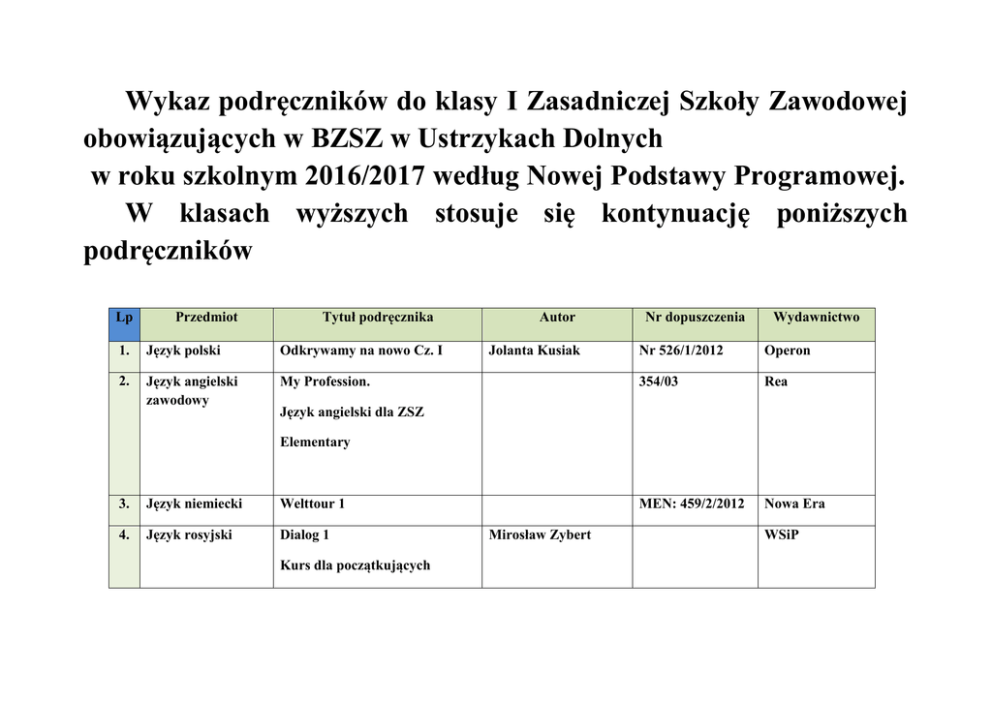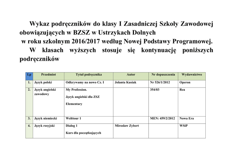 Wykaz podręczników do klasy I Zasadniczej Szkoły Zawodowej obowiązujących w BZSZ w Ustrzykach Dolnych w roku szkolnym 2016/2017 według Nowej Podstawy Programowej. W klasach wyższych stosuje się kontynuację poniższych podręczników Lp Przedmiot Tytuł podręcznika 1. Język polski Odkrywamy na nowo Cz. I 2. Język angielski zawodowy My Profession. Autor Jolanta Kusiak Nr dopuszczenia Wydawnictwo Nr 526/1/2012 Operon 354/03 Rea MEN: 459/2/2012 Nowa Era Język angielski dla ZSZ Elementary 3. Język niemiecki Welttour 1 4. Język rosyjski Dialog 1 Kurs dla początkujących Mirosław Zybert WSiP 5. Chemia ” To jest chemia” Zakres podstawowy 6. Historia Romuald Hassa MEN:438/2012 Nowa Era Aleksandra,Janusz Mrzigod „Poznać przeszłość wiek XX” Stanisław Roszak Nowa Era Jarosław Kłaczkow 7. WOS „W centrum uwagi” Arkadiusz Janicki Nowa Era 8. Matematyka Matematyka Cz I Wojciech Babiański Nowa Era Karolina Wej 9. Fizyka „Odkryć fizykę” Marcin Braun, Podręcznik dla szkół ponad Weronika Śliwa Nowa Era gimnazjalnych 10. Podstawy przedsiębiorczości „Podstawy przedsiębiorczości „ 11. Podstawy Przedsiębiorczości „Zarys przedsiębiorczości” Jacek Korba, OPERON Zbigniew Smutek Jacek Musiałkiewicz Ekonomik 12. Informatyka „Ciekawi świata” Andre Geima 13. Edukacja dla bezpieczeństwa „ Żyję i działam bezpiecznie” Jarosław Słoma Nowa Era 14. Technologia gastronomiczna z towaroznawstwem „Technologia gastronomiczna z towaroznawstwem” Antonina Kopta Szkolne i Pedagogiczne Nr dopuszczenia MEN: 520/2012 Barbara Łuszczki OPERON Cz.1 ZSZ Kucharz Katarzyna Korniat 15. Technologia gastronomiczna z towaroznawstwem „Technologia gastronomiczna z towaroznawstwem” Cz.1 ZSZ Kucharz Agata Czysty „Technologia gastronomiczna z towaroznawstwem” Cz.1 ZSZ Kucharz Małgorzata Konarzewska, Barbara Zielonka, Maria KonarzewskaSokołowska Nr dopuszczenia MEN: 46/03 REA Antonina Kopta Barbara Łuszczki Szkolne i Pedagogiczne 16. Geografia I klasa Seria „Odkrywamy na nowo” Zakres podstawowy MEN 429/2012 OPERON Geografia - podręcznik-------- ----------------------------- -------------------------------------- Sławomir Kurek------- Geografia dla maturzysty I, II, II ----------------------------- ----------------------610/1/2012 Zakres rozszerzony Geografia II-IV klasa -----------------WSZPWN Piotr Czubla, Elżbieta Papińska Wykaz podręczników do klasy I Technikum obowiązujących w BZSZ w Ustrzykach Dolnych w roku szkolnym 2016/2017 według nowej Podstawy Programowej. W klasach wyższych stosuje się kontynuację poniższych podręczników. Lp 1. Przedmiot Język polski Tytuł podręcznika Odkrywamy na nowo Cz. I Autor Urszula Jagiełło Nr dopuszczenia MEN:444/1/2012 Wydawnictwo Operon Odkrywamy na nowo Cz. II Renata JanickaSzyszko MEN:444/2/2012 Magdalena StebleckaJankowska 2. Język angielski Matura Prime Time MEN 335/1/2011 poziom podstawowy 3. Język angielski zawodowy Highly Recommended Express Publishing Oxford Elementary Technik hotelarz 4. Język angielski zawodowy Accounting Express Publishing Elementary-Intermediate Technik handlowiec 5. 6. Język angielski zawodowy TŻUG Ready to Order Język angielski zawodowy Ready to Order Longman Elementary Longman Elementary Technik kelner 7. Język niemiecki poziom podstawowy EXAKT 1 MEN: 368/1/2011 Lektor Klett 8. Język niemiecki Direkt hautnah neu 1 W trakcie akceptacji poziom rozszerzony 9. Język niemiecki zawodowy Zimmer frei Lektor Klett Langenscheidt Technik hotelarz Język niemiecki zawodowy TŻUG 10. Język niemiecki zawodowy Mit Beruf auf Deutsch W trakcie akceptacji Turystyczno gastronomiczne Herzlich Willkommen Nowa Era Langenscheidt Technik kelner 11. Chemia ” To jest chemia” Zakres podstawowy 12. Historia Romuald Hassa MEN:438/2012 Nowa Era Aleksandra, Janusz Mrzigod „Poznać przeszłość wiek XX” Stanisław Roszak Nowa Era Jarosław Kłaczkow 13. WOS „W centrum uwagi” Arkadiusz Janicki Nowa Era 14. Matematyka „ Ciekawi świata „ Kinga Gałązka Operon Zakres podstawowy 15. Matematyka „ Ciekawi swiata” Kinga Gałązka Operon „Odkryć fizykę” Marcin Braun, Nowa Era Podręcznik dla szkół ponad Weronika Śliwa Zakres rozszerzony 16. Fizyka gimnazjalnych „Podstawy przedsiębiorczości” Jacek Korba, 18. Podstawy przedsiębiorczości „Zarys przedsiębiorczości” Jacek Musiałkiewicz 19. WOK „Wiedza o kulturze” Wacław Panek 20. Organizacja pracy „Organizacja pracy w hotelarstwie” Joanna Orłowska, Małgorzata Tkaczyk 17. Podstawy Przedsiębiorczości w hotelarstwie 21. Podstawy psychologii 22. Obsługa informatyczna "Podstawy psychologii", "Obsługa informatyczna OPERON Zbigniew Smutek Ekonomik 366/2012 Wołomin Rea Katarzyna Hamer 26/2009 Format AB, Warszawa Mariola Milewska, Rok dopuszczenia WSiP, w hotelarstwie w hotelarstwie" Andrzej Stasiak 2010 Warszawa, 2010 Nr 224/04 „Technologia informacyjna” Grażyna Hermanowska, Wojciech Hermanowski OPERON, Gdynia 2010 24. Technika pracy biurowej "Technika pracy biurowej” Ewa Stefaniak-Piasek Nr 8/03 WSiP, Warszawa 2003,2005, 25. Edukacja dla bezpieczeństwa „ Żyję i działam bezpiecznie” Jarosław Słoma 26. Biologia „Biologia na czasie” MEN:450/2012 Nowa Era - zakres podstawowy Emilia Bona Weronika Krzeszowiec – JeleńStanisław Czadorowski Technologia gastronomiczna z towaroznawstwem cz. I Małgorzata Konarzewska MEN: 26/2007 REA Seria „Odkrywamy na nowo” Zakres podstawowy MEN 429/2012 OPERON 23. Technologia informacyjna Podręcznik dla szkół ponadgimnazjalnych 27. Technologia gastronomiczna Nowa Era z towaroznawstwem 28. Geografia I klasa Geografia - podręcznik-------- -------------------------------------- Sławomir Kurek-----------------------------------Geografia II-IV klasa Geografia dla maturzysty I, II, II ----------------------------- ----------------------610/1/2012 Zakres rozszerzony -----------------WSZPWN Piotr Czubla, Elżbieta Papińska 29. Informatyka Seria 