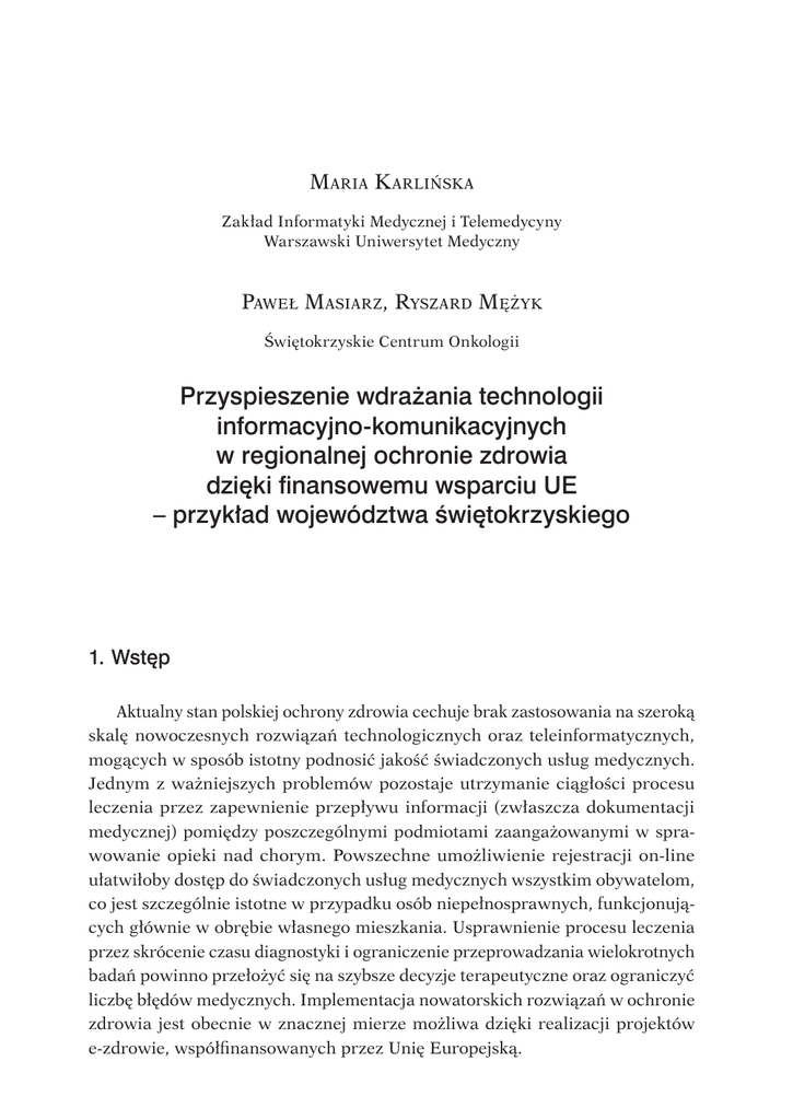 Przyspieszenie wdrażania technologii informacyjno‑komunikacyjnych... 207 Maria K arlińska Zakład Informatyki Medycznej i Telemedycyny Warszawski Uniwersytet Medyczny Paweł Masiarz, Ryszard Mężyk Świętokrzyskie Centrum Onkologii Przyspieszenie wdrażania technologii informacyjno-komunikacyjnych w regionalnej ochronie zdrowia dzięki finansowemu wsparciu UE – przykład województwa świętokrzyskiego 1. Wstęp Aktualny stan polskiej ochrony zdrowia cechuje brak zastosowania na szeroką skalę nowoczesnych rozwiązań technologicznych oraz teleinformatycznych, mogących w sposób istotny podnosić jakość świadczonych usług medycznych. Jednym z ważniejszych problemów pozostaje utrzymanie ciągłości procesu leczenia przez zapewnienie przepływu informacji (zwłaszcza dokumentacji medycznej) pomiędzy poszczególnymi podmiotami zaangażowanymi w spra‑ wowanie opieki nad chorym. Powszechne umożliwienie rejestracji on‑line ułatwiłoby dostęp do świadczonych usług medycznych wszystkim obywatelom, co jest szczególnie istotne w przypadku osób niepełnosprawnych, funkcjonują‑ cych głównie w obrębie własnego mieszkania. Usprawnienie procesu leczenia przez skrócenie czasu diagnostyki i ograniczenie przeprowadzania wielokrotnych badań powinno przełożyć się na szybsze decyzje terapeutyczne oraz ograniczyć liczbę błędów medycznych. Implementacja nowatorskich rozwiązań w ochronie zdrowia jest obecnie w znacznej mierze możliwa dzięki realizacji projektów e‑zdrowie, współfinansowanych przez Unię Europejską. 208 Maria Karlińska, Paweł Masiarz, Ryszard Mężyk W niniejszym artykule przedstawiono modelowy proces wdrażania rozwią‑ zań teleinformatycznych w ochronie zdrowia oraz sposób oceny stopnia jego zaawansowania. Za ilustrację posłuży projekt „E‑Zdrowie w województwie świętokrzyskim, rozbudowa i wdrażanie systemów informatycznych w jednost‑ kach służby zdrowia – etap I”, którego plan i realizację omówiono w sposób szczegółowy. 2. Potencjał e‑zdrowia Termin „e‑zdrowie” może być definiowany jako zastosowanie w opiece zdro‑ wotnej szerokiego spektrum narzędzi służących do przetwarzania i transmisji danych (włączając korzystanie z Internetu)1. E‑zdrowie wykorzystuje technologie informacyjno‑komunikacyjne w produktach, usługach i procesach w ochronie zdrowia. Zakłada systemowe zmiany organizacyjne oraz przekazywanie lub współ‑ dzielenie danych między instytucjami. Wprowadza interakcje między pacjentami i personelem medycznym oraz podmiotami świadczącymi usługi zdrowotne. Celem e‑zdrowia jest poprawa stanu zdrowia społeczeństwa, efektywności i wydajności świadczeń medycznych oraz wzrost gospodarczej i społecznej wartości zdrowia. Pierwszy plan działania w dziedzinie e‑zdrowia przyjęto w UE w 2004 r. 6 grudnia 2012 r. Komisja Europejska opublikowała najnowszy „Plan działania w dziedzinie e‑zdrowia na lata 2012–2020 – innowacyjna opieka zdrowotna w XXI wieku”2. W dokumencie tym została nakreślona wizja e‑zdrowia w Europie zgodnie z celami strategii Europa 2020 i Europejskiej agendy cyfrowej3. Przedstawione zostały korzyści i bariery jego dalszego rozwoju. Jako jedną z przeszkód wymieniono ograniczoną liczbę dowodów naukowych, które w sposób bezpośredni potwier‑ dzałyby efektywność kosztową narzędzi i usług e‑zdrowia. Należy jednak zazna‑ czyć, że na poziom akceptacji wdrożenia wspomnianych rozwiązań ma wpływ wiele bardzo różnych czynników. Li Junhua i współpracownicy na podstawie obejmującego 93 pozycje systematycznego przeglądu literatury zidentyfikowali aż 40 takich czynników, możliwych do pogrupowania w siedem domen4. Warto jednocześnie zaznaczyć, że potencjalne oszczędności wynikające z wprowadze‑ F. Fatehi, R. Wootton, Telemedicine, telehealth or e‑health? A bibliometric analysis of the trends in the use of these terms, „Journal of Telemedicine and Telecare” 2012, vol. 18, s. 460–464. 2 http://www.mz.gov.pl/wwwfiles/ma_struktura/docs/komkomispoeuro_20130121.pdf. 3 http://ec.europa.eu/digital-agenda. 4 G. Eysenbach, Health Care Provider Adoption of Health: Systematic Literature Review, „Interactive Journal of Medical Research” 2013, vol. 2(1). 1 Przyspieszenie wdrażania technologii informacyjno‑komunikacyjnych... 209 nia interoperacyjnej wymiany danych klinicznych w samych USA przyniosłyby oszczędności rzędu 80 mld USD rocznie5. W polskim prawodawstwie pojawiają się coraz liczniejsze regulacje umożli‑ wiające, a wręcz wymuszające prowadzenie dokumentacji medycznej w formacie XML i PDF oraz eksport całości danych w formacie XML w sposób zapewniający możliwość odtworzenia tej dokumentacji w innym systemie teleinformatycznym6. 3. Elektroniczna dokumentacja medyczna (EDM) W celu realizacji prawa pacjenta do dostępu do własnej dokumentacji me‑ dycznej i zgodnie z zapisami ustawy o prawach pacjenta podmiot udzielający świadczeń zdrowotnych jest zobowiązany do prowadzenia, przechowywania i udostępniania dokumentacji medycznej7. Zapisy w systemie komputerowym służące właściwemu procesowi diagnostyczno‑terapeutycznemu i jego kontroli stanowią niewątpliwie jeden z istotnych aspektów funkcjonowania społeczeństwa informacyjnego. Z kolei akceptacja społeczna tego aspektu będzie w znacznej mierze zależeć od efektywności prawnych i technicznych mechanizmów mają‑ cych gwarantować bezpieczeństwo elektronicznych procesów komunikacyjnych. W § 80 rozporządzenia Ministra Zdrowia z dnia 21 grudnia 2010 r. w sprawie rodzajów i zakresu dokumentacji medycznej oraz sposobu jej przetwarzania (Dz. U. z 2010 r. Nr 252, poz. 1697) podano wymagania dotyczące zabezpieczenia dokumentacji przed uszkodzeniem lub utratą, zachowania integralności i wia‑ rygodności oraz wyeliminowania możliwości dostępu osób nieuprawnionych. Dane o stanie zdrowia stanowią podgrupę 