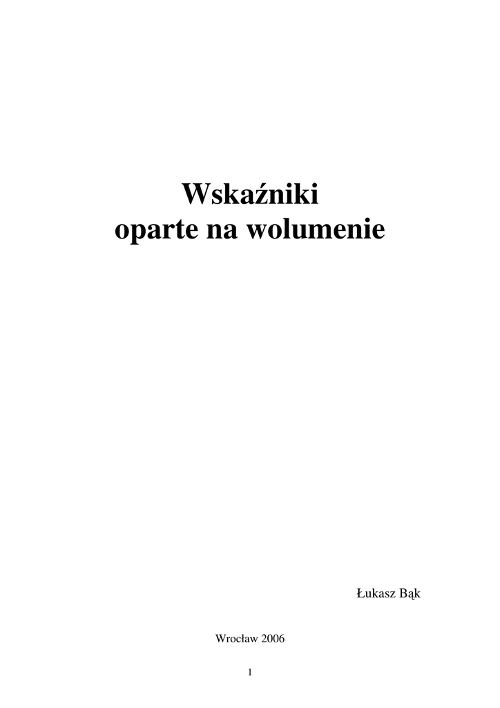 Wskaźniki oparte na wolumenie Łukasz Bąk Wrocław 2006 1 Wolumen Wolumen reprezentuje aktywność inwestorów krótko- i długoterminowych na rynku. Każda jednostka wolumenu jest wynikiem działania dwóch osób na rynku :inwestora sprzedającego akcje lub kontrakt oraz inwestora kupującego akcje lub kontrakt. Dzienny wolumen obrotu jest liczbą kontraktów lub akcji, które zmieniły właściciela w ciągu jednego dnia. Wolumen najczęściej jest przedstawiany w postaci histogramu, który jest wykreślany pod wykresem ceny. Wysokość słupka odzwierciedla poziom wolumenu w danym dniu. Zmiany wolumenu ujawniają nam reakcje byków i niedźwiedzi na wahania cen oraz mówią nam czy bardziej prawdopodobna jest kontynuacja czy też odwrócenie obecnego trendu. Analiza wolumenu umożliwia lepsze zrozumienie. Trzy sposoby pomiaru wolumenu: a) liczba akcji lub kontraktów stanowiących aktualnie przedmiot obrotu b) liczba zawartych transakcji c) „Tick wolumen” to liczba zmian cen w wybranym przedziale czasu Porównując dwa rynki pod względem wolumenu możemy określić, który jest bardziej aktywny bądź bardziej płynny. Wolumen pokazuje stopień finansowego i emocjonalnego zaangażowania uczestników rynku, a także ból i cierpienie. Jeśli ceny rosną – niedźwiedzie cierpią, a kiedy ceny spadają byki odczuwają ból. Im większy wzrost wolumenu tym większe cierpienie pojawia się na rynku. Stabilny poziom wolumenu pokazuje nam, że trend będzie prawdopodobnie kontynuowany. Zniżkujący wolumen sygnalizuje zbliżające się odwrócenie trendu. Nagły wzrost wolumenu również daje sygnał bliskiego końca trendu. W formacjach horyzontalnych wolumen utrzymuje się zwykle na niskim poziomie. Wybicie z takich formacji wiąże się z nagłym wzrostem wolumenu. Jeśli wybicie nastąpi przy niskim wolumenie, to prawdopodobnie ceny powrócą do formacji horyzontalnej. W praktyce sprawdza się reguła: jeżeli dzisiejszy wolumen jest wyższy od wolumenu z wczorajszego dnia, aktualny trend będzie prawdopodobnie kontynuowany. Terminy „wysoki wolumen” i niski wolumen” są względne, ponieważ wysoki wolumen na spółce STALEXPORT byłby niskim wolumenem dla BIOTONU. Przyjmuje się, że wysoki wolumen dla danego instrumentu to wolumen o 25% większy od średniej z ostatnich dwóch tygodni. Śledząc jednocześnie ceny i wolumen, używamy dwóch odmiennych narzędzi do obserwacji tego samego zjawiska – kierunku trendu. Na podstawie wzrastających cen wyciągamy wniosek, że popyt jest większy od podaży. Logiczne jest zatem, że wolumen będzie zmierzał w tym samym kierunku co dominujący trend. Wskaźniki 1.Równowaga wolumenu(OBV On-Balance Volumen) Najprostszym i najpopularniejszym wskaźnikiem ułatwiającym analizę wolumenu, jest OBV.OBV jest wskaźnikiem opracowanym przez Jospha Granville’a. OBV jest narastającym saldem wolumenu. Codziennie zwyżkuje lub zniżkuje w zależności od wzrostu lub spadku cen w stosunku do poprzedniego dnia. Kiedy ceny akcji są wyższe od cen zamknięcia dnia poprzedniego wolumen zanotowany tego dnia jest dodawany do OBV. Jeżeli ceny spadły wolumen danego dnia jest odejmowany. Jeżeli natomiast cena zamknięcia jest równa cenie zamknięcia dnia poprzedniego, to wskaźnik OBV się nie zmienia. OBV często wzrasta lub spada wyprzedzając zmiany cen. Nowy szczyt OBV pokazuje nam ,że byki są silne i ceny 2 prawdopodobnie jeszcze wzrosną. Nowy dołek na OBV informuje nas o sile niedźwiedzi oraz o tym, że ceny prawdopodobnie jeszcze spadną. Układ szczytów i dołków OBV ma większe znaczenie niż jego wartość bezwzględna. OBV daje najsilniejsze sygnały kupna i sprzedaży wtedy, gdy tworzy dywergencje z cenami. Jeżeli ceny rosną i po chwilowym spadku zwyżkują do nowego szczytu, a w tym samym czasie OBV osiąga szczyt na niższym poziomie niż podczas poprzedniego wzrostu, powstaje dywergencja „niedźwiedzia”(bessy). Daje ona silny sygnał sprzedaży. Jeśli ceny zniżkują i po chwilowej zwyżce spadają do nowego dołka, a równocześnie OBV osiąga nowe dno na wyższym poziomi niż podczas poprzedniego spadku, powstaje dywergencja „byka” (hossy). Silniejsze sygnały płynną z dywergencji, która formuje się na przestrzeni kilku tygodni, a nie kilku dni. Kiedy ceny oscylują w formacji horyzontalnej, a OBV zwyżkuje, pojawia się sygnał kupna. Jeżeli OBV zniżkuje do nowego dna , pojawia się sygnał sprzedaży „krótkiej”. Wadą OBV jest przypisywanie wartości dodatniej bądź ujemnej wolumenowi z całego dnia. Jeżeli rynek zamyka się na minimalnie wyższym poziomie, np. jeden albo dwa punkty wyżej , to cała dzienna wartość wolumenu powiększa wartość wskaźnika OBV. 2.Akumulacja/dystrybucja (A/D) Wskaźnik akumulacja/dystrybucja został opracowany przez Larry’ego Williamsa. Został ona zaprojektowany jako wskaźnik wyprzedzający trend. A/D śledzi relacje pomiędzy cenami otwarcia i zamknięcia z uwzględnieniem wolumenu. Jeżeli ceny zamknięcia są wyższe od cen otwarcia to A/D jest dodatni. Jeżeli zamknięcia są niższe niż otwarcia to A/D staje się ujemny. Jeżeli ceny otwarcia są równe cenom zamknięcia to A/D wynosi zero. A/D przypisuje bykom i niedźwiedziom tylko ułamek wolumenu każdego dnia. Wielkość tego ułamka zależy od dziennego zakresu wahań cen (cena max i cena min) oraz dystansu pomiędzy ceną otwarcia i zamknięcia. Im większa rozpiętość pomiędzy nimi w stosunku do dziennego zakresu wahań cen, tym większa zmiana wskaźnika akumulacja/ dystrybucja. 3 cena zamknięcia- cena otwarcia A/D= najwyższa cena – najniższa cena W czasie zwyżki większość ludzi koncentruje swoją uwagę na nowych szczytach. Jeżeli jednak ceny otwarcia danej sesji są wyższe od cen zamknięcia, wówczas A/D, który śledzi wzajemną relacje, zaczyna zniżkować. Ostrzega nas ,że trend wzrostowy jest słabszy , niż się wydaje. Gdy A/D zaczyna zwyżkować, a w tym czasie na