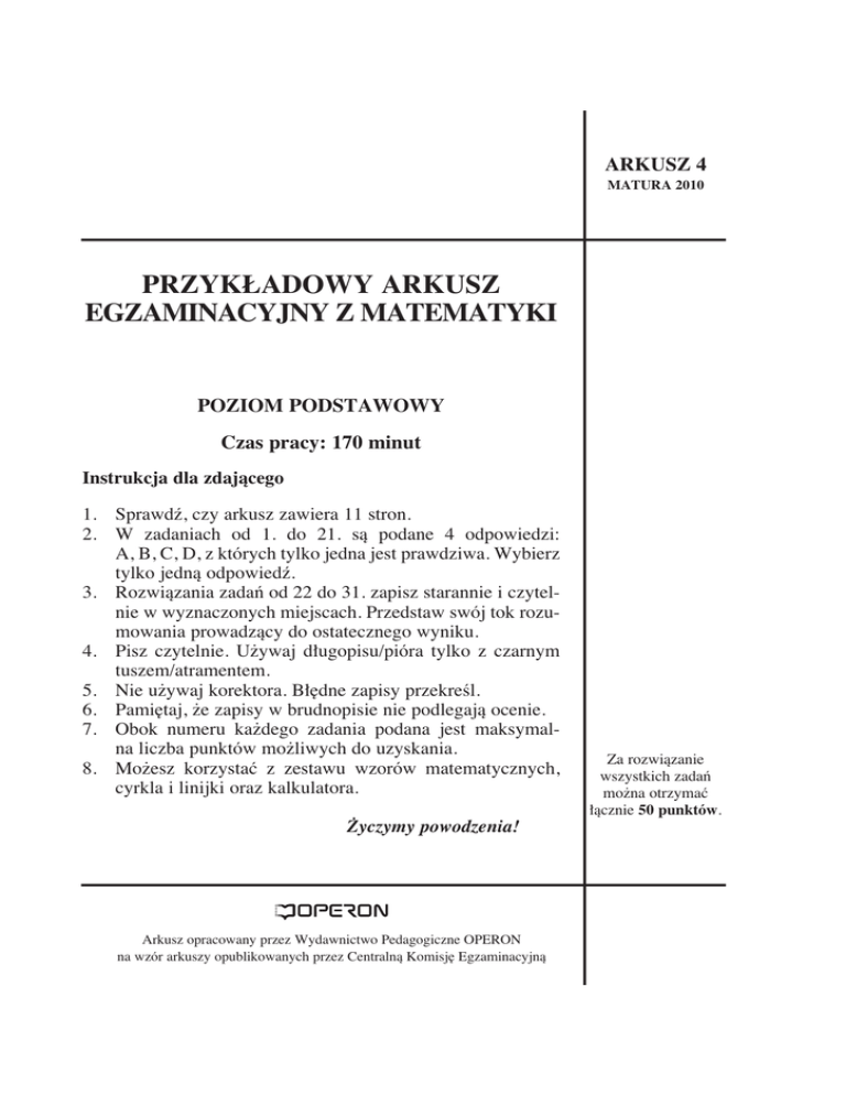 ARKUSZ 4 MATURA 2010 PRZYK¸ADOWY ARKUSZ EGZAMINACYJNY Z MATEMATYKI POZIOM PODSTAWOWY Czas pracy: 170 minut Instrukcja dla zdajàcego 1. 2. 3. 4. 5. 6. 7. 8. Sprawdê, czy arkusz zawiera 11 stron. W zadaniach od 1. do 21. sà podane 4 odpowiedzi: A, B, C, D, z których tylko jedna jest prawdziwa. Wybierz tylko jednà odpowiedê. Rozwiàzania zadaƒ od 22 do 31. zapisz starannie i czytelnie w wyznaczonych miejscach. Przedstaw swój tok rozumowania prowadzàcy do ostatecznego wyniku. Pisz czytelnie. U˝ywaj d∏ugopisu/pióra tylko z czarnym tuszem/atramentem. Nie u˝ywaj korektora. B∏´dne zapisy przekreÊl. Pami´taj, ˝e zapisy w brudnopisie nie podlegajà ocenie. Obok numeru ka˝dego zadania podana jest maksymalna liczba punktów mo˝liwych do uzyskania. Mo˝esz korzystaç z zestawu wzorów matematycznych, cyrkla i linijki oraz kalkulatora. ˚yczymy powodzenia! Arkusz opracowany przez Wydawnictwo Pedagogiczne OPERON na wzór arkuszy opublikowanych przez Centralnà Komisj´ Egzaminacyjnà Za rozwiàzanie wszystkich zadaƒ mo˝na otrzymaç ∏àcznie 50 punktów. 3 Matematyka. Poziom podstawowy ZADANIA ZAMKNI¢TE W zadaniach od 1. do 21. wybierz i zaznacz na karcie odpowiedzi jednà poprawnà odpowiedê. Zadanie 1. (1 pkt) Wyra˝enie 3 4 $ 16 $ 1 zapisane w postaci pot´gi liczby 2, to: 2 A. 2 -7 3 B. 2 -4 3 C. 2 25 6 D. 2 26 6 Zadanie 2. (1 pkt) Zmieszano 200 litrów mleka 2% i 50 litrów mleka 4%. Otrzymano mleko, które ma w sobie p% t∏uszczu. Wynika stàd, ˝e: A. p = 3 B. p = 2,4 C. p = 2,5 D. p = 3,2 Zadanie 3. (1 pkt) 4 4 Liczba a = log 25 + log 4 . Wynika stàd, ˝e: B. a = 8 A. a = 4 C. a = 8 + log 29 D. a = 8 + log 29 Zadanie 4. (1 pkt) JeÊli A = - 4, 5 , B = #5, 6 -, to ró˝nica A[B jest równa: A. - 4, 5i C. - 4, 5i , # 6 - B. - 4, 6 i D. - 4, 5i , _5, 6 i Zadanie 5. (1 pkt) WartoÊç wyra˝enia ` 2 - 7 j - ` 3 + 7 j jest równa: 2 A. - 1 2 B. - 5 C. - 1 - 2 7 D. - 5 + 2 7 Zadanie 6. (1 pkt) Zbiór liczb, których odleg∏oÊç na osi liczbowej od liczby _ - 9i jest równa 4, mo˝na opisaç równaniem: A. x + 9 = 4 B. x - 9 = 4 C. x - 4 = 9 D. x + 4 = 9 Zadanie 7. (1 pkt) 3 2 Dany jest wielomian W (x) = x - x . WartoÊç tego wielomianu w punkcie 2 + 1 jest równa: A. - 3 2 - 8 B. 2 - 6 C. 3 2 + 4 D. 3 2 - 10 Zadanie 8. (1 pkt) JeÊli do wykresu funkcji wyk∏adniczej f nale˝y punkt P = _ - 1, 3i, to funkcja ta okreÊlona jest wzorem: A. f (x) = 3 x B. f (x) = 9 x C. f _ x i = c 1 m x 3 D. f _ x i = c 1 m x 9 Zadanie 9. (1 pkt) Przedzia∏ _ - 6, 11i jest zbiorem rozwiàzaƒ nierównoÊci: A. _ x + 6 i_11 - x i > 0 B. _ x - 6 i_11 - x i < 0 C. _ x + 6 i_ x - 11i > 0 D. _ x - 6 i_11 + x i < 0 4 Matematyka. Poziom podstawowy Zadanie 10. (1 pkt) Zbiór rozwiàzaƒ równania _ x - 1i = x - 2 _ x + 1i + 3 to: 2 A. # 0 - 2 B. #1- C. R D. Q Zadanie 11. (1 pkt) Proste o równaniach l: 2x - 3y = 5 i k: _ m + 1i x - y = 4 sà równoleg∏e. Wynika stàd, ˝e: B. m = 1 A. m =- 3 C. m =- 1 3 D. m = 1 3 Zadanie 12. (1 pkt) Funkcja f (x) = a m - m k x - 3 jest funkcjà sta∏à. Wynika stàd, ˝e: 2 A. m = 1 C. m =- 1 0 m = 0 B. m = 0 D. m = 1 0 m = 0 Zadanie 13. (1 pkt) 2 Funkcja okreÊlona wzorem f (x) = x + x - 4 nie przyjmuje wartoÊci: B. - 4 C. 0 A. - 5 D. 2 Zadanie 14. (1 pkt) 2 Odleg∏oÊç wierzcho∏ka paraboli f (x) = x - 10x + 8 od osi OX jest równa: A. 5 B. 17 C. 5 D. 17 Zadanie 15. (1 pkt) Osià symetrii paraboli b´dàcej wykresem funkcji y = _ x - 5i_ x + 15i jest prosta o równaniu: A. y =- 5 B. y = 5 C. x =- 5 D. x = 5 Zadanie 16. (1 pkt) Dana jest funkcja okreÊlona wzorem f (x) = 3x . WartoÊç tej funkcji w punkcie 5 - 2 jest równa: A. 5 + 2 B. 3 5 + 3 2 C. 3 5-3 2 7 D. 3 5+3 2 7 Zadanie 17. (1 pkt) JeÊli przyprostokàtne trójkàta prostokàtnego sà równe 6 i 3, a najmniejszy kàt ma miar´ a, to wyra˝enie W = sin a cos a ma wartoÊç: A. 4 5 5 B. 2 5 5 C. 5 D. 2 2 5 Zadanie 18. (1 pkt) Drugi wyraz ciàgu arytmetycznego jest równy 12, a trzeci wyraz jest równy 5. Wzór na ogólny wyraz tego ciàgu to: A. a n = 26 - 7n B. a n = 12 + 7n C. a n = 12 + 5n D. a n = 12n + 5 Zadanie 19. (1 pkt) Dany jest ciàg geometryczny o wyrazie ogólnym a n =- 5 _ - 3i . Trzeci wyraz tego ciàgu jest równy: n A. - 135 B. - 45 C. 45 D. 135 5 Matematyka. Poziom podstawowy Zadanie 20. (1 pkt) Je˝eli promieƒ podstawy sto˝ka zwi´kszymy o 20%, a wysokoÊç zmniejszymy o 20%, to obj´toÊç sto˝ka: A. nie zmieni si´ B. zwi´kszy si´ o 15,2% C. zwi´kszy si´ o 1,52% D. zmniejszy si´ o 4% Zadanie 21. (1 pkt) Ârednia wa˝ona danych z tabeli: WartoÊç danej Waga 4 2 5 1 6 1 8 3 jest równa: A. 2.3 B. 5, 8 C. 5, 75 D. 14, 5 ZADANIA OTWARTE Rozwiàzania zadaƒ o numerach od 22. do 31. nale˝y zapisaç w wyznaczonych miejscach pod treÊcià zadania. Zadanie 22. (2 pkt) Wyznacz równanie prostej prostopad∏ej do prostej y =- 2x + 8 przechodzàcej przez punkt A = _ 6, - 1i. 6 Matematyka. Poziom podstawowy Zadanie 23. (2 pkt) Kàt a jest kàtem ostrym i tg a = 4. Wyznacz sinus i cosinus tego kàta. Zadanie 24. (2 pkt) 2 Wyznacz dziedzin´ funkcji f (x) = 3x - 2x. Matematyka. Poziom podstawowy 7 Zadanie 25. (2 pkt) Ârednia arytmetyczna liczb: - 2, 2, 4, 6, 8, x jest równa 5. Wyznacz liczb´ x. Zadanie 26. (2 pkt) n Wyka˝, ˝e liczba x = 4 - 5 $ 2 ca∏kowitej. n+1 + 25 jest dla dowolnej liczby naturalnej n kwadratem liczby 8 Zadanie 27. (2 pkt) Narysuj wykres funkcji f (x) = * Matematyka. Poziom podstawowy - 2x + 3 dla x ! _ - 4, -1i . 2 x - 4x dla x ! - 1, 5 Zadanie 28. (2 pkt) Liczby 2x - 3, 5x, x - 7 sà trzema poczàtkowymi wyrazami ciàgu arytmetycznego. Wyznacz liczb´ x. Matematyka. Poziom podstawowy 9 Zadanie 29. (4 pkt) 2 2 Okràg o równaniu x - 6x + y - 2y + 2 = 0 i prosta x + 3y + 2 = 0 przecinajà si´ w punktach A, B. Wyznacz d∏ugoÊç ci´ciwy AB tego okr´gu. 10 Matematyka. Poziom podstawowy Zadanie 30. (5 pkt) Rzucono 8 razy monetà. Oblicz prawdopodobieƒstwo, ˝e wyrzucono or∏a: a) co najmniej raz, b) dok∏adnie 1 raz. 11 Matematyka. Poziom podstawo