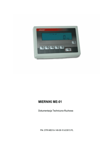 MIERNIKI ME-01 Dokumentacja Techniczno-Ruchowa Plik: DTR-ME01A-146-08-10 bC0013 PL 2 INSTRUKCJA OBSŁUGI _____________________________________________________________________________________________________________________ Spis treści: 1. Wstęp............................................................................................................................ 3 2. Kompletacja .................................................................................................................. 3 3. Dane techniczne ........................................................................................................... 4 4. Klawisze i wskaźniki wagi ............................................................................................. 6 5. Zasady bezpieczeństwa................................................................................................ 7 6. Zasady postępowania ze zuŜytą wagą.......................................................................... 7 7. MontaŜ i podłączenie urządzeń zewnętrznych .............................................................. 8 7.1 Złącza komunikacyjne ............................................................................................... 9 7.2 Złącze przekaźników ............................................................................................... 10 7.3 Złącze zewnętrznych klawiszy................................................................................. 11 7.4 Złącze 4-20mA ........................................................................................................ 12 8. Start wagi.................................................................................................................... 13 9. Zasady eksploatacji..................................................................................................... 14 10. Sprawdzenie wagi ................................................................................................... 15 11. Adjustacja wagi ....................................................................................................... 15 12. Wymiana akumulatorów (opcja) .............................................................................. 15 13. Połączenie z komputerem lub drukarką (opcja)....................................................... 16 14. Podstawowe funkcje wagi ....................................................................................... 19 14.1 Zwykłe waŜenie....................................................................................................... 19 14.2 WaŜenie z tarowaniem ............................................................................................ 20 14.3 Powiększenie rozdzielczości wagi ........................................................................... 20 15. Funkcje specjalne wagi ........................................................................................... 21 15.1 Funkcja autotarowania (AutotA) .............................................................................. 22 15.2 Funkcja liczenia sztuk (PCS)................................................................................... 23 15.3 Funkcja zmiany jednostki masy (UnIt) ..................................................................... 24 15.4 Funkcja przeliczania procentowego (PErC)............................................................. 25 15.5 Funkcja ustawiania parametrów portu szeregowego (Port-1).................................. 26 15.6 Konfiguracja wydruków (Print)................................................................................. 27 15.7 Funkcja ustawiania podświetlenia (b_LIGHt)........................................................... 28 15.8 Funkcja wyboru numeru etykiety (LAbEL) ............................................................... 29 15.9 Funkcja pamięci tar (tArE) ....................................................................................... 30 15.10 Funkcja ładowania akumulatorów (bAttErY) ............................................................ 32 15.11 Funkcja automatycznego wyłączania wagi (Auto OFF) ........................................... 33 15.12 Funkcja zmiany głównej jednostki masy (lb_bAL) – opcja ...................................... 34 15.13 Aktualizacja menu funkcji specjalnych (ACtIV i dEFAULt) ....................................... 35 16. Konserwacja i usuwanie drobnych uszkodzeń ........................................................ 36 3 INSTRUKCJA OBSŁUGI _____________________________________________________________________________________________________________________ 1. Wstęp Miernik ME-01 jest gotowym podzespołem przeznaczonym do budowy wag jedno lub dwuzakresowych wykorzystujących tensometryczne czujniki siły. Wersje miernika: - ME-01/A/LED – obudowa z aluminium lakier., wyświetlacze LED18mm, - ME-01/N/LCD – obudowa z aluminium lakier., wyświetlacz LCD18mm, - ME-01/N/LED – obudowa ze stali nierdzewnej, wyświetlacze LED18mm, - ME-01/N/LCD – obudowa ze stali nierdzewnej, wyświetlacz LCD18mm, - ME-01/N/25 – obudowa ze stali nierdzewnej, wyświetlacz LED25mm, Standardowo miernik ME-01 stanowi podzespół i pomostowych, produkowanych przez AXIS. wag platformowych KaŜdy miernik posiada zestaw funkcji specjalnych: autozerowanie, liczenie sztuk, porównywanie z wartościami progowymi itd., które mogą być udostępnione uŜytkownikowi lub nie - zgodnie z jego zamówieniem. W dalszej części instrukcji opisane jest działanie miernika ME-01 jako części kompletnej wagi. 2. Kompletacja Podstawowy zestaw obejmuje: 1. Miernik ME-01 2. Rdzeń TN/20/10/7-3C90– 1 szt. 3. Dokumentacja techniczno-ruchowa 4 INSTRUKCJA OBSŁUGI _____________________________________________________________________________________________________________________ 3. Dane techniczne Parametr Przeznaczenie Maksymalna liczba działek elementarnych Rozdzielczość wewnętrzna Napięcie