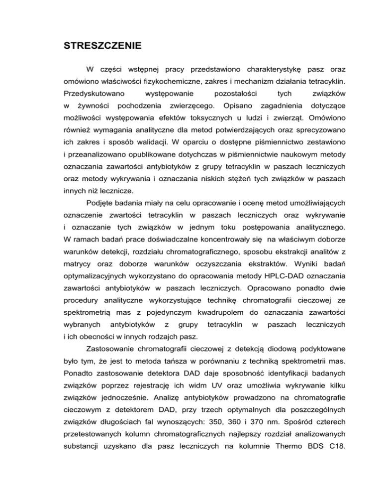 STRESZCZENIE W części wstępnej pracy przedstawiono charakterystykę pasz oraz omówiono właściwości fizykochemiczne, zakres i mechanizm działania tetracyklin. Przedyskutowano w żywności występowanie pochodzenia pozostałości zwierzęcego. Opisano tych zagadnienia związków dotyczące możliwości występowania efektów toksycznych u ludzi i zwierząt. Omówiono również wymagania analityczne dla metod potwierdzających oraz sprecyzowano ich zakres i sposób walidacji. W oparciu o dostępne piśmiennictwo zestawiono i przeanalizowano opublikowane dotychczas w piśmiennictwie naukowym metody oznaczania zawartości antybiotyków z grupy tetracyklin w paszach leczniczych oraz metody wykrywania i oznaczania niskich stężeń tych związków w paszach innych niż lecznicze. Podjęte badania miały na celu opracowanie i ocenę metod umożliwiających oznaczenie zwartości tetracyklin w paszach leczniczych oraz wykrywanie i oznaczanie tych związków w jednym toku postępowania analitycznego. W ramach badań prace doświadczalne koncentrowały się na właściwym doborze warunków detekcji, rozdziału chromatograficznego, sposobu ekstrakcji analitów z matrycy oraz doborze warunków oczyszczania ekstraktów. Wyniki badań optymalizacyjnych wykorzystano do opracowania metody HPLC-DAD oznaczania zawartości antybiotyków w paszach leczniczych. Opracowano ponadto dwie procedury analityczne wykorzystujące technikę chromatografii cieczowej ze spektrometrią mas z pojedynczym kwadrupolem do oznaczania zawartości wybranych antybiotyków z grupy tetracyklin w paszach leczniczych i ich obecności w innych rodzajch pasz. Zastosowanie chromatografii cieczowej z detekcją diodową podyktowane było tym, że jest to metoda tańsza w porównaniu z techniką spektrometrii mas. Ponadto zastosowanie detektora DAD daje sposobność identyfikacji badanych związków poprzez rejestrację ich widm UV oraz umożliwia wykrywanie kilku związków jednocześnie. Analizę antybiotyków prowadzono na chromatografie cieczowym z detektorem DAD, przy trzech optymalnych dla poszczególnych związków długościach fal wynoszących: 350, 360 i 370 nm. Spośród czterech przetestowanych kolumn chromatograficznych najlepszy rozdział analizowanych substancji uzyskano dla pasz leczniczych na kolumnie Thermo BDS C18. W analizie oznaczania tetracyklin w paszach leczniczych zastosowano micelarną fazę ruchomą składająca się z 7% butanolu, 0,02 M kwasu szczawiowego i 0,03 M dodecylosiarczanu sodu, przy przepływie fazy 0,8 ml/min i temperaturze termostatu kolumny 20ºC. W procedurach wykorzystujących technikę LC-MS badania rozpoczęto od zoptymalizowania warunków pracy detektora mas. Zastosowano pozytywną jonizację przez elektrorozpraszanie. Rozdział chromatograficzny przeprowadzono na kolumnach w odwróconym układzie faz z wypełnieniem oktadecylowym, z zastosowaniem elucji gradientowej i fazy ruchomej składającej się z 0,1% wodnego roztworu kwasu mrówkowego i 0,1% kwasu mrówkowego w acetonitrylu. W kolejnym etapie badań opracowano sposób izolacji tetracyklin z pasz leczniczych i innych rodzajów pasz przy użyciu ekstrakcji ciecz-ciało stałe i ekstrakcji do fazy stałej (SPE). W wyniku przeprowadzonych badań nad ekstrakcją do fazy stałej stwierdzono, że najbardziej satysfakcjonujące wyniki dla badanych związków otrzymano dla kolumienek kationowymiennych (Strata-XCW), które zastosowano do oczyszczania tetracyklin w paszach innych niż lecznicze. W przypadku pasz leczniczych, w których analizowane związki występują w wysokich stężeniach zastosowano oczyszczanie ekstraktu przez nylonowe filtry strzykawkowe dla techniki HPLC-DAD, natomiast dla techniki LC-MS poprzez 100-krotne rozcieńczenie ekstraktów paszowych w wodzie dejonizowanej o pierwszej klasie czystości. Po zoptymalizowaniu warunków pracy kolumienek, dokonano doboru warunków ekstrakcji antybiotyków z pasz leczniczych i innych rodzajów pasz. W przypadku pasz leczniczych wykazano, że najlepsze wyniki ekstrakcji daje mieszanina 0,01M buforu cytrynowego o pH 3 i acetonitrylu dla metody HPLC-DAD. Z kolei dla metody LC-MS najkorzystniejszym ekstrahentem okazała się mieszanina buforu McIlvaine’a-Na2EDTA o pH 4 z metanolem, natomiast do ekstrakcji niskich stężeń antybiotyków z innych rodzajów pasz najlepsze efekty uzyskano dla buforu McIlvaine’a-Na2EDTA o pH 4. Przeprowadzone z zastosowaniem przygotowanych metod badania wpływu rodzaju próbek pasz i techniki detekcji na wynik analizy wykazały, że rodzaj mieszanki paszowej nie ma wpływu na wynik badania. Natomiast zastosowanie tej samej metody ekstrakcji tetracyklin z pasz leczniczych dla dwóch różnych technik detekcji ma istotny wpływ na końcowy wynik analizy. W związku z tym opracowano umożliwiającą nową metodę uzyskanie ekstrakcji wyższych TCs z próbek odzysków pasz leczniczych substancji czynnych z zastosowaniem chromatografii cieczowej ze spektrometrią mas. Opracowane procedury zostały w pełni zwalidowane zgodnie z wymaganiami określonymi w Decyzji Komisji 2002/657/EC, spełniają kryteria analityczne i umożliwiają oznaczenie tetracyklin w paszach leczniczych oraz innych rodzajach pasz. Opracowane metody analityczne przygotowano w formie procedur badawczych, które zostaną wdrożone do badań w ramach Krajowego Planu Urzędowej Kontroli Pasz w Polsce. SUMMARY In the initial part of the study one presents characteristics of the feeds and discusses the physicochemical properties, the extent and mechanism of action of tetracyclines. One also discussed the presence of residues of these compounds in foods of animal origin, and the issues concerning the possibility of the occurrence of toxic effects in humans and animals. The paper also discusses the analytical requirements for confirmatory methods and clarifies their scope and validation procedure. Based on the available scientific literature, the previously published described methods for th