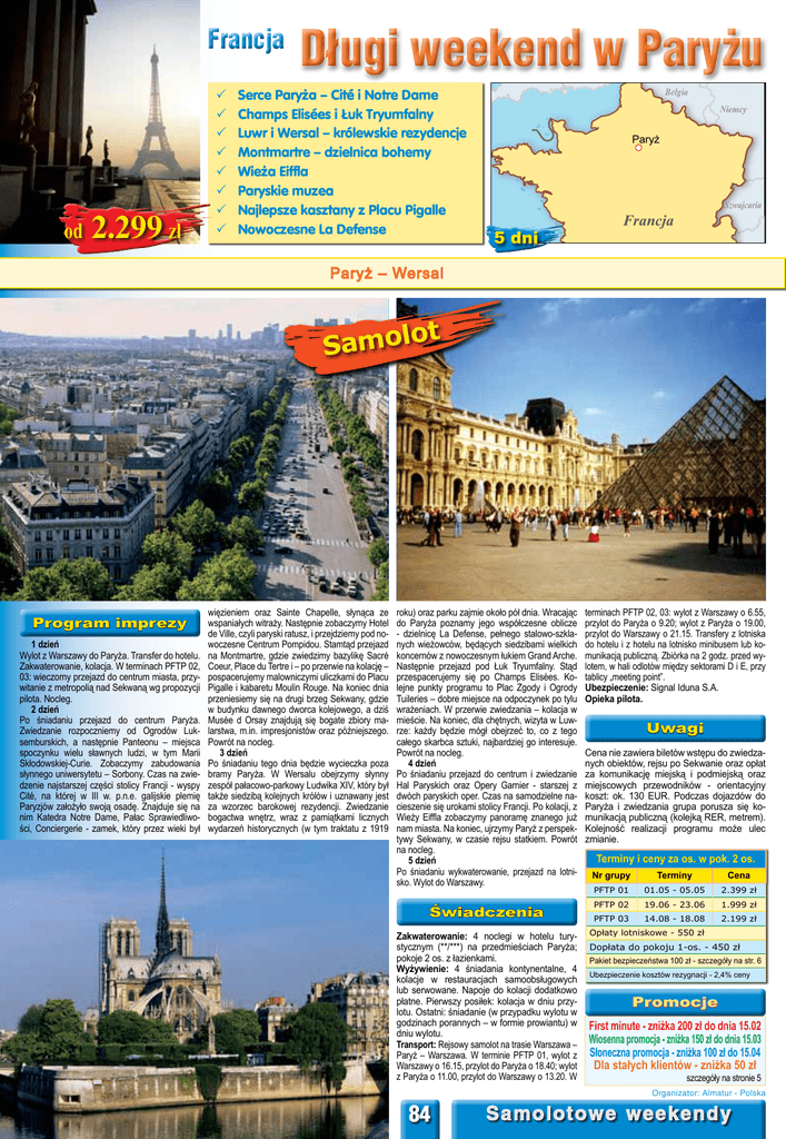 Francja Długi weekend w Paryżu U i d Kingdom United Ki d od 2.299 zł P P P P P P P P Serce Paryża – Cité i Notre Dame Champs Elisées i Łuk Tryumfalny Luwr i Wersal – królewskie rezydencje Montmartre – dzielnica bohemy Wieża Eiffla Paryskie muzea Najlepsze kasztany z Placu Pigalle Nowoczesne La Defense Belgia Niemcy Paryż Atlantic 5 dni Ocean Szwajcaria Francja Włochy Paryż – Wersal ot Samol Program imprezy 1 dzień Wylot z Warszawy do Paryża. Transfer do hotelu. Zakwaterowanie, kolacja. W terminach PFTP 02, 03: wieczorny przejazd do centrum miasta, przywitanie z metropolią nad Sekwaną wg propozycji pilota. Nocleg. 2 dzień Po śniadaniu przejazd do centrum Paryża. Zwiedzanie rozpoczniemy od Ogrodów Luksemburskich, a następnie Panteonu – miejsca spoczynku wielu sławnych ludzi, w tym Marii Skłodowskiej-Curie. Zobaczymy zabudowania słynnego uniwersytetu – Sorbony. Czas na zwiedzenie najstarszej części stolicy Francji - wyspy Cité, na której w III w. p.n.e. galijskie plemię Paryzjów założyło swoją osadę. Znajduje się na nim Katedra Notre Dame, Pałac Sprawiedliwości, Conciergerie - zamek, który przez wieki był więzieniem oraz Sainte Chapelle, słynąca ze wspaniałych witraży. Następnie zobaczymy Hotel de Ville, czyli paryski ratusz, i przejdziemy pod nowoczesne Centrum Pompidou. Stamtąd przejazd na Montmartre, gdzie zwiedzimy bazylikę Sacré Coeur, Place du Tertre i – po przerwie na kolację – pospacerujemy malowniczymi uliczkami do Placu Pigalle i kabaretu Moulin Rouge. Na koniec dnia przeniesiemy się na drugi brzeg Sekwany, gdzie w budynku dawnego dworca kolejowego, a dziś Musée d Orsay znajdują się bogate zbiory malarstwa, m.in. impresjonistów oraz późniejszego. Powrót na nocleg. 3 dzień Po śniadaniu tego dnia będzie wycieczka poza bramy Paryża. W Wersalu obejrzymy słynny zespół pałacowo-parkowy Ludwika XIV, który był także siedzibą kolejnych królów i uznawany jest za wzorzec barokowej rezydencji. Zwiedzanie bogactwa wnętrz, wraz z pamiątkami licznych wydarzeń historycznych (w tym traktatu z 1919 roku) oraz parku zajmie około pół dnia. Wracając do Paryża poznamy jego współczesne oblicze - dzielnicę La Defense, pełnego stalowo-szklanych wieżowców, będących siedzibami wielkich koncernów z nowoczesnym łukiem Grand Arche. Następnie przejazd pod Łuk Tryumfalny. Stąd przespacerujemy się po Champs Elisées. Kolejne punkty programu to Plac Zgody i Ogrody Tuileries – dobre miejsce na odpoczynek po tylu wrażeniach. W przerwie zwiedzania – kolacja w mieście. Na koniec, dla chętnych, wizyta w Luwrze: każdy będzie mógł obejrzeć to, co z tego całego skarbca sztuki, najbardziej go interesuje. Powrót na nocleg. 4 dzień Po śniadaniu przejazd do centrum i zwiedzanie Hal Paryskich oraz Opery Garnier - starszej z dwóch paryskich oper. Czas na samodzielne nacieszenie się urokami stolicy Francji. Po kolacji, z Wieży Eiffla zobaczymy panoramę znanego już nam miasta. Na koniec, ujrzymy Paryż z perspektywy Sekwany, w czasie rejsu statkiem. Powrót na nocleg. 5 dzień Po śniadaniu wykwaterowanie, przejazd na lotnisko. Wylot do Warszawy. Świadczenia Zakwaterowanie: 4 noclegi w hotelu turystycznym (**/***) na przedmieściach Paryża; pokoje 2 os. z łazienkami. Wyżywienie: 4 śniadania kontynentalne, 4 kolacje w restauracjach samoobsługowych lub serwowane. Napoje do kolacji dodatkowo płatne. Pierwszy posiłek: kolacja w dniu przylotu. Ostatni: śniadanie (w przypadku wylotu w godzinach porannych – w formie prowiantu) w dniu wylotu. Transport: Rejsowy samolot na trasie Warszawa – Paryż – Warszawa. W terminie PFTP 01, wylot z Warszawy o 16.15, przylot do Paryża o 18.40; wylot z Paryża o 11.00, przylot do Warszawy o 13.20. W terminach PFTP 02, 03: wylot z Warszawy o 6.55, przylot do Paryża o 9.20; wylot z Paryża o 19.00, przylot do Warszawy o 21.15. Transfery z lotniska do hotelu i z hotelu na lotnisko minibusem lub komunikacją publiczną. Zbiórka na 2 godz. przed wylotem, w hali odlotów między sektorami D i E, przy tablicy „meeting point”. Ubezpieczenie: Signal Iduna S.A. Opieka pilota. Uwagi Cena nie zawiera biletów wstępu do zwiedzanych obiektów, rejsu po Sekwanie oraz opłat za komunikację miejską i podmiejską oraz miejscowych przewodników - orientacyjny koszt: ok. 130 EUR. Podczas dojazdów do Paryża i zwiedzania grupa porusza się komunikacją publiczną (kolejką RER, metrem). Kolejność realizacji programu może ulec zmianie. Terminy i ceny za os. w pok. 2 os. Nr grupy Terminy Cena PFTP 01 01.05 - 05.05 2.399 zł PFTP 02 19.06 - 23.06 1.999 zł PFTP 03 14.08 - 18.08 2.199 zł Opłaty lotniskowe - 550 zł Dopłata do pokoju 1-os. - 450 zł Pakiet bezpieczeństwa 100 zł - szczegóły na str. 6 Ubezpieczenie kosztów rezygnacji - 2,4% ceny Promocje First minute - zniżka 200 zł do dnia 15.02 Wiosenna promocja - zniżka 150 zł do dnia 15.03 Słoneczna promocja - zniżka 100 zł do 15.04 Dla stałych klientów - zniżka 50 zł szczegóły na stronie 5 Organizator: Almatur - Polska 84 Samolotowe weekendy