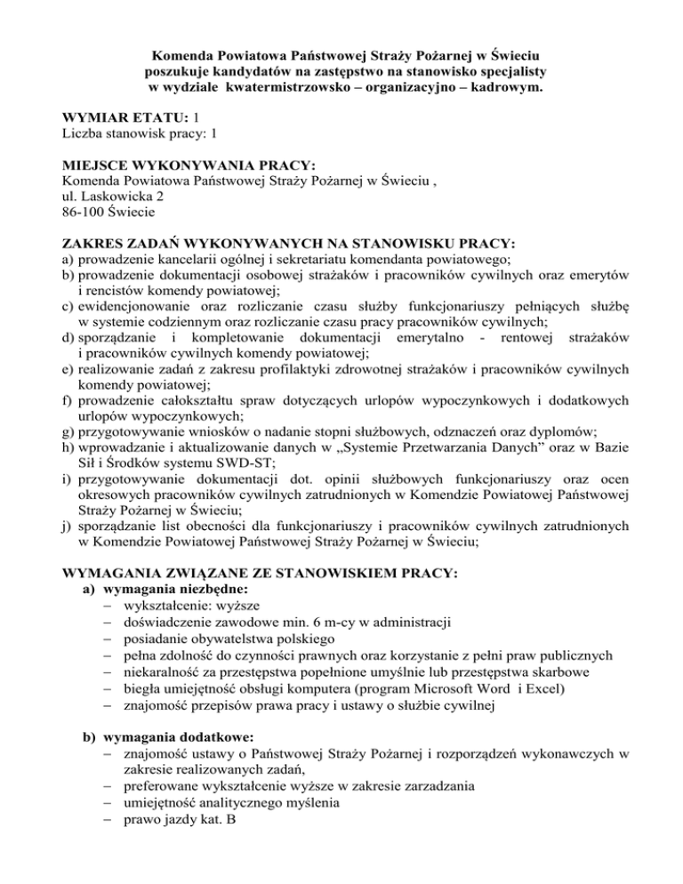 Komenda Powiatowa Państwowej Straży Pożarnej w Świeciu poszukuje kandydatów na zastępstwo na stanowisko specjalisty w wydziale kwatermistrzowsko – organizacyjno – kadrowym. WYMIAR ETATU: 1 Liczba stanowisk pracy: 1 MIEJSCE WYKONYWANIA PRACY: Komenda Powiatowa Państwowej Straży Pożarnej w Świeciu , ul. Laskowicka 2 86-100 Świecie ZAKRES ZADAŃ WYKONYWANYCH NA STANOWISKU PRACY: a) prowadzenie kancelarii ogólnej i sekretariatu komendanta powiatowego; b) prowadzenie dokumentacji osobowej strażaków i pracowników cywilnych oraz emerytów i rencistów komendy powiatowej; c) ewidencjonowanie oraz rozliczanie czasu służby funkcjonariuszy pełniących służbę w systemie codziennym oraz rozliczanie czasu pracy pracowników cywilnych; d) sporządzanie i kompletowanie dokumentacji emerytalno - rentowej strażaków i pracowników cywilnych komendy powiatowej; e) realizowanie zadań z zakresu profilaktyki zdrowotnej strażaków i pracowników cywilnych komendy powiatowej; f) prowadzenie całokształtu spraw dotyczących urlopów wypoczynkowych i dodatkowych urlopów wypoczynkowych; g) przygotowywanie wniosków o nadanie stopni służbowych, odznaczeń oraz dyplomów; h) wprowadzanie i aktualizowanie danych w „Systemie Przetwarzania Danych” oraz w Bazie Sił i Środków systemu SWD-ST; i) przygotowywanie dokumentacji dot. opinii służbowych funkcjonariuszy oraz ocen okresowych pracowników cywilnych zatrudnionych w Komendzie Powiatowej Państwowej Straży Pożarnej w Świeciu; j) sporządzanie list obecności dla funkcjonariuszy i pracowników cywilnych zatrudnionych w Komendzie Powiatowej Państwowej Straży Pożarnej w Świeciu; WYMAGANIA ZWIĄZANE ZE STANOWISKIEM PRACY: a) wymagania niezbędne: wykształcenie: wyższe doświadczenie zawodowe min. 6 m-cy w administracji posiadanie obywatelstwa polskiego pełna zdolność do czynności prawnych oraz korzystanie z pełni praw publicznych niekaralność za przestępstwa popełnione umyślnie lub przestępstwa skarbowe biegła umiejętność obsługi komputera (program Microsoft Word i Excel) znajomość przepisów prawa pracy i ustawy o służbie cywilnej b) wymagania dodatkowe: znajomość ustawy o Państwowej Straży Pożarnej i rozporządzeń wykonawczych w zakresie realizowanych zadań, preferowane wykształcenie wyższe w zakresie zarzadzania umiejętność analitycznego myślenia prawo jazdy kat. B WYMAGANE DOKUMENTY: życiorys i list motywacyjny oświadczenie kandydata o korzystaniu z pełni praw publicznych oświadczenie kandydata o nieskazaniu prawomocnym wyrokiem za umyśle przestępstwo lub umyślne przestępstwo skarbowe kopia dokumentów potwierdzających wykształcenie kopia dokumentów potwierdzających uzyskane kwalifikacje i doświadczenie zawodowe kopia dokumentu potwierdzającego posiadanie obywatelstwa polskiego, oświadczenie kandydata o wyrażeniu zgody na przetwarzanie danych osobowych do celów rekrutacji TERMIN SKŁADANIA DOKUMENTÓW: 06.07.2015 r. MIEJSCE SKŁADANIA DOKUMENTÓW: Komenda Powiatowa Państwowej Straży Pożarnej w Świeciu ul. Laskowicka 2 86-100 Świecie DODATKOWE INFORMACJE: Oferty złożone po terminie (decyduje data stempla pocztowego), niekompletne oraz nie spełniające wymogów formalnych nie będą rozpatrywane. Kandydaci zakwalifikowani zastaną powiadomieni telefonicznie o terminie dalszego postępowania kwalifikacyjnego. Przyjmowane są jedynie kserokopie dokumentów. Przewidywany termin rozpoczęcia pracy – 1 września 2015 roku. Szczegółowe informacje można uzyskać w wydziale kwatermistrzowsko – organizacyjno – kadrowym oraz pod nr telefonu 052 33 11 444 (wew. 14).