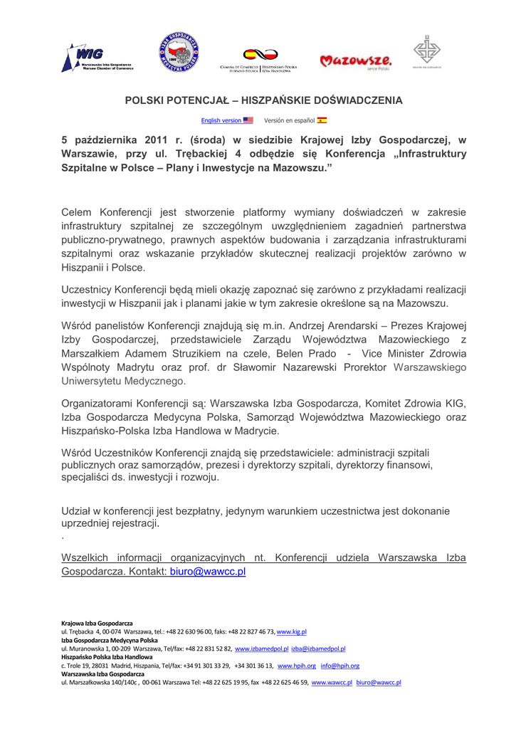 . POLSKI POTENCJAŁ – HISZPAŃSKIE DOŚWIADCZENIA English version Versión en español 5 października 2011 r. (środa) w siedzibie Krajowej Izby Gospodarczej, w Warszawie, przy ul. Trębackiej 4 odbędzie się Konferencja „Infrastruktury Szpitalne w Polsce – Plany i Inwestycje na Mazowszu.” Celem Konferencji jest stworzenie platformy wymiany doświadczeń w zakresie infrastruktury szpitalnej ze szczególnym uwzględnieniem zagadnień partnerstwa publiczno-prywatnego, prawnych aspektów budowania i zarządzania infrastrukturami szpitalnymi oraz wskazanie przykładów skutecznej realizacji projektów zarówno w Hiszpanii i Polsce. Uczestnicy Konferencji będą mieli okazję zapoznać się zarówno z przykładami realizacji inwestycji w Hiszpanii jak i planami jakie w tym zakresie określone są na Mazowszu. Wśród panelistów Konferencji znajdują się m.in. Andrzej Arendarski – Prezes Krajowej Izby Gospodarczej, przedstawiciele Zarządu Województwa Mazowieckiego z Marszałkiem Adamem Struzikiem na czele, Belen Prado - Vice Minister Zdrowia Wspólnoty Madrytu oraz prof. dr Sławomir Nazarewski Prorektor Warszawskiego Uniwersytetu Medycznego. Organizatorami Konferencji są: Warszawska Izba Gospodarcza, Komitet Zdrowia KIG, Izba Gospodarcza Medycyna Polska, Samorząd Województwa Mazowieckiego oraz Hiszpańsko-Polska Izba Handlowa w Madrycie. Wśród Uczestników Konferencji znajdą się przedstawiciele: administracji szpitali publicznych oraz samorządów, prezesi i dyrektorzy szpitali, dyrektorzy finansowi, specjaliści ds. inwestycji i rozwoju. Udział w konferencji jest bezpłatny, jedynym warunkiem uczestnictwa jest dokonanie uprzedniej rejestracji. . Wszelkich informacji organizacyjnych nt. Konferencji udziela Warszawska Izba Gospodarcza. Kontakt: [email protected] Krajowa Izba Gospodarcza ul. Trębacka 4, 00-074 Warszawa, tel.: +48 22 630 96 00, faks: +48 22 827 46 73, www.kig.pl Izba Gospodarcza Medycyna Polska ul. Muranowska 1, 00-209 Warszawa, Tel/fax: +48 22 831 52 82, www.izbamedpol.pl [email protected] Hiszpańsko Polska Izba Handlowa c. Trole 19, 28031 Madrid, Hiszpania, Tel/fax: +34 91 301 33 29, +34 301 36 13, www.hpih.org [email protected] Warszawska Izba Gospodarcza ul. Marszałkowska 140/140c , 00-061 Warszawa Tel: +48 22 625 19 95, fax +48 22 625 46 59, www.wawcc.pl [email protected] (Return to top) POLISH POWER AND CAPABILITIES – SPANISH EXPERIENCE The two day Conference “Hospital Infrastructures in Poland – Projects and Investments in Mazowsze” will take place at premises of Krajowa Izba Gospodarcza at Trębacka street 4 in Warsaw. The main purpose for the Conference is to create the communication and experience exchange platform taking into account especially public-private partnership issues, legal aspects of constructing and maintenance of hospital infrastructures plus pointing out the successful examples of Projects completion in Poland and Spain. All Conference entrants shall be acquainted with number of so far completed investment projects in Spain as well as the Project Plan Agenda to be completed in Mazowsze. There will also be some lectures given by experts, to name some of them: Andrzej Arendarski – President of Krajowa Izba Gospodarcza, Representatnts of Board of Ruling Committee of Województwo Mazowieckie with Speaker Adam Struziki, Belen Prado - Vice Minister of Health Madrid Community and prof. dr Sławomir Nazarewski Pro-rector of Warsaw Medical University. The Organizing Commission is formed by: Warsaw Chamber of Commerce, KIG Health Committee, Economic Chamber Medycyna Polska, Województwo Mazowieckie Autonomy and Spanish – Polish Chamber of Commerce in Madrid. As it is believed, among the entrants of the Conference there will be public hospitals and autonomies representants , managing board presidents and hospital directors, financial directors plus development and investment experts Conference admission is free of charge. The registration completing is the only stipulation to fulfill. In case of any questions on issues related to the Conference please, feel free to contact Warsaw Chamber of Commerce: [email protected] Krajowa Izba Gospodarcza ul. Trębacka 4, 00-074 Warszawa, tel.: +48 22 630 96 00, faks: +48 22 827 46 73, www.kig.pl Izba Gospodarcza Medycyna Polska ul. Muranowska 1, 00-209 Warszawa, Tel/fax: +48 22 831 52 82, www.izbamedpol.pl [email protected] Hiszpańsko Polska Izba Handlowa c. Trole 19, 28031 Madrid, Hiszpania, Tel/fax: +34 91 301 33 29, +34 301 36 13, www.hpih.org [email protected] Warszawska Izba Gospodarcza ul. Marszałkowska 140/140c , 00-061 Warszawa Tel: +48 22 625 19 95, fax +48 22 625 46 59, www.wawcc.pl [email protected]