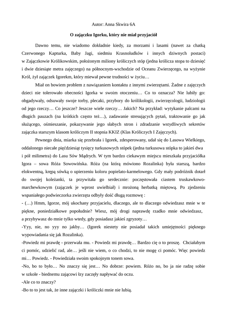Autor: Anna Skwira 6A O zajączku Igorku, który nie miał przyjaciół