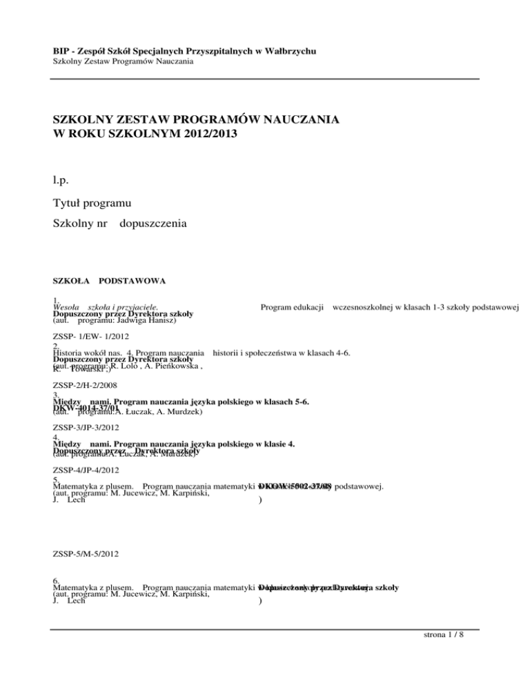 BIP - Zespół Szkół Specjalnych Przyszpitalnych w Wałbrzychu Szkolny Zestaw Programów Nauczania SZKOLNY ZESTAW PROGRAMÓW NAUCZANIA W ROKU SZKOLNYM 2012/2013 l.p. Tytuł programu Szkolny nr SZKOŁA dopuszczenia PODSTAWOWA 1. Wesoła szkoła i przyjaciele. Dopuszczony przez Dyrektora szkoły (aut. programu: Jadwiga Hanisz) ZSSP- 1/EW- 1/2012 2. Historia wokół nas. 4. Program nauczania Dopuszczony przez Dyrektora szkoły (aut. programu:,)R. Lolo , A. Pieńkowska , R. Towarski Program edukacji wczesnoszkolnej w klasach 1-3 szkoły podstawowej historii i społeczeństwa w klasach 4-6. ZSSP-2/H-2/2008 3. Między nami. Program nauczania języka polskiego w klasach 5-6. DKW-4014-37/01 (aut. programu:A. Łuczak, A. Murdzek) ZSSP-3/JP-3/2012 4. Między nami. Program nauczania języka polskiego w klasie 4. Dopuszczony przez Dyrektora szkoły (aut. programu:A. Łuczak, A. Murdzek) ZSSP-4/JP-4/2012 5. Matematyka z plusem. Program nauczania matematyki w DKOW-5002-37/08 klasach 5-6 szkoły podstawowej. (aut. programu: M. Jucewicz, M. Karpiński, J. Lech ) ZSSP-5/M-5/2012 6. Matematyka z plusem. Program nauczania matematyki w Dopuszczony klasie 4 szkoły przez podstawowej. Dyrektora szkoły (aut. programu: M. Jucewicz, M. Karpiński, J. Lech ) strona 1 / 8 BIP - Zespół Szkół Specjalnych Przyszpitalnych w Wałbrzychu Szkolny Zestaw Programów Nauczania ZSSP-6/M-6/2012 7. Tajemnice przyrody. Program nauczania przyrody w klasach 5-6 szkoły podstawowej. DKW-4014-165/99 (aut. programu: M. Kłyś, E. Sulejczak ) ZSSP-7/P-7/2012 8. Tajemnice przyrody. Program nauczania przyrody w klasie 4 szkoły podstawowej. Dopuszczony przez Dyrektora szkoły (aut. programu: M. Kłyś, E. Sulejczak ) ZSSP-8/P-8/2012 9. Plastyka. Program do nauki plastyki w kl. 4-6 szkoły podstawowej. Dopuszczony przez Dyrektora szkoły (aut. programu: A. Przybyszewska – Pietrasiak) ZSSP-9/PL-9/2012 10. New Sparks Plus. Program do nauki języka angielskiego w kl. 4-6 szkoły Dopuszczony przez Dyrektora szkoły (aut. programu: M. Ellis) podstawowej. ZSSP-10/A-10/2012 11. Odkrywamy na nowo. Program do nauki zajęć technicznych Dopuszczony w kl. 4-6przez szkołyDyrektora podstawowej. szkoły (aut. programu: U. Białka) ZSSP-11/T-11/2012 12. Iwgra muzyka. Program do nauki muzyki klasach 4-6 szkoły podstawowej. Dopuszczony przez Dyrektora szkoły (aut. programu: M. Gromek, G. Kilbach) ZSSP-12/MU-12/2012 13. Informatyka Europejczyka. Program do zajęć komputerowych dla klasy 4 szkoły Dopuszczony przez Dyrektora szkoły (aut. programu: D. Kiałka, K. Kiałka) podstawowej. Edycja: Windows XP, Linux Ubu strona 2 / 8 BIP - Zespół Szkół Specjalnych Przyszpitalnych w Wałbrzychu Szkolny Zestaw Programów Nauczania ZSSP-13/I-13/2012 14. Informatyka Europejczyka. Podręcznik do zajęć komputerowych dla klas 5-6 DKOS-5002-38/05 (aut. programu: D. Kiałka, K. Kiałka) szkoły podstawowej. Edycja: Windows XP+Office ZSSP-14/I-14/2012 15. W drodze do wieczernika. Program nauczania religii w klasach 1-2 szkoły podstawowej. AZ-1-01/10 (aut. programu: Komisja Wychowania Katolickiego Konferencji Episkopatu Polski) ZSSP-15/R-15/2012 16. W drodze do wieczernika. Program nauczania religii w klasie 3 szkoły podstawowej. AZ-1-01/1 (aut. programu: Komisja Wychowania Katolickiego Konferencji Episkopatu Polski) ZSSP-16/R-16/2012 17. Poznaję Boga i w Niego wierzę. Program nauczania religii w klasach 4-5 szkoły podstawowej. AZ-2-01/10 (aut. programu: Komisja Wychowania Katolickiego Konferencji Episkopatu Polski) ZSSP-17/R-17/2012 18. Wezwani Program nauczania religii w klasie 6przez szkołyBoga. podstawowej. AZ-2-01/1 (aut. programu: Komisja Wychowania Katolickiego Konferencji Episkopatu Polski) ZSSP-18/R-18/2012 19. Wychowanie fizyczne. Program wychowania fizycznego dla klas 4-6 szkoły podstawowej. Dopuszczony przez Dyrektora szkoły Program autorski Agnieszki Zając ZSSP-19/WF-19/2012 20. Ratownictwo i edukacja prozdrowotna. Program ratownictwa i edukacji Dopuszczony przez Dyrektora szkoły Program autorski Agnieszki Zając prozdrowotnej dla klas 1-3 szkoły podstawowej. ZSSP-20/EP-20/2012 21. Ratownictwo i edukacja prozdrowotna. Program ratownictwa i edukacji Dopuszczony przez Dyrektora szkoły Program autorski Agnieszki Zając prozdrowotnej dla klas 4-6 szkoły podstawowej. ZSSP-21/EP-21/2012 GIMNZAJUM 22. Puls życia. Program nauczania biologii w gimnazjum. Dopuszczony przez Dyrektora szkoły (aut. programu: A. Zdzienniecka) ZSSP-22/B-22/2012 23. Chemia Nowej Ery. Program nauczania chemii w gimnazjum Dopuszczony przez Dyrektora szkoły (aut. programu: Teresa Kulawik, Maria Litwin) ZSSP-23/CH-23/2012 strona 3 / 8 BIP - Zespół Szkół Specjalnych Przyszpitalnych w Wałbrzychu Szkolny Zestaw Programów Nauczania Ciekawa fizyka. 24. Program nauczania fizyki i astronomii w gimnazjum Dopuszczony przez ( E. Zając) ZSSP-24/F-24/2012 Dyrektora szkoły aut. programu: J. Poznańska, M. Rowińska, 25. Puls w Ziemi. Program nauczania geografii gimnazjum. Dopuszczony przez Dyrektora szkoły strona 4 / 8 BIP - Zespół Szkół Specjalnych Przyszpitalnych w Wałbrzychu Szkolny Zestaw Programów Nauczania (aut. programu: E.M. Tuz) ZSSP-25/G-25/2012 strona 5 / 8 BIP - Zespół Szkół Specjalnych Przyszpitalnych w Wałbrzychu Szkolny Zestaw Programów Nauczania 26. Bliżej . historii w gimnazjum Dopuszczony przez Program nauczania his Dyrektora szkoły (aut. programu: Mieloch, Katarzyna Błachowska) Anita Plum ZSSP-26/H-26/2012 27. Świat w słowach i obrazach. Program do kształcenia literackiego i kulturowego dla gimnazjum Dopuszczony Dyrektora szkoły (aut. programu:przez W. Bobiński) ZSSP-27/JP-27/2012 28. Matematyka 2001. Program nauczania matematyk Dopuszczony (aut. programu:przez Anna Dyrektora Dubiecka, szkoły Piotr Piskorski, W ZSSP-28/M-28/2012 29. Program nauczania w gimnazjum Dopuszczony przez plastyki Dyrektora szkoły (aut. programu. K. Czernicka ) strona 6 / 8 BIP - Zespół Szkół Specjalnych Przyszpitalnych w Wałbrzychu Szkolny Zesta