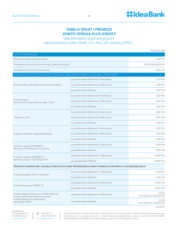 Duma Przedsiębiorcy 1/5 TABELA OPŁAT I PROWIZJI KONTO SPÓŁKA PLUS KREDYT (dla jednostek organizacyjnych) wprowadzona w Idea Bank S.A. dnia 26 czerwca 2015 r. Wysokość opłat Opłaty podstawowe Otwarcie Rachunku Rozliczeniowego 0,00 PLN Prowadzenie Rachunku Rozliczeniowego (opłata miesięczna) 0,00 PLN/29,99 PLN1 Zamknięcie Rachunku Rozliczeniowego 0,00 PLN Przelewy (zasady wykonywania przez Bank przelewów zawarte są w Tabeli Przelewów) Przelew między rachunkami prowadzonymi w Banku Przelew krajowy (na rachunek w innym banku w kraju – Elixir) Przelew do ZUS Przelew na rachunek Urzędu Skarbowego Przelew w systemie SORBNET2 dla kwoty 1 000 000,00 PLN i wyższej Przelew w systemie SORBNET2 dla kwoty poniżej 1 000 000,00 PLN za pośrednictwem Bankowości Internetowej 0,00 PLN za pośrednictwem Bankowości Telefonicznej 4,99 PLN za pośrednictwem Oddziału 4,99 PLN za pośrednictwem Bankowości Internetowej 0,00 PLN za pośrednictwem Bankowości Telefonicznej 4,99 PLN za pośrednictwem Oddziału 4,99 PLN za pośrednictwem Bankowości Internetowej 0,00 PLN za pośrednictwem Bankowości Telefonicznej 4,99 PLN za pośrednictwem Oddziału 4,99 PLN za pośrednictwem Bankowości Internetowej 0,00 PLN za pośrednictwem Bankowości Telefonicznej 4,99 PLN za pośrednictwem Oddziału 4,99 PLN za pośrednictwem Bankowości Telefonicznej 0,00 PLN za pośrednictwem Oddziału 0,00 PLN za pośrednictwem Bankowości Telefonicznej 29,99 PLN za pośrednictwem Oddziału 29,99 PLN PRZELEWY ZAGRANICZNE LUB WALUTOWE NA RACHUNKI PROWADZONE W INNYCH BANKACH KRAJOWYCH LUB ZAGRANICZNYCH za pośrednictwem Bankowości Telefonicznej 4,99 PLN za pośrednictwem Oddziału 4,99 PLN Przelew europejski (SEPA / EuroElixir) za pośrednictwem Bankowości Telefonicznej 19,99 PLN za pośrednictwem Oddziału 19,99 PLN Przelew ekspresowy (TARGET2) Przelew międzynarodowy oraz przelew walutowy (w tym przelew walut obcych na rachunki w innych bankach na terenie kraju) tryb zwykły (SWIFT) za pośrednictwem Bankowości Telefonicznej 0,25% min 29,99 max 100,00 PLN za pośrednictwem Oddziału 0,25% min 29,99 max 100,00 PLN 1602091244 Idea Bank S.A. ul. Przyokopowa 33 01-208 Warszawa www.ideabank.pl 801 999 111 +48 22 101 10 10 [email protected] T: Idea Bank Spółka Akcyjna z siedzibą w Warszawie, ul. Przyokopowa 33, 01-208 Warszawa, wpisana do rejestru przedsiębiorców prowadzonego przez Sąd Rejonowy dla m.st. Warszawy w Warszawie, XII Wydział Gospodarczy Krajowego Rejestru Sądowego, pod numerem KRS 0000026052, REGON 011063638, NIP 5260307560, której kapitał zakładowy wynosi 156 803 962 zł (opłacony w całości). Duma Przedsiębiorcy Przelew międzynarodowy oraz przelew walutowy (w tym przelew walut obcych na rachunki w innych bankach na terenie kraju) tryb przyśpieszony (SWIFT) Przelew międzynarodowy oraz przelew walutowy (w tym przelew walut obcych na rachunki w innych bankach na terenie kraju) tryb ekspresowy (SWIFT) 2/5 za pośrednictwem Bankowości Telefonicznej 0,25% min 39,99 max 150,00 PLN za pośrednictwem Oddziału 0,25% min 39,99 max 150,00 PLN za pośrednictwem Bankowości Telefonicznej 0,25% min 49,99 max 200,00 PLN za pośrednictwem Oddziału 0,25% min 49,99 max 200,00 PLN Dodatkowa opłata dla przelewów międzynarodowych oraz walutowych z opcją kosztową OUR (koszty podmiotów pośredniczących w wykonaniu polecenia przelewu lub banku odbiorcy) 70,00 PLN Anulowanie / zwrot wykonanego przez Bank polecenia przelewu zagranicznego / walutowego na wniosek Posiadacza Rachunku 50,00 PLN Zlecenie poszukiwania przelewu / postępowanie wyjaśniające wykonane na zlecenie Posiadacza Rachunku (opłaty nie pobiera się, jeśli przyczyną postępowania wyjaśniającego był błąd Banku) 50,00 PLN + koszty innych banków Bankowość Elektroniczna Dostęp do Bankowości Internetowej 0,00 PLN Dostęp do Bankowości Telefonicznej 0,00 PLN Utworzenie lub zmiana schematu akceptacji przelewu Utworzenie lub zmiana schematu akceptacji przelew za pośrednictwem Bankowości Internetowej 0,00 PLN za pośrednictwem Bankowości Telefonicznej 4,99 PLN za pośrednictwem Oddziału 4,99 PLN za pośrednictwem Bankowości Internetowej 0,00 PLN za pośrednictwem Bankowości Telefonicznej 4,99 PLN za pośrednictwem Oddziału 4,99 PLN Zarządzanie użytkownikami Dodanie Użytkownika Głównego po przyjęciu dyspozycji w formie pisemnej 4,99 PLN Usunięcie Użytkownika Głównego po przyjęciu dyspozycji w formie pisemnej 4,99 PLN Utworzenie Grupy Użytkowników za pośrednictwem Bankowości Internetowej 0,00 PLN Utworzenie Grupy Użytkowników za pośrednictwem Bankowości Telefonicznej lub w Oddziale 4,99 PLN Edycja uprawnień Użytkownika Dodatkowego za pośrednictwem Bankowości Internetowej 0,00 PLN Edycja uprawnień Użytkownika Dodatkowego za pośrednictwem Bankowości Telefonicznej lub w Oddziale 4,99 PLN Zlecenie stałe Utworzenie lub zmiana zlecenia stałego za pośrednictwem Bankowści Internetowej 0,00 PLN Utworzenie lub zmiana zlecenia stałego za pośrednictwem Bankowści Telefonicznej 4,99 PLN Utworzenie lub zmiana zlecenia stałego za pośrednictwem Oddziału 4,99 PLN Zmiana zlecenia stałego za pośrednictwem Oddziału 4,99 PLN Realizacja zlecenia stałego utworzonego za pośrednictwem Bankowści Internetowej 0,00 PLN Realizacja zlecenia stałego utworzonego za pośrednictwem Bankowści Telefonicznej 0,00 PLN Realizacja zlecenia stałego utworzonego za pośrednictwem Oddziału 0,00 PLN 1602091244 Idea Bank S.A. ul. Przyokopowa 33 01-208 Warszawa www.ideabank.pl 801 999 111 +48 22 101 10 10 [email protected] T: Idea Bank Spółka Akcyjna z siedzibą w Warszawie, ul. Przyokopowa 33, 01-208 Warszawa, wpisana do rejestru przedsiębiorców prowadzonego przez Sąd Rejonowy dla m.st. Warszawy w Warszawie, XII Wydział Gospodarczy Krajowego Rejestru Sądowego, pod numerem KRS 0000026052, REGON 011063638, NIP 5260307560, której kapitał zakładowy wynosi 156 803 962 zł (opłacony w całości). Duma Przedsiębiorcy 3/5 Po