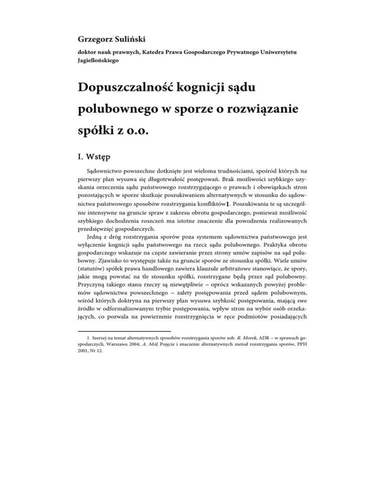Grzegorz Suliński doktor nauk prawnych, Katedra Prawa Gospodarczego Prywatnego Uniwersytetu Jagiellońskiego Dopuszczalność kognicji sądu polubownego w sporze o rozwiązanie spółki z o.o. I. Wstę Wstęp Sądownictwo powszechne dotknięte jest wieloma trudnościami, spośród których na pierwszy plan wysuwa się długotrwałość postępowań. Brak możliwości szybkiego uzyskania orzeczenia sądu państwowego rozstrzygającego o prawach i obowiązkach stron pozostających w sporze skutkuje poszukiwaniem alternatywnych w stosunku do sądownictwa państwowego sposobów rozstrzygania konfliktów1. Poszukiwania te są szczególnie intensywne na gruncie spraw z zakresu obrotu gospodarczego, ponieważ możliwość szybkiego dochodzenia roszczeń ma istotne znaczenie dla powodzenia realizowanych przedsięwzięć gospodarczych. Jedną z dróg rozstrzygania sporów poza systemem sądownictwa państwowego jest wyłączenie kognicji sądu państwowego na rzecz sądu polubownego. Praktyka obrotu gospodarczego wskazuje na częste zawieranie przez strony umów zapisów na sąd polubowny. Zjawisko to występuje także na gruncie sporów ze stosunku spółki. Wiele umów (statutów) spółek prawa handlowego zawiera klauzule arbitrażowe stanowiące, że spory, jakie mogą powstać na tle stosunku spółki, rozstrzygane będą przez sąd polubowny. Przyczyną takiego stanu rzeczy są niewątpliwie --- oprócz wskazanych powyżej problemów sądownictwa powszechnego --- zalety postępowania przed sądem polubownym, wśród których doktryna na pierwszy plan wysuwa szybkość postępowania, mającą swe źródło w odformalizowanym trybie postępowania, wpływ stron na wybór osób orzekających, co pozwala na powierzenie rozstrzygnięcia w ręce podmiotów posiadających 1 Szerzej na temat alternatywnych sposobów rozstrzygania sporów zob. R. Morek, ADR --- w sprawach gospodarczych, Warszawa 2004; A. Mól, Pojęcie i znaczenie alternatywnych metod rozstrzygania sporów, PPH 2001, Nr 12. specjalistyczną wiedzę z dziedziny, której dotyczy spór, poufność postępowania, kontraktowy charakter czy też międzynarodową skuteczność orzeczenia2. Powstaje zatem pytanie, czy klauzule arbitrażowe zawierane w umowach (statutach) spółek handlowych spełniają zamierzone przez autorów funkcje, czyli czy umożliwiają szybkie i bezpieczne z punktu widzenia prawa uzyskanie orzeczenia rozstrzygającego o prawach i obowiązkach stron. Pamiętać bowiem należy, że --- stosownie do art. 1212 i n. KPC --- wyrok sądu polubownego lub ugoda przed nim zawarta podlegają uznaniu lub stwierdzeniu wykonalności przez sąd państwowy. Ewentualna odmowa zatwierdzenia orzeczenia sądu polubownego w toku postępowania przed sądem powszechnym niweczy korzyści zamierzone przez strony przy zawieraniu zapisu na sąd polubowny, a w szczególności znacznie wydłuża postępowanie. Odpowiedź na powyższe pytanie wymaga analizy poszczególnych typów sporów, jakie mogą powstać na tle stosunku spółki w kontekście możliwości rozpoznania ich przez sąd polubowny. Przedmiotem niniejszego opracowania jest analiza dopuszczalności poddania pod rozstrzygnięcie sądu polubownego sporu o rozwiązanie spółki z o.o. i odpowiedź na pytanie, czy aktualnie obowiązująca regulacja sądownictwa polubownego wychodzi naprzeciw zapotrzebowaniu na stworzenie alternatywnego wobec sądownictwa państwowego systemu rozstrzygania sporu tego typu. Odpowiedzi wymaga także pytanie, czy klauzule arbitrażowe zawierane w umowach spółek z o.o. nie wywierają skutku odwrotnego od zamierzonego, komplikując i utrudniając rozwiązywanie sporów powstałych na tle stosunku spółki, w tym w szczególności sporu o rozwiązanie spółki z o.o. II. Spór o rozwią rozwią zanie spół spółki z o.o. Stosownie do art. 271 ustawy z 15.9.2000 r. --- Kodeks spółek handlowych (Dz.U. Nr 94, poz. 1037 ze zm.) sąd może orzec o rozwiązaniu spółki z o.o. Podstawą takiego rozstrzygnięcia musi być ustalenie, że zaistniała niemożność osiągnięcia celu spółki lub zaszły inne ważne przyczyny wywołane stosunkami spółki. W doktrynie podkreśla się, że niemożność osiągnięcia celu spółki może mieć charakter obiektywny lub subiektywny3. Wśród przyczyn obiektywnych wymienia się uwarunkowania natury rynkowej, które nie pozwalają na realizację celu spółki czy też utratę koncesji na prowadzenie 2 Tak A. Szumański, Zapis na sąd polubowny w sprawie zaskarżania uchwały zgromadzenia spółki kapitałowej. Prawo w XXI wieku. Księga pamiątkowa 50-lecia Instytutu Nauk Prawnych Polskiej Akademii Nauk, praca zbiorowa, pod red. W. Czaplińskiego, Warszawa 2006; T. Ereciński, Arbitraż a sądownictwo państwowe, PUG 1994, Nr 2, s. 2; J. Rajski, Nowe wyzwania wobec sądów arbitrażowych, PPH 2001, Nr 2, s. 2. 3 Tak M. Rodzynkiewicz, Kodeks spółek handlowych. Komentarz, Warszawa 2005, s. 472; A. Szajkowski, M. Tarska [w:] S. Sołtysiński, A. Szajkowski, A. Szumański, J. Szwaja, Kodeks spółek handlowych. Tom II. Komentarz do artykułów 151---300, wyd. 2, Warszawa 2005, s. 851. działalności4. Przyczyny natury subiektywnej to głównie sytuacja konfliktu pomiędzy wspólnikami w warunkach zrównoważonej siły głosów, uniemożliwiającego prawidłowe funkcjonowanie spółki. Pojęcie innych ważnych przyczyn wywołanych stosunkami spółki zostało wyjaśnione przez Sąd Apelacyjny w Krakowie, który w wyroku z 10.9.1993 r. (I ACr 343/93)5 wskazał, że chodzić tu może o sytuację pozbawienia spółki możliwości prowadzenia działalności w wyniku trwałego konfliktu między wspólnikami o zrównoważonej liczbie głosów, a także o ciągłe pozbawianie wspólnika jego istotnych uprawnień przez innych wspólników dysponujących większością głosów. Podobny pogląd wypowiedział Sąd Najwyższy w wyroku z 22.4.1937 r. (C I 1868/36, Zb. Orz. 1938, poz. 163), podając, że „ważna przyczyna rozwiązan