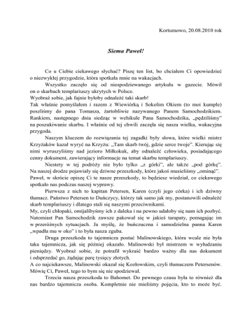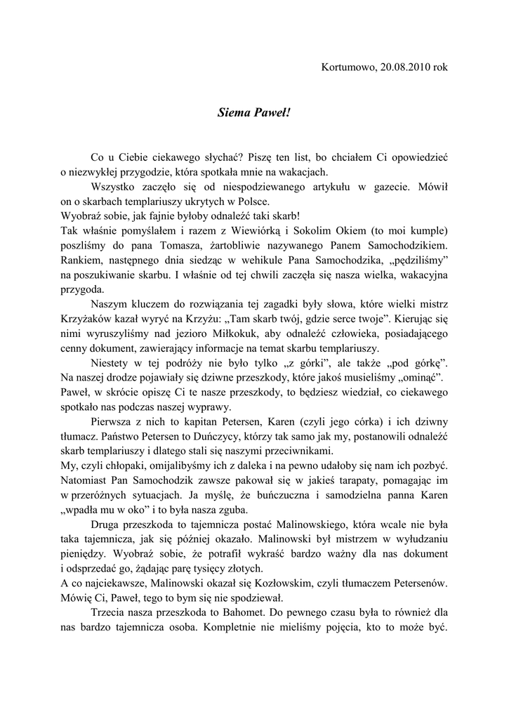 Kortumowo, 20.08.2010 rok Siema Paweł! Co u Ciebie ciekawego słychać? Piszę ten list, bo chciałem Ci opowiedzieć o niezwykłej przygodzie, która spotkała mnie na wakacjach. Wszystko zaczęło się od niespodziewanego artykułu w gazecie. Mówił on o skarbach templariuszy ukrytych w Polsce. Wyobraź sobie, jak fajnie byłoby odnaleźć taki skarb! Tak właśnie pomyślałem i razem z Wiewiórką i Sokolim Okiem (to moi kumple) poszliśmy do pana Tomasza, żartobliwie nazywanego Panem Samochodzikiem. Rankiem, następnego dnia siedząc w wehikule Pana Samochodzika, „pędziliśmy” na poszukiwanie skarbu. I właśnie od tej chwili zaczęła się nasza wielka, wakacyjna przygoda. Naszym kluczem do rozwiązania tej zagadki były słowa, które wielki mistrz Krzyżaków kazał wyryć na Krzyżu: „Tam skarb twój, gdzie serce twoje”. Kierując się nimi wyruszyliśmy nad jezioro Miłkokuk, aby odnaleźć człowieka, posiadającego cenny dokument, zawierający informacje na temat skarbu templariuszy. Niestety w tej podróży nie było tylko „z górki”, ale także „pod górkę”. Na naszej drodze pojawiały się dziwne przeszkody, które jakoś musieliśmy „ominąć”. Paweł, w skrócie opiszę Ci te nasze przeszkody, to będziesz wiedział, co ciekawego spotkało nas podczas naszej wyprawy. Pierwsza z nich to kapitan Petersen, Karen (czyli jego córka) i ich dziwny tłumacz. Państwo Petersen to Duńczycy, którzy tak samo jak my, postanowili odnaleźć skarb templariuszy i dlatego stali się naszymi przeciwnikami. My, czyli chłopaki, omijalibyśmy ich z daleka i na pewno udałoby się nam ich pozbyć. Natomiast Pan Samochodzik zawsze pakował się w jakieś tarapaty, pomagając im w przeróżnych sytuacjach. Ja myślę, że buńczuczna i samodzielna panna Karen „wpadła mu w oko” i to była nasza zguba. Druga przeszkoda to tajemnicza postać Malinowskiego, która wcale nie była taka tajemnicza, jak się później okazało. Malinowski był mistrzem w wyłudzaniu pieniędzy. Wyobraź sobie, że potrafił wykraść bardzo ważny dla nas dokument i odsprzedać go, żądając parę tysięcy złotych. A co najciekawsze, Malinowski okazał się Kozłowskim, czyli tłumaczem Petersenów. Mówię Ci, Paweł, tego to bym się nie spodziewał. Trzecia nasza przeszkoda to Bahomet. Do pewnego czasu była to również dla nas bardzo tajemnicza osoba. Kompletnie nie mieliśmy pojęcia, kto to może być. Bahomet pisał listy, w których żądał, aby Pan Samochodzik (a co za tym idzie, również i my) opuścił miasto i wyjechał. Dasz wiarę, jak moglibyśmy będąc prawie u celu naszej podróży, zrezygnować. Nikt z nas nawet o tym nie myślał, dlatego Bahomet chciał pozbyć się pana Tomasza w inny sposób. Podczas gdy zwiedzaliśmy zamek w Malborku Pan Samochodzik zatrzymał się trochę dłużej w celi, w której Krzyżacy uwięzili Kiejstuta – księcia litewskiego. Bahomet natychmiast wykorzystał sytuację i zamknął pana Tomasza w tej celi. Nie wiedzieliśmy, co zrobić, ale z pomocą przyszła nam Ewa – dziewczyna mieszkająca ze swoją mamą na zamku. Późną nocą odnaleźliśmy Pana Samochodzika i został szczęśliwie uwolniony. A Bahomet, czyli poszukiwacz skarbów, wraz ze swoja żoną w popłochu opuszczali Malbork. Natomiast czwarta i ostatnia przeszkoda spotkała nas w Kortumowie. Trafiliśmy tam, ponieważ mama Ewy wpadła na genialny pomysł. Myślała, myślała i wymyśliła, że „Serce Twoje” to po łacinie znaczy „cor tuum”. Idąc za tym tropem, zaczęła szukać miejscowości o podobnie brzmiącej nazwie. I to był strzał w dziesiątkę, bo znalazła właśnie Kortumowo. W tej małej wiosce sami templariusze przygotowali pułapkę dla niepożądanych osób, które przez przypadek mogły odnaleźć ich skarb. Templariusze budując studnię, w której potem ukryli skarb, zrobili dodatkowo jeden korytarz. Ten, kto wszedł do tego korytarza, już z niego nie wyszedł. Szczęście miał tylko Pan Samochodzik, którego przez przypadek uratowała z opresji panna Karen. O szczegółach tej przygody opowiem Ci, jak się spotkamy, bo musiałbym książkę napisać, a wiesz, że nie jestem w „tych sprawach” zbyt biegły. W każdym razie, mówię Ci, Paweł, to były chyba najciekawsze wakacje w moim życiu. Mam nadzieję, że Ciebie też spotkało coś wyjątkowego. Pogadamy w szkole. Do zobaczenia, Wilhelm Tell