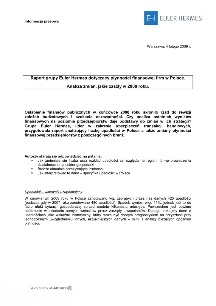 Informacja prasowa Warszawa, 4 lutego 2009 r. Raport grupy Euler Hermes dotyczący płynności finansowej firm w Polsce. Analiza zmian, jakie zaszły w 2008 roku. Osłabienie finansów publicznych w końcówce 2008 roku skłoniło rząd do rewizji założeń budżetowych i szukania oszczędności. Czy analiza ostatnich wyników finansowych na poziomie przedsiębiorstw daje podstawy do zmian w ich strategii? Grupa Euler Hermes, lider w zakresie ubezpieczeń transakcji handlowych, przygotowała raport analizujący liczbę upadłości w Polsce a także zmiany płynności finansowej przedsiębiorstw z poszczególnych branż. Autorzy starają się odpowiedzieć na pytania: Jak zmieniała się liczba oraz rozkład upadłości ze względu na region, formę prowadzenia działalności oraz sektor gospodarki Branże aktualnie przeżywające trudności Jak interpretować te dane – specyfika upadłości w Polsce Upadłości – wskaźnik uzupełniający W omawianym 2008 roku w Polsce zanotowano wg. zebranych przez nas danych 425 upadłości (podczas gdy w 2007 roku zanotowano 480 upadłości). Spadek wyniósł więc 11%, jednak jest to de facto efekt sytuacji gospodarczej sprzed średnio kilkunastu miesięcy. Powszechne jest bowiem opóźnienie w składaniu samych wniosków przez zarządy i wspólników. Dlatego traktujmy dane o upadłościach jako wskaźnik historyczny, który może być dobrym prognostykiem na przyszłość przy jednoczesnym uwzględnieniu innych, aktualniejszych danych – m.in. z analizy bieżących opóźnień płatności. Regiony – rozkład upadłości oraz bieżąca moralność płatnicza Upadłości w 2008 roku wg. województw 120 118 110 100 80 59 59 55 46 2007 2008 5 podlaskie małopolskie warmińsko mazurskie kujawsko pomorskie lubelskie zachodniopomorskie dolnośląskie mazowieckie 0 śląskie 20 23 22 19 19 19 15 14 12 1011 9 8 8 8 6 10 opolskie 24 20 20 świętokrzyskie 23 29 lubuskie 28 podkarpackie 27 łódzkie 40 pomorskie 36 33 wielkopolskie 60 W okresie 2008 roku najwięcej bankructw dotyczyło firm zarejestrowanych na terenie województw: mazowieckiego (110), śląskiego (59) oraz dolnośląskiego (55). Wśród województw, gdzie odnotowano najmniej upadłości, znajdują się: podlaskie (5) oraz opolskie (6). W porównaniu z analogicznym okresem ubiegłego roku spadkowa tendencja liczby upadłości dotyczyła większości województw. Wzrost upadłości odnotowano jedynie w województwie dolnośląskim – o 20%, oraz zachodniopomorskim o 9%. Ciekawa może być aktualna analiza średnich opóźnień płatności w poszczególnych województwach. Na jej podstawie można wysnuć wniosek, iż firmy z zachodu i północy kraju, żyjąc w stosunkowo większej symbiozie z gospodarką niemiecką, szybciej odczuły jej recesję. Odrębnym zupełnie przypadkiem jest Podkarpackie: niewątpliwe tak duże średnie opóźnienia w płatnościach może mieć związek z sytuacją na Ukrainie, gdzie od kilku miesięcy inwestorzy z Polski napotykają znaczne trudności, a duża ich część pochodzi właśnie z tego nadgranicznego województwa. Jest to także pokłosie wcześniej wprowadzonych ograniczeń w swobodnym przepływie towarów i w efekcie mniejszych obrotów polskich firm. Skupiając się na pozostałych województwach – można powiedzieć, że regiony najprężniejsze gospodarczo (np. Śląsk, Mazowsze, Wielkopolska) przedsiębiorstw notują także z reguły większe opóźnienia w regulowaniu zobowiązań niż te mniej rozwinięte. To w tych województwach jest największy odsetek eksporterów, a inwestycje realizuje się dzięki finansowaniu zewnętrznemu – w efekcie działające tam firmy najwcześniej ucierpiały wskutek recesji na rynkach zagranicznych jak i zastopowania akcji kredytowej. Upadają firmy większe, o czym świadczy forma prowadzenia działalności Wśród firm, które ogłosiły upadłość, podobnie jak w latach ubiegłych, najwięcej jest spółek z ograniczoną odpowiedzialnością (283 upadłości). Upadłości w 2008 roku w podziale na formy prawne przedsiębiorstw o państwowe spółka cywlna 2% 3% spółka akcyjna spółdzielnia 4% 1% spółka jawna 7% osoba fizyczna 16% spółka z o.o. 67% Nadal ta forma prowadzenia działalności dominuje w zestawieniu, jako najlepiej zabezpieczająca interesy właścicieli, odpowiadających jedynie do wysokości swoich wkładów. Novum w tym roku to obecność w zestawieniach w większym niż dotychczas procencie firm prowadzonych pod inna formą prawną: spółdzielni, spółek akcyjnych czy cywilnych. Jest to efekt rozwoju rynku w ostatnich kilku latach: większych transakcji realizowanych przez firmy większe niż dotychczas – wcześniej likwidowały działalność bez przeprowadzania procesu upadłości, ponieważ wiązało się to z kosztami i koniecznością posiadania majątku do zaspokojenia roszczeń. Branże zagrożone Upadłości w 2008 roku w podziale na branże Sprzedaż detaliczna 37 9% Inne 50 12% Produkcja 141 33% Budownictwo 71 17% Sprzedaż hurtowa 52 12% Usługi 74 17% Według danych zebranych przez Euler Hermes w 2008 roku najwięcej upadło firm produkcyjnych (33% wszystkich upadłości), na kolejnych miejscach znalazły się budownictwo (17%) oraz usługi (17%). Budownictwo i branże powiązane Wzrosła liczba upadłości w budownictwie – mieliśmy ich 71 wobec 53 rok wcześniej. Problem jest szerszy – łącznie z branżami współpracującymi i zaopatrującymi daje to nam 115 upadłości w sektorze budowlanym. Branża budowlana ma zawsze największe przeterminowania płatności, nawet w czasach prosperity. Wynika to m.in. z wielu szczebli procesu inwestycyjnego i pracy na otwartym koncie – długości procesów inwestycyjnych. Niepokojące jest jednak to, iż po kilku latach poprawy sytuacji płatniczej w całej branży ogólnobudowlanej, jak i w poszczególnych jej sektorach, gdy porównujemy wyniki z analogicznych miesięcy 2007 roku zauważymy symptomy wzrostu opó