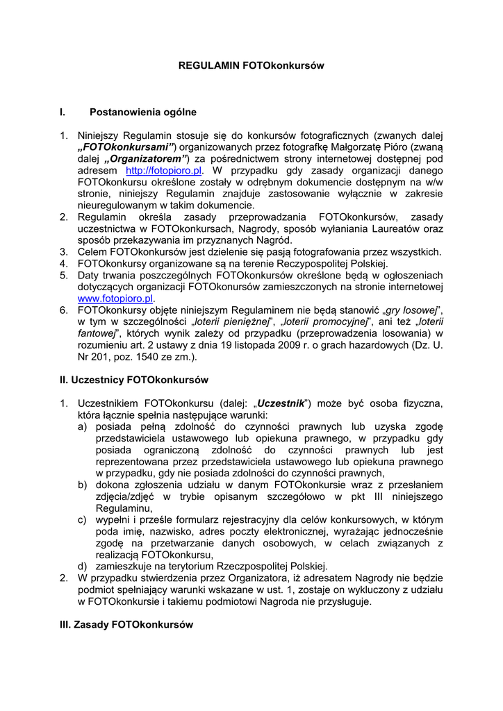 REGULAMIN FOTOkonkursów I. Postanowienia ogólne 1. Niniejszy Regulamin stosuje się do konkursów fotograficznych (zwanych dalej „FOTOkonkursami”) organizowanych przez fotografkę Małgorzatę Pióro (zwaną dalej „Organizatorem”) za pośrednictwem strony internetowej dostępnej pod adresem http://fotopioro.pl. W przypadku gdy zasady organizacji danego FOTOkonkursu określone zostały w odrębnym dokumencie dostępnym na w/w stronie, niniejszy Regulamin znajduje zastosowanie wyłącznie w zakresie nieuregulowanym w takim dokumencie. 2. Regulamin określa zasady przeprowadzania FOTOkonkursów, zasady uczestnictwa w FOTOkonkursach, Nagrody, sposób wyłaniania Laureatów oraz sposób przekazywania im przyznanych Nagród. 3. Celem FOTOkonkursów jest dzielenie się pasją fotografowania przez wszystkich. 4. FOTOkonkursy organizowane są na terenie Reczypospolitej Polskiej. 5. Daty trwania poszczególnych FOTOkonkursów określone będą w ogłoszeniach dotyczących organizacji FOTOkonursów zamieszczonych na stronie internetowej www.fotopioro.pl. 6. FOTOkonkursy objęte niniejszym Regulaminem nie będą stanowić „gry losowej”, w tym w szczególności „loterii pieniężnej”, „loterii promocyjnej”, ani też „loterii fantowej”, których wynik zależy od przypadku (przeprowadzenia losowania) w rozumieniu art. 2 ustawy z dnia 19 listopada 2009 r. o grach hazardowych (Dz. U. Nr 201, poz. 1540 ze zm.). II. Uczestnicy FOTOkonkursów 1. Uczestnikiem FOTOkonkursu (dalej: „Uczestnik”) może być osoba fizyczna, która łącznie spełnia następujące warunki: a) posiada pełną zdolność do czynności prawnych lub uzyska zgodę przedstawiciela ustawowego lub opiekuna prawnego, w przypadku gdy posiada ograniczoną zdolność do czynności prawnych lub jest reprezentowana przez przedstawiciela ustawowego lub opiekuna prawnego w przypadku, gdy nie posiada zdolności do czynności prawnych, b) dokona zgłoszenia udziału w danym FOTOkonkursie wraz z przesłaniem zdjęcia/zdjęć w trybie opisanym szczegółowo w pkt III niniejszego Regulaminu, c) wypełni i prześle formularz rejestracyjny dla celów konkursowych, w którym poda imię, nazwisko, adres poczty elektronicznej, wyrażając jednocześnie zgodę na przetwarzanie danych osobowych, w celach związanych z realizacją FOTOkonkursu, d) zamieszkuje na terytorium Rzeczpospolitej Polskiej. 2. W przypadku stwierdzenia przez Organizatora, iż adresatem Nagrody nie będzie podmiot spełniający warunki wskazane w ust. 1, zostaje on wykluczony z udziału w FOTOkonkursie i takiemu podmiotowi Nagroda nie przysługuje. III. Zasady FOTOkonkursów 1. Aby wziąć udział w FOTOkonkursie należy dokonać rejestracji na stronie internetowej http://fotopioro.pl i dokonać zgłoszenia co najmniej jednego zdjęcia fotograficznego. 2. Procedura rejestracji Uczestnika i zgłaszania zdjęć do FOTOkonkursu: a. Należy wejść na stronę główną http://fotopioro.pl i wybrać zakładkę: FOTOKONKURSY lub bezpośrednio wejść na stronę FOTOkonkursów: http://www.fotopioro.pl/?page_id=901. b. Należy wybrać FOTOkonkurs, w ramach którego Uczestnik chce dokonać zgłoszenia swoich zdjęć. c. Po dokonaniu wyboru FOTOkonkursu Uczestnik zostanie przekierowany na stronę internetową dedykowaną dla wybranego FOTOkonkursu. Należy wówczas wybrać przycisk: „PRZEŚLIJ”. d. Celem przesłania zdjęcia, należy podać: NAZWĘ ZDJĘCIA (1-4 słowa), IMIĘ oraz ADRES EMAIL a następnie załączyć zdjęcie zgłaszane na FOTOkonkurs dokonując jego wyboru z komputera. 3. Zadaniem uczestników FOTOkonkursów jest wykonanie zdjęcia w dowolnej technice fotograficznej, odpowiadającego tematyce konkursu. 4. Warunki techniczne zgłaszanych zdjęć: a. Format pliku zdjęcia: JPEG. b. Maksymalna szerokość zdjęcia (długi bok) nie może przekroczyć 1020 pikseli. c. Limit objętości zdjęcia wynosi do 1MB. W przypadku jego przekroczenia, Uczestnik zostanie o tym powiadomiony odpowiednim komunikatem. d. Jakość zdjęcia: 72 DPI. 5. Czas trwania konkursu jest określony. Zegar pokazuje ilość dni do zakończenia danego FOTOkonkursu. 6. Podanie danych wskazanych w ust. 2 lit. d i wysłanie pliku ze zdjęciem jest równoznaczne ze złożeniem przez Uczestnika oświadczenia o: a. akceptacji postanowień niniejszego Regulaminu i/lub ewentualnych odrębnych regulaminów dotyczących poszczególnych FOTOkonkursów, b. posiadaniu praw autorskich do prezentowanego zdjęcia oraz uzyskaniu zgody na publikację od osób znajdujących się na fotografii, c. udzieleniu Organizatorowi przez Uczestnika FOTOkonkursu nieodpłatnej licencji na bezterminową prezentację fotografii na stronach http://fotopioro.pl oraz na fanpage https://www.facebook.com/SztukaPatrzenia-Małgorzata-Pióro-1512063192440967, d. udzieleniu Organizatorowi przez Uczestnika FOTOkonkursu zgody na zapisanie jego danych do FOTO PIÓRO NEWSLETTER i otrzymywanie NEWSLETTERA. e. udzieleniu Organizatorowi zgody na nieodpłatną publikację w materiałach promocyjnych i marketingowych, wydawnictwach i stronach internetowych Organizatora w przypadku, gdy Uczestnik otrzyma Nagrodę lub wyróżnienie w ramach FOTOkonkursu. 7. Galeria konkursowa jest moderowana i Organizator nie ma obowiązku publikacji wszystkich zdjęć zgłoszonych w ramach FOTOkonkursu. 8. Organizator zastrzega sobie prawo publikacji w galerii konkursowej jedynie zdjęć zakwalifikowanych do FOTOkonkursu. 9. Organizator zastrzega sobie prawo do usunięcia zdjęć naruszających prawa osób trzecich, obscenicznych, pozbawionych walorów artystycznych, niezgodnych z tematem konkursu lub zawierających dodatkowe informacje widoczne w obrębie zdjęcia w tym datę, podpis lub link do strony internetowej. 10. W wypadku naruszenia praw autorskich, majątkowych, bądź związanych z ochroną wizerunku osób trzecich, uczestnik FOTOkonkursu ponosi całkowitą odpowiedzialność karną i finansową za popełniony czyn i zobowiązuje się 
