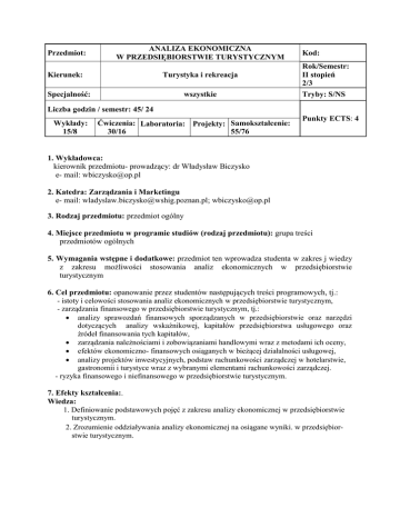 Przedmiot: ANALIZA EKONOMICZNA W PRZEDSIĘBIORSTWIE TURYSTYCZNYM Kierunek: Turystyka i rekreacja Specjalność: wszystkie Kod: Rok/Semestr: II stopień 2/3 Tryby: S/NS Liczba godzin / semestr: 45/ 24 Wykłady: 15/8 Ćwiczenia: Laboratoria: Projekty: Samokształcenie: 30/16 55/76 Punkty ECTS: 4 1. Wykładowca: kierownik przedmiotu- prowadzący: dr Władysław Biczysko e- mail: [email protected] 2. Katedra: Zarządzania i Marketingu e- mail: [email protected]; [email protected] 3. Rodzaj przedmiotu: przedmiot ogólny 4. Miejsce przedmiotu w programie studiów (rodzaj przedmiotu): grupa treści przedmiotów ogólnych 5. Wymagania wstępne i dodatkowe: przedmiot ten wprowadza studenta w zakres j wiedzy z zakresu możliwości stosowania analiz ekonomicznych w przedsiębiorstwie turystycznym 6. Cel przedmiotu: opanowanie przez studentów następujących treści programowych, tj.: - istoty i celowości stosowania analiz ekonomicznych w przedsiębiorstwie turystycznym, - zarządzania finansowego w przedsiębiorstwie turystycznym, tj.: analizy sprawozdań finansowych sporządzanych w przedsiębiorstwie oraz narzędzi dotyczących analizy wskaźnikowej, kapitałów przedsiębiorstwa usługowego oraz źródeł finansowania tych kapitałów, zarządzania należnościami i zobowiązaniami handlowymi wraz z metodami ich oceny, efektów ekonomiczno- finansowych osiąganych w bieżącej działalności usługowej, analizy projektów inwestycyjnych, podstaw rachunkowości zarządczej w hotelarstwie, gastronomii i turystyce wraz z wybranymi elementami rachunkowości zarządczej. - ryzyka finansowego i niefinansowego w przedsiębiorstwie turystycznym. 7. Efekty kształcenia:. Wiedza: 1. Definiowanie podstawowych pojęć z zakresu analizy ekonomicznej w przedsiębiorstwie turystycznym. 2. Zrozumienie oddziaływania analizy ekonomicznej na osiągane wyniki. w przedsiębiorstwie turystycznym. Umiejętności: 1. Dotyczące analizowania sytuacji gospodarczej przedsiębiorstwa turystycznego, stawiania pytań, dokonywania syntezy, wyciągania wniosków, krytycznej oceny, interpretacji danych statystycznych i wydarzeń gospodarczych, 2. Dotyczące podejmowania decyzji gospodarczych w oparciu o posiadany zakres informacji, wykorzystania metod badawczych, samokształcenia. Inne kompetencje (personalne i społeczne): 1. Wyrobienie zdolności do aktywnych postaw, przedsiębiorczości, samodzielności i krytycyzmu gospodarczego i niezależnego myślenia w przedsiębiorstwie turystycznym. 2. Uzmysłowienie studentom konieczności posiadania wiedzy z zakresu analiz ekonomicznych niezbędnych do zarządzania w przedsiębiorstwie turystycznym w warunkach istniejącej konkurencji rynkowej. 8. Metody dydaktyczne: Wykład, wykład z dyskusją, ćwiczenia, zajęcia praktyczne, seminarium- kolokwium zaliczeniowe. W ramach przedmiotu zwraca się będzie szczególną uwagę na wszelkie formy angażujące i aktywizujące studenta w proces dydaktyczny. W szczególności będą to prace w grupach otwartych bądź zamkniętych przy zastosowaniu zróżnicowanych danych wprowadzających a następnie będzie dokonywana prezentacja osiągniętych wyników wraz z ich oceną i wnioskowaniem. Praca projektowo- ćwiczeniowa realizowana będzie oddzielnie przez każdego studenta z uwzględnieniem zróżnicowanych danych wejściowych, która posiadać będzie element samodzielności, i podlegać będzie ocenie przez wykładowcę. 9. Forma i warunki zaliczenia przedmiotu, a także forma i warunki zaliczenia poszczególnych zajęć wchodzących w zakres danego przedmiotu: a) Student w trakcie semestru : zalicza treści przedmiotu w formie pisemnego/ ustnego kolokwium, złożonego z części teoretyczno- problemowo- praktycznej; zobowiązany jest do sporządzenia projektu z zakresu zastosowania rachunkowości zarządczej w hotelarstwie, gastronomii lub obsługi ruchu turystycznego; będzie oceniany w ramach ćwiczeń– prezentowanie dotychczas zdobytej wiedzy z przedmiotu oraz umiejętności praktycznych; b) Minimum ocen cząstkowych w semestrze ustala się na 3 oceny; c) Podstawą zaliczenia przedmiotu jest uzyskanie minimum oceny dostatecznej; d) Student, w przypadku nieobecności usprawiedliwionych (praktyki krajowe i zagraniczne), zobowiązany jest do zaliczenia pracy tematycznej- projektowej oraz zdania zaległego przedmiotu w ustalonym czasie i w uzgodnieniu z prowadzącym zajęcia. 10. Elementy składowe oceny końcowej: Projekt (ćwiczenie)– 50% Kolokwium pisemne/ ustne - 50% 11. Całkowity nakład pracy studenta potrzebny do osiągnięcia efektów w godzinach: Wykłady 15/8 Ćwiczenia 30/16 Czas na przygotowanie się do zajęć – 10/20 Czas na przygotowanie projektu – ćwiczenia – 20/25 Czas na przygotowanie się do kolokwium – 25/31 12. Treści merytoryczne przedmiotu: 1. Istota, funkcje i rodzaje analizy ekonomicznej 2. Istota i kierunki wykorzystania analizy techniczno-ekonomicznej 3. Analiza porównawcza i przyczynowa w badaniach ekonomicznych. 4. Analiza wstępna sprawozdań finansowych (bilans, rachunek zysków i strat, cash flow). 5. Analiza wskaźnikowa. 6. Metody oceny przedsięwzięć inwestycyjnych. 7. Podstawy ekonomicznej analizy rynku. 8.. Ryzyko działalności gospodarczej przedsiębiorstwa turystycznego. 9. Przedsiębiorczość i konkurencyjność w turystyce. 10. Studium przypadku „Rachunkowość zarządcza w hotelarstwie, gastronomii i obsłudze ruchu turystycznego”- projekt. 13. Wykaz literatury podstawowej i uzupełniającej, obowiązującej do zaliczenia przedmiotu „Analiza ekonomiczna w przedsiębiorstwie turystycznym”: Literatura podstawowa: 1. Biczysko W., Zarządzanie finansami w przedsiębiorstwie turystycznym, Wydawnictwo Naukowe PWN, Warszawa 2011. 2. Bednarczyk M. (red.), Przedsiębiorczość w turystyce. Zasady i praktyka, Wyd. CeDeWu, Warszawa, 2010. 3. Bednarski L., Analiza finansowa w przedsiębiorstwie, PWE, Warszawa 2007. 4. Hamrol M., Analiza finansowa przedsiębiorstwa- ujęcie sytua