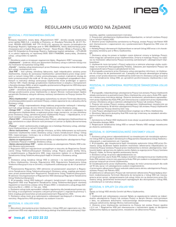 REGULAMIN USŁUG WIDEO NA ŻĄDANIE ROZDZIAŁ I. POSTANOWIENIA OGÓLNE §1 Niniejszy regulamin, zwany dalej „Regulaminem VOD”, określa zasady świadczenia przez spółkę INEA S.A. z siedzibą w Poznaniu, ul. Klaudyny Potockiej 25, 60-211 Poznań, REGON 630239680, NIP 779-10-02-618, wpisaną do rejestru przedsiębiorców Krajowego Rejestru Sądowego pod nr KRS 0000056936, której dokumentacja przechowywana jest w Sądzie Rejonowym Poznań – Nowe Miasto i Wilda w Poznaniu, Wydział VIII Gospodarczy Krajowego Rejestru Sądowego kapitał zakładowy – 679.600,00 zł, w całości wpłacony, nr rejestrowy GIOŚ: E0011196WZBW, zwaną dalej „Dostawcą usług”, usług wideo na żądanie. §2 1. Określenia użyte w niniejszym regulaminie (dalej „Regulamin VOD”) oznaczają: „Użytkownik” – podmiot, który jest abonentem Dostawcy usług w zakresie Usług oraz ma możliwość korzystaniaz Usług VOD; „Cennik” – katalog usług świadczonych przez Dostawcę usług wraz z charakterystyką tych usług i zestawieniem cen; „Kod PIN” – kod cyfrowy, określony fabrycznie, bądź indywidualnie ustalony przez Użytkownika, służący do autoryzacji Użytkownika i potwierdzania przez niego zamówień w ramach Usług VOD, a także uniemożliwiający osobom małoletnim dostęp do treści przeznaczonych dla osób od 18 roku życia; w szczególnych przypadkach określonych w instrukcji obsługi autoryzacja Użytkownika może przebiegać w oparciu o Numer IDK i Hasło dostępu przydzielone Użytkownikowi w związku z korzystaniem z Kanałów dostępu INEA; w takim wypadku postanowienia Regulaminu VOD dotyczące Kodu PIN stosuje się odpowiednio; „Limit” – określone przez Dostawcę usług kwotowe ograniczenie wartości Usług VOD, którego przekroczenie przez Użytkownika w danym Okresie rozliczeniowym będzie uprawniało Dostawcę usług do odmowy realizacji zamówienia na Pozycję (zestaw Pozycji); „Menu Użytkownika” – panel obsługowy wyświetlany na ekranie Terminala Abonenta, umożliwiającydokonywanie zamówień Pozycji, a także zapoznanie się z aktualną ofertą Dostawcy usług; „Usługi” – usługi rozprowadzania drogą kablową programów radiowych i telewizyjnych lub usługi dostępu do sieci Internet świadczone przez Dostawcę usług; „Usługa VOD” – usługa dodatkowa do Usług (tzw. wideo na żądanie), polegająca na udostępnieniu Użytkownikowi, w wybranym przez niego momencie, na czas określony przez Dostawcę usług, zamówionej przez Użytkownika Pozycji – indywidualnie, w ramach zestawu Pozycji lub w ramach Pakietu VOD; „Pakiet VOD” – okresowo aktualizowany zbiór Pozycji, udostępniany Użytkownikowi na jego zamówienie w całym Okresie rozliczeniowym w zamian za Opłatę abonamentową VOD; „Pozycja” – utwór audiowizualny znajdujący się w katalogu Dostawcy usług, udostępniany Użytkownikowi w ramach Usług VOD; „Okres rozliczeniowy” – okres jednego miesiąca, za który dokonywane są rozliczenia należności Użytkownika wobec Dostawcy usług z tytułu świadczonych Usług i Usług VOD, rozpoczynający i kończący się w dniach wskazanych przez Dostawcę usług na dokumencie rozliczeniowym; „Opłata za wypożyczenie” – jednorazowa opłata za indywidualne udostępnienie Pozycji (zestawu Pozycji) z katalogu Dostawcy usług; „Opłata abonamentowa VOD” – opłata okresowa za udostępnienie Pakietu VOD w danym Okresie rozliczeniowym; 2. Regulamin VOD jest regulaminem szczególnym w stosunku do Regulaminu Świadczenia Usług Telekomunikacyjnych Dostawcy usług. Pojęcia pisane wielką literą, a niezdefiniowane w Regulaminie VOD, mają znaczenie nadane im w Regulaminie Świadczenia Usług Telekomunikacyjnych bądź w Umowie z Dostawcą usług. §3 1. Dostawca usług świadczy Usługi VOD w zakresie i na warunkach określonych w Menu Użytkownika, Umowie, Regulaminie VOD, Regulaminie Świadczenia Usług Telekomunikacyjnych oraz w Cenniku, a Użytkownik zobowiązuje się do ich przestrzegani. 2. Postanowienia Regulaminu VOD odmienne od postanowień zawartych w Regulaminie Świadczenia Usług Telekomunikacyjnych Dostawcy usług, znajdują pierwszeństwo przed postanowieniami Regulaminu Świadczenia Usług Telekomunikacyjnych. W zakresie nieuregulowanym w Regulaminie VOD obowiązuje Regulamin Świadczenia Usług Telekomunikacyjnych. 3. W przypadku Usług VOD będących usługami świadczonymi drogą elektroniczną, Regulamin VOD oraz Regulamin Świadczenia Usług Telekomunikacyjnych stanowią regulamin w rozumieniu ustawy z dnia 18 lipca 2002 r. o świadczeniu usług drogą elektroniczną (Dz.U. z 2002r. nr 144, poz. 1204). 4. Dostawca usług może wprowadzić odrębne regulaminy dla świadczonych przez siebie Usług, w szczególności związane z akcjami promocyjnymi („regulaminy promocji”), które znajdują pierwszeństwo przed postanowieniami Regulaminu VOD. 5. Dostawca usług może przy wykonywaniu zobowiązań wynikających z Umowy abonenckiej i Regulaminu VOD posługiwać się osobami trzecimi. ROZDZIAŁ II. USŁUGI VOD §4 1. Warunkiem skorzystania przez Użytkownika z Usług VOD jest zapoznanie się z Regulaminem VOD oraz odpowiednią instrukcją obsługi oraz dokonanie autoryzacji Użyt- inea.pl 61 222 22 22 kownika, zgodnie z postanowieniami instrukcji. 2. Pozycja jest udostępniana Użytkownikowi indywidualnie, w ramach zestawu Pozycji lub w ramach Pakietu VOD. 3. Złożenie przez Użytkownika zamówienia na Pozycję, zestaw Pozycji lub Pakiet VOD jest równoznaczne z zapoznaniem się z postanowieniami Regulaminu VOD oraz ich akceptacją. 4. Katalog Pozycji oferowanych Użytkownikowi w ramach Usług VOD wraz z ich charakterystyką określony jest w Menu Użytkownika. §5 1. Dostawca usług ma prawo w każdym czasie dokonać zmiany w katalogu Pozycji, które mogą być zamawiane przez Użytkowników. Zmiana w katalogu Pozycji nie wpływa na możliwość odtworzenia Pozycji wcześniej zamówion