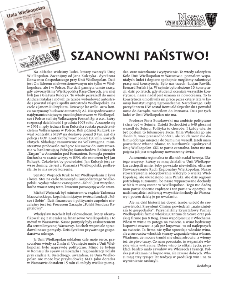 MIESI¢CZNIK RUCHU REGIONALNEGO WIELKOPOLAN na www. Y ¸ATN Z BEZP 1 MPLAR EGZE 05-634 15 ISSN 23 NR 2000 zieƒ Grud CHU IK RU ¢CZN MIESI ielko sza-w polsk a.pl SZANOWNI PA¡STWO! LAN OPO IELK OW LNEG ONA REGI dze, oraz mieszkanie i wy˝ywienie. To wtedy za∏o˝y∏em Ko∏o Unii Wielkopolan w Warszawie, pozna∏em wspania∏ych ludzi i dopiero spokojnie mogliÊmy zakoƒczyç prac´ nad konstytucjà. By∏o nas trzech: ¸ucjan Pawlik, Bernard Perlak i ja. W sejmie by∏o z∏o˝one 10 konstytucji, dziÊ po latach, gdy studenci oceniajà wszystkie konstytucje, nasza nadal jest uznana za nowoczesnà. To ta konstytucja umo˝liwi∏a mi prac´ przez cztery lata w komisji konstytucyjnej Zgromadzenia Narodowego. Gdy prezydentem UW zosta∏ Romuald Szperliƒski i powo∏a∏ mnie do Zarzàdu, wróci∏em do Poznania. DziÊ ju˝ tych ludzi w Unii Wielkopolan nie ma. Na ok∏adce widzimy ludzi, którzy tworzyli Uni´ Wielkopolan. Zacznijmy od Jana Kulczyka - dyrektora Konwentu Gospodarczego przy Unii Wielkopolan. DziÊ jest On liderem niekwestionowanym nie tylko w Wielkopolsce, ale i w Polsce. Kto dziÊ pami´ta tamte czasy, gdy utworzyliÊmy Wielkopolskà Kas´ Chorych, a w niej byli Jan i Gra˝yna Kulczyk. To wtedy przyszed∏ do mnie Andrzej Patalas i mówi∏, ˝e trzeba wybudowaç autostrad´ i powsta∏ zalà˝ek spó∏ki Autostrada Wielkopolska, na czele z Janem Kulczykiem. Dziewi´ç lat walki, a˝ w koƒcu zaczynamy budowaç autostrad´ A2. Niespodziewanie najdynamiczniejszym przedsi´biorstwem w Wielkopolsce i Polsce sta∏ si´ Volkswagen Poznaƒ Sp. z o.o., który rozpoczà∏ dzia∏alnoÊç 1 grudnia 1993 roku. A zacz´∏o si´ w 1991 r., gdy jedna z firm Kulczyka zosta∏a przedstawicielem Volkswagena w Polsce. Rok póêniej Kulczyk zawar∏ kontrakt z MSW na dostaw´ ponad 3 tys. aut dla policji i UOP. Kontrakt by∏ wart ponad 150 mln nowych z∏otych. Sk∏adajàc zamówienie na Volkswagena, ministerstwo próbowa∏o zach´ciç Niemców do inwestowania w bankrutujàcà Fabryk´ Samochodów Rolniczych „Tarpan” w Antoninku pod Poznaniem. Pomog∏a premier Suchocka w czasie wizyty w RFN. Ale motorem by∏ Jan Kulczyk. Cokolwiek by powiedzieç, Jan Kulczyk jest zawsze dumny, ˝e jest z Poznania i Wielkopolski, podkreÊla, ˝e tu ma swoje korzenie. Profesor Piotr Buczkowski ma ambicje polityczne i chce byç w Sejmie. Dzi´ki Suchockiej z 640 g∏osami wszed∏ do Sejmu. Polityka to choroba. I ka˝dy wie, ˝e byç pos∏em to luksusowe ˝ycie. Unia WolnoÊci go nie doceni∏a, wi´c przeszed∏ do SKL, ale SolidarnoÊç nie da∏a mu dobrego miejsca i do Sejmu nie wszed∏. Je˝eli mam powiedzieç w∏asne zdanie, to Buczkowski upolityczni∏ Uni´ Wielkopolan. SKL to partia centralna, która nie ma poj´cia jak jest urzàdzony nowoczesny Êwiat. Autonomia regionalna to dla nich nadal herezja. Dlatego wszyscy, którzy ze mnà dzia∏ali w Unii Wielkopolan zach´cili mnie, ˝eby powsta∏o niewielkie, elitarne Stowarzyszenie Ruch Regionalny Wielkopolan. Nasze stowarzyszenie zdecydowanie walczy∏o o wielkà Wielkopolsk´, ale ukradziono nam Pa∏uki. Ale dziÊ regiony potrzebujà autonomii, bo nasze wypracowane dochody w 60 % muszà zostaç w Wielkopolsce. Tego nie dadzà nam partie obecnie rzàdzàce i te˝ partie w opozycji, to nadal socjaliÊci, zabierajà wszystkie dochody do Warszawy i potem dzielà je po uwa˝aniu. Senator Wojciech Kruk to te˝ Wielkopolanin z krwi i koÊci. Stoi na czele Samorzàdu Gospodarczego Wielkopolski, wydaje w∏asne czasopismo „Echo”. Jest wsz´dzie, kocha wraz z ˝onà teatr, któremu poÊwi´cajà wiele czasu. Micha∏ Wojtczak by∏ ministrem w rzàdzie Tadeusza Mazowieckiego, kopalnia inicjatyw, twórca fundacji „Polsce i Sobie”. DziÊ finansowo i politycznie zupe∏nie niezale˝ny jest te˝ Prezesem Zarzàdu „Polski Fundusz Kapita∏owy”. Ale na dziÊ historii ju˝ dosyç, trzeba wróciç do rzeczywistoÊci. Prezydent Clinton powiedzia∏: „najwa˝niejsza to gospodarka”. PrzyznaliÊmy Kryszta∏owy Puchar Wielkopolski firmie w∏oskiej Cantina de Soave oraz polskiej firmie Jan & Berg, która wspó∏pracuje z W∏ochami. W∏osi w winie to pot´ga na Êwiecie, a wino b´dziemy kupowaç zawsze, a jak ju˝ kupowaç, to od najlepszych na Êwiecie. Ta firma nie tylko sprzedaje w∏oskie wina, ale z surowców w∏oskich tworzy wspania∏e wina w∏asne. Wiadomo, ˝e mocne trunki nie s∏u˝à zdrowiu, a wiemy te˝, ˝e piwo tuczy. Co nam pozosta∏o, to wspania∏e w∏oskie wina wytrawne. Dobre wino to eliksir ˝ycia, przyk∏ad: bardzo ma∏o zawa∏ów we W∏oszech i Francji. Polska jest skazana na kupno win, ale zawsze dobrych. W∏osi majà trzy tysiàce lat tradycji w produkcji win i na to wyró˝nienie zas∏u˝yli. Redakcja W∏adys∏aw Reichelt by∏ cz∏owiekiem, który identyfikowa∏ si´ z niezale˝nà finansowo Wielkopolskà i to mówi∏ w Warszawie. Nasze pomys∏y by∏y zaskoczeniem dla centralistycznej Warszawy. Reichelt wspaniale sprzedawa∏ nasze pomys∏y. DziÊ dyrektor prywatnego gospodarstwa rolnego. Ja Unii Wielkopolan odda∏em ca∏e moje serce, pracowa∏em wtedy za 2 mln z∏. Usuni´cie mnie z Unii Wielkopolan by∏o naprawd´ polityczne. Mimo ˝e by∏em w Komisji do spraw samorzàdu i regionalizacji Polski przy rzàdzie K. Bieleckiego, uwa˝a∏em, ˝e Unia Wielkopolan nie mo˝e byç przybudówkà KLD. Jako doradca w Warszawie dosta∏em 15 mln z∏, to by∏y wielkie pienià- 1 W numerze Polska regionalna . . . . . . . . . . . . . . . . . . . . . . . . . . . . . . . . . . . . . . . . . . . . . . . . . . . . . . . . . . . . . . . . . . . . . . . . . . . . . . . . . . . . . . . . . . . . . . 3 Unia Wielkopolan - fenomen organizacji regionalnej . . . . . . . . . . . . . . . . . . . . . . . . . . . . . . . . . . . . . . . . . . . . . . . . . 4 Konstytucja Unii Wielkopolan ............................................................................. 7 Reichelta walka z wiatrakami . . . . . . . . .