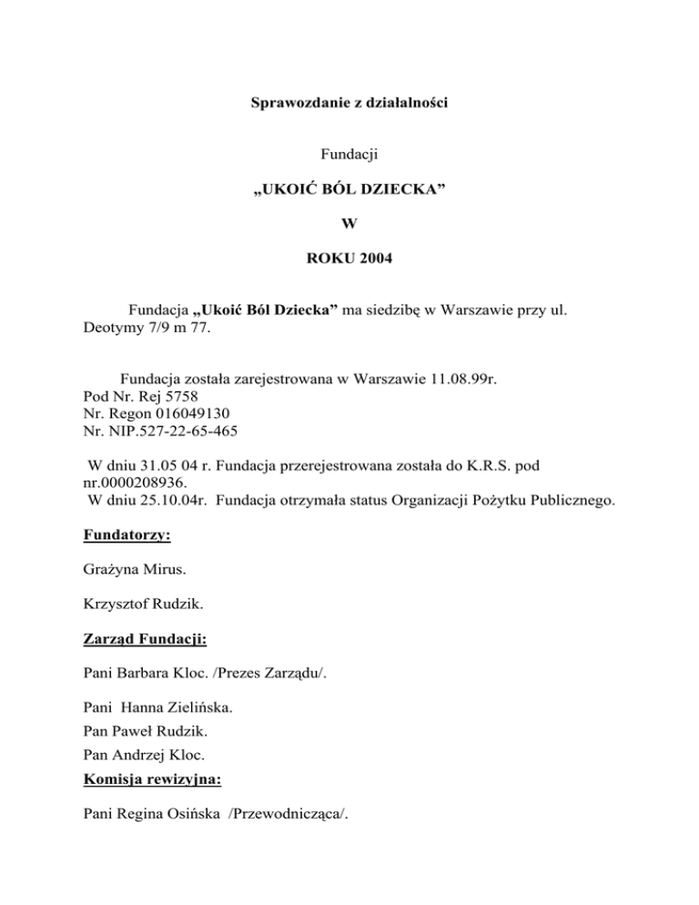 Sprawozdanie z działalności Fundacji „UKOIĆ BÓL DZIECKA” W ROKU 2004 Fundacja „Ukoić Ból Dziecka” ma siedzibę w Warszawie przy ul. Deotymy 7/9 m 77. Fundacja została zarejestrowana w Warszawie 11.08.99r. Pod Nr. Rej 5758 Nr. Regon 016049130 Nr. NIP.527-22-65-465 W dniu 31.05 04 r. Fundacja przerejestrowana została do K.R.S. pod nr.0000208936. W dniu 25.10.04r. Fundacja otrzymała status Organizacji Pożytku Publicznego. Fundatorzy: Grażyna Mirus. Krzysztof Rudzik. Zarząd Fundacji: Pani Barbara Kloc. /Prezes Zarządu/. Pani Hanna Zielińska. Pan Paweł Rudzik. Pan Andrzej Kloc. Komisja rewizyjna: Pani Regina Osińska /Przewodnicząca/. Pani Hanna Sutowicz Pani Elżbieta Talarek Historia Fundacji „Ukoić Ból Dziecka” Przez wiele lat prywatnie pomagaliśmy dzieciom biednym z najbliższego otoczenia. Z własnych funduszy kupowaliśmy: żywność, książki, odzież. Po wnikliwym zapoznaniu się z ciężką sytuacją wielu rodzin, podjęliśmy decyzję o założeniu Fundacji i udzielaniu pomocy najbardziej potrzebującym. W 1999 r Fundacja została powołana i zarejestrowana , a od 25. X. 2004 otrzymaliśmy status Organizacji Pożytku Publicznego. Od początku powstania Fundacji, która była efektem współpracy kilku osób staramy się zapoznawać z problemami osób, którym pomagamy. Powołując Fundację nie chcieliśmy aby powstało kolejne biuro, do którego przychodzą interesanci. Chcieliśmy aby osoby, które zgłaszają się do nas o pomoc miały komfort psychiczny, aby czuły ciepło i troskę z jaką się do Nich odnosimy. Pomagamy wielu osobom, które zgłaszają się do nas ze swoimi kłopotami, troskami, prośbami. Nigdy jednak nie zapominamy o dzieciach, dla nich właśnie realizujemy długofalowe programy integracyjne. Wiemy, że bezinteresowna pomoc drugiemu człowiekowi jest ponadczasowa. Misja Fundacji „Ukoić Ból Dziecka” Fundacja „Ukoić Ból Dziecka” jest organizacją pozarządową non-profit o statusie Pożytku Publicznego, nie prowadzi działalności gospodarczej. Fundacja powstała między innymi celem ratowania życia ludzkiego, niesieniem pomocy biednym, chorym dzieciom z rodzin patologicznych, niepełnych, rozbitych, pokrzywdzonych przez los, ich rodzinom i opiekunom. Działalność Fundacji „Ukoić Ból Dziecka” opiera się na udzielaniu wszelkiej pomocy najbardziej potrzebującym. Na realizacji programów długofalowych. Organizowanie imprez okolicznościowych dla dzieci: śniadania wielkanocne, Międzynarodowy Dzień Dziecka, kolacje wigilijne, podręczniki dla każdego dziecka, ciepła odzież, środki czystości i higieny, obuwie, zakup żywności, zakup sprzętu do rehabilitacji, zbiórkę krwi, wsparcie finansowe, zakup sprzętu ratującego życie. Pisze do Was matka Ani Gregorczyk. Trudno w kilku zdaniach napisać to co czuje. Chciałabym abyście Państwo wiedzieli, że dar waszego serca i wielki wasz wysiłek w zbiórce pieniędzy, które przekazaliście na konto mojej córki, pomogły w zakupie pompy insulinowej niezbędnej do dalszego życia mojej córki. Dzięki temu urządzeniu Ania będzie mogła funkcjonować prawie jak zdrowe dziecko. Jesteście dla mnie państwo jak Ci „ zwyczajni – niezwyczajni” Tak rzadko spotyka się bezinteresowną pomoc, z czymś co nie przynosi zysku, z sympatią, z szacunkiem i miłością. Tego wszystkiego doświadczyłam od Was. Naszym podstawowym celem jest bezpośrednia pomoc dzieciom i rodzinom indywidualnym oraz docieranie do osób, które pomocy najbardziej potrzebują, nie tylko w Kraju ale także poza jego granicami. Podstawowym celem jaki przyjęto w Fundacji „Ukoić Ból Dziecka”, jest niesienie pomocy najsłabszym – dzieciom i rodzinom, które nie radzą sobie w obecnych, ciężkich warunkach bytowo-socjalnych, materialnych oraz z powodu ich choroby. Misja Fundacji Misją Fundacji jest pomoc ludziom z kręgu biedy i ubóstwa, aby ulżyć w cierpieniu dzieciom biednym i niepełnosprawnym. Pomóc rodzinom, aby w skutek biedy, w której się znaleźli nie weszli w konflikt z prawem. Patrząc na głodne dzieci, matka zdolna jest zrobić najgorszą „głupotę”. W miarę pozyskanych środków finansowych udzielamy pomocy finansowej na zakup lekarstw, żywności oraz udzielamy wsparcia rzeczowego w postaci środków higieny i czystości, odzieży, obuwia, podręczników szkolnych, art. gospodarstwa domowego. Ratowanie życia poprzez pomoc w zakupie sprzętu do rehabilitacji, sprzętu do ratowania życia , zbiórkę krwi, która jest bezcennym darem życia. Nie potrzeba nikogo namawiać na ten gest ludzkiej solidarności, by dać tak niewiele, a tak wiele dać- życie. Chcemy pokonać barierę wstydu, strachu przed „chorymi inaczej”. Pokazać zdrowym dzieciom, że choroba i niepełnosprawność może być tolerowana w środowisku dzieci zdrowych i przekonać ich aby nie patrzeli na nich jak na trędowatych. Powoli udaje nam się przełamać tę barierę lęku i obrzydzenia wobec tych dzieci, których tak dotkliwie i okrutne doświadczył los. Żyją tak krótko na świeci, a niejeden z nich ma większe problemy niż dorosły. Fundacji udało się w niewielkim stopniu zrobić to, co dla niektórych jest niewykonalne. Mamy jeszcze wielki nieodparty cel pokonać wszystkie bariery, które do dziś jeszcze istnieją. Niektórzy nie chcą tego problemu widzieć i uważają, że problem ten już nie istnieje . Realizujemy, również programy długofalowe takie jak: Program: „Zajączek” - organizowanie integracyjnych śniadań wielkanocnych dla dzieci ich rodziców i opiekunów. Program: „Dzień dziecka”- organizowanie integracyjnych imprez z okazji Międzynarodowego Dnia Dziecka. Program: „Mikołaj” organizowanie integracyjnych kolacji wigilijnych dla dzieci i ich rodziców, opiekunów Program: „Podręcznik dla każdego dziecka” Program: „Pomoc” Celami statutowymi Fundacji są: 1. Niesienie pomocy dzieciom niepełnosprawnym i chorym. 2. Udzielenie po