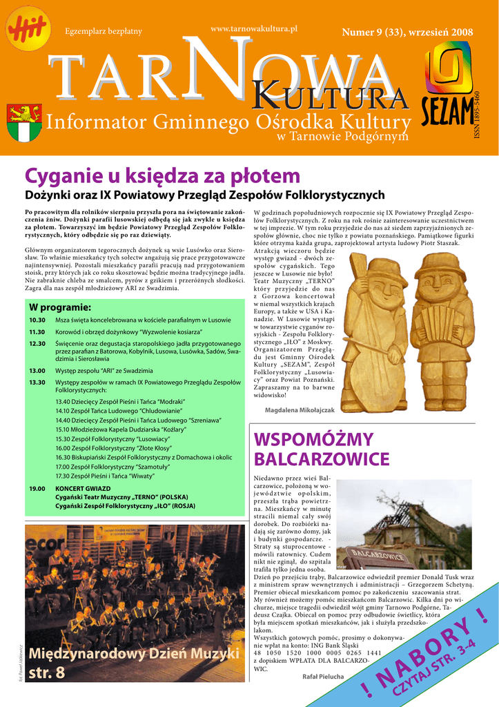 www.tarnowakultura.pl Numer 9 (33), wrzesień 2008 ISSN 1895-5460 Egzemplarz bezpłatny Informator Gminnego Ośrodka Kultury w Tarnowie Podgórnym Cyganie u księdza za płotem Dożynki oraz IX Powiatowy Przegląd Zespołów Folklorystycznych Po pracowitym dla rolników sierpniu przyszła pora na świętowanie zakończenia żniw. Dożynki parafii lusowskiej odbędą się jak zwykle u księdza za płotem. Towarzyszyć im będzie Powiatowy Przegląd Zespołów Folklorystycznych, który odbędzie się po raz dziewiąty. Głównym organizatorem tegorocznych dożynek są wsie Lusówko oraz Sierosław. To właśnie mieszkańcy tych sołectw angażują się prace przygotowawcze najintensywniej. Pozostali mieszkańcy parafii pracują nad przygotowaniem stoisk, przy których jak co roku skosztować będzie można tradycyjnego jadła. Nie zabraknie chleba ze smalcem, pyrów z gzikiem i przeróżnych słodkości. Zagra dla nas zespół młodzieżowy ARI ze Swadzimia. W programie: 10.30Msza święta koncelebrowana w kościele parafialnym w Lusowie 11.30 Korowód i obrzęd dożynkowy “Wyzwolenie kosiarza” 12.30Święcenie oraz degustacja staropolskiego jadła przygotowanego przez parafian z Batorowa, Kobylnik, Lusowa, Lusówka, Sadów, Swadzimia i Sierosławia 13.00 Występ zespołu “ARI” ze Swadzimia fot. Paweł Jaśkiewicz 13.30 Występy zespołów w ramach IX Powiatowego Przeglądu Zespołów Folklorystycznych: 13.40 Dziecięcy Zespół Pieśni i Tańca “Modraki” 14.10 Zespół Tańca Ludowego “Chludowianie” 14.40 Dziecięcy Zespół Pieśni i Tańca Ludowego “Szreniawa” 15.10 Młodzieżowa Kapela Dudziarska “Koźlary” 15.30 Zespół Folklorystyczny “Lusowiacy” 16.00 Zespół Folklorystyczny “Złote Kłosy” 16.30 Biskupiański Zespół Folklorystyczny z Domachowa i okolic 17.00 Zespół Folklorystyczny “Szamotuły” 17.30 Zespół Pieśni i Tańca “Wiwaty” 19.00 KONCERT GWIAZD Cygański Teatr Muzyczny „TERNO” (POLSKA) Cygański Zespół Folklorystyczny „IŁO” (ROSJA) Międzynarodowy Dzień Muzyki str. 8 W godzinach popołudniowych rozpocznie się IX Powiatowy Przegląd Zespołów Folklorystycznych. Z roku na rok rośnie zainteresowanie uczestnictwem w tej imprezie. W tym roku przyjedzie do nas aż siedem zaprzyjaźnionych zespołów głównie, choc nie tylko z powiatu poznańskiego. Pamiątkowe figurki które otrzyma każda grupa, zaprojektował artysta ludowy Piotr Staszak. Atrakcją wieczoru będzie występ gwiazd - dwóch zespołów cygańskich. Tego jeszcze w Lusowie nie było! Teatr Muzyczny „TERNO” któr y przyjedzie do nas z G orzowa koncer tował w niemal wszystkich krajach Europy, a także w USA i Kanadzie. W Lusowie wystąpi w towarzystwie cyganów rosyjskich - Zespołu Folklorystycznego „IŁO” z Moskwy. O rg an i z at ore m Pr z e g l ą du jest Gminny Ośrodek Kultury „SEZAM”, Zespół Folklorystyczny „Lusowiacy” oraz Powiat Poznański. Zapraszamy na to barwne widowisko! Magdalena Mikołajczak WSPOMÓŻMY BALCARZOWICE Niedawno przez wieś Balcarzowice, położoną w województwie opolskim, przeszła trąba powietrzna. Mieszkańcy w minutę stracili niemal cały swój dorobek. Do rozbiórki nadają się zarówno domy, jak i budynki gospodarcze. Straty są stuprocentowe mówili ratownicy. Cudem nikt nie zginął, do szpitala trafiła tylko jedna osoba. Dzień po przejściu trąby, Balcarzowice odwiedził premier Donald Tusk wraz z ministrem spraw wewnętrznych i administracji – Grzegorzem Schetyną. Premier obiecał mieszkańcom pomoc po zakończeniu szacowania strat. My również możemy pomóc mieszkańcom Balcarzowic. Kilka dni po wichurze, miejsce tragedii odwiedził wójt gminy Tarnowo Podgórne, Tadeusz Czajka. Obiecał on pomoc przy odbudowie świetlicy, która była miejscem spotkań mieszkańców, jak i służyła przedszkolakom. Wszystkich gotowych pomóc, prosimy o dokonywanie wpłat na konto: ING Bank Śląski 48 1050 1520 1000 0005 0265 1441 z dopiskiem WPŁATA DLA BALCARZOWIC. Rafał Pielucha Y4 R O 3- R. B T A JS TA Y N ! CZ ! 2 TARNOWA KULTURA • WRZESIEŃ 2008 Na progu wiele atrakcji GOK „Sezam” zaprasza Minione lata doprowadziły do wypracowania określonego, dobrze sprawdzonego w praktyce, modelu jego działalności. Jednakowoż, jak uczy stare porzekadło, „nigdy nie jest tak dobrze, aby nie mogło być lepiej”, zatem i GOK wychodzi z nowymi propozycjami. Serdecznie zapraszam dzieci z Tarnowa Podgórnego do włączenia się w projekt „Teatr w każdej wiosce”. Czas, by gospodarze finałów byli także na nich reprezentowani. Tutejszą grupę prowadzić będzie bardzo doświadczona instruktorka, Teresa Mańczak-Ciuksza. Najmłodszym kandydatom do orkiestry - w wieku 8-10 lat - proponuję pierwszą przygodę z muzyką: zespół instrumentalny f letów prostych. Adepci poznają w nim nuty, technikę oddychania oraz nauczą się muzykowania w zespole. Zajęcia te prowadzić będzie instruktor muzyczny Krzysztof Zaremba. Kolejna muzyczna propozycja to nauka gry na akordeonie, zyskującym w ostatnich latach wielką i zasłużoną popularność. Chętne dzieci i ich rodziców proszę o kontakt. Zmieniają się nieco zasady naboru do Studia Piosenki. Miejsce w nim znajdą wyłącznie najlepsi, wyłonieni w drodze eliminacji, adepci piosenkarstwa i sztuki estradowej. Na nowych, młodych kandydatów, czekają także wszystkie pozostałe działające u nas zespoły artystyczne. Pragnę w tym miejscu zwrócić szczególną uwagę na nasz chór - Koło Śpiewu im. F. Nowowiejskiego. Ten znakomity, o kilkudziesięcioletniej tradycji, bardzo sprawnie zarządzany i kierowany zespół pilnie potrzebuje nowych śpiewaków. Warto spróbować, gdyż śpiew zespołowy daje szczególne zadowolenie i satysfakcję, a chór jest reprezentantem naszej gminy także daleko poza jej granicami. Tegorocznym novum będzie wdrożenie kalendarza galowych występów największych zespołów artystycznych naszej gminy . I tak o